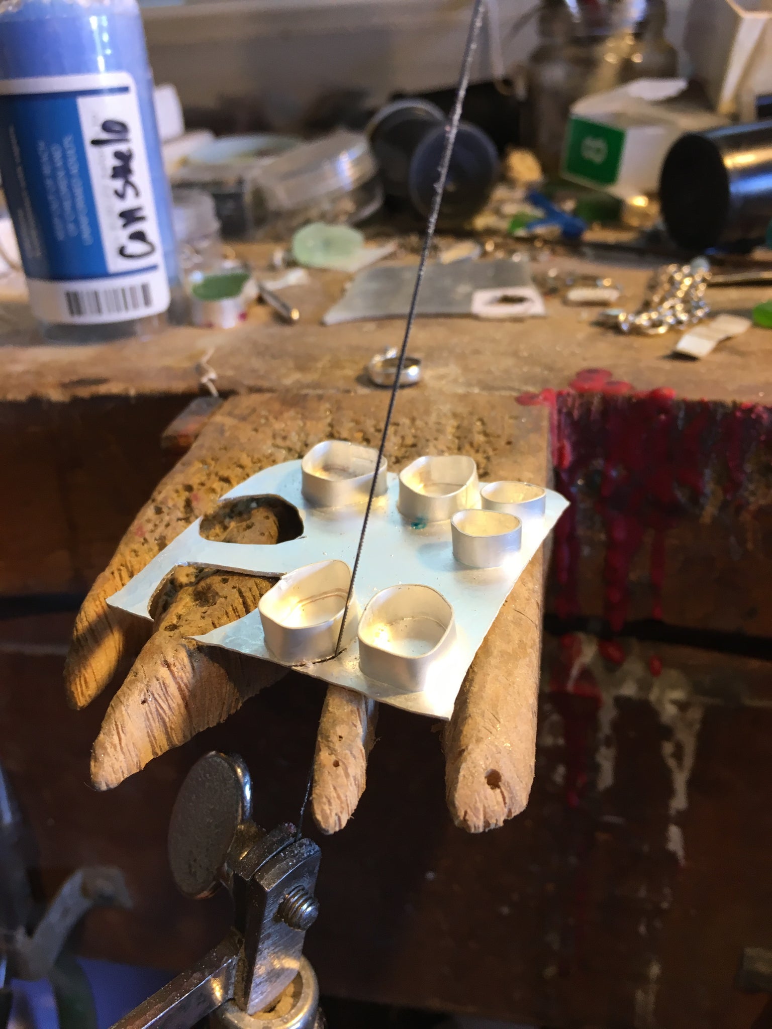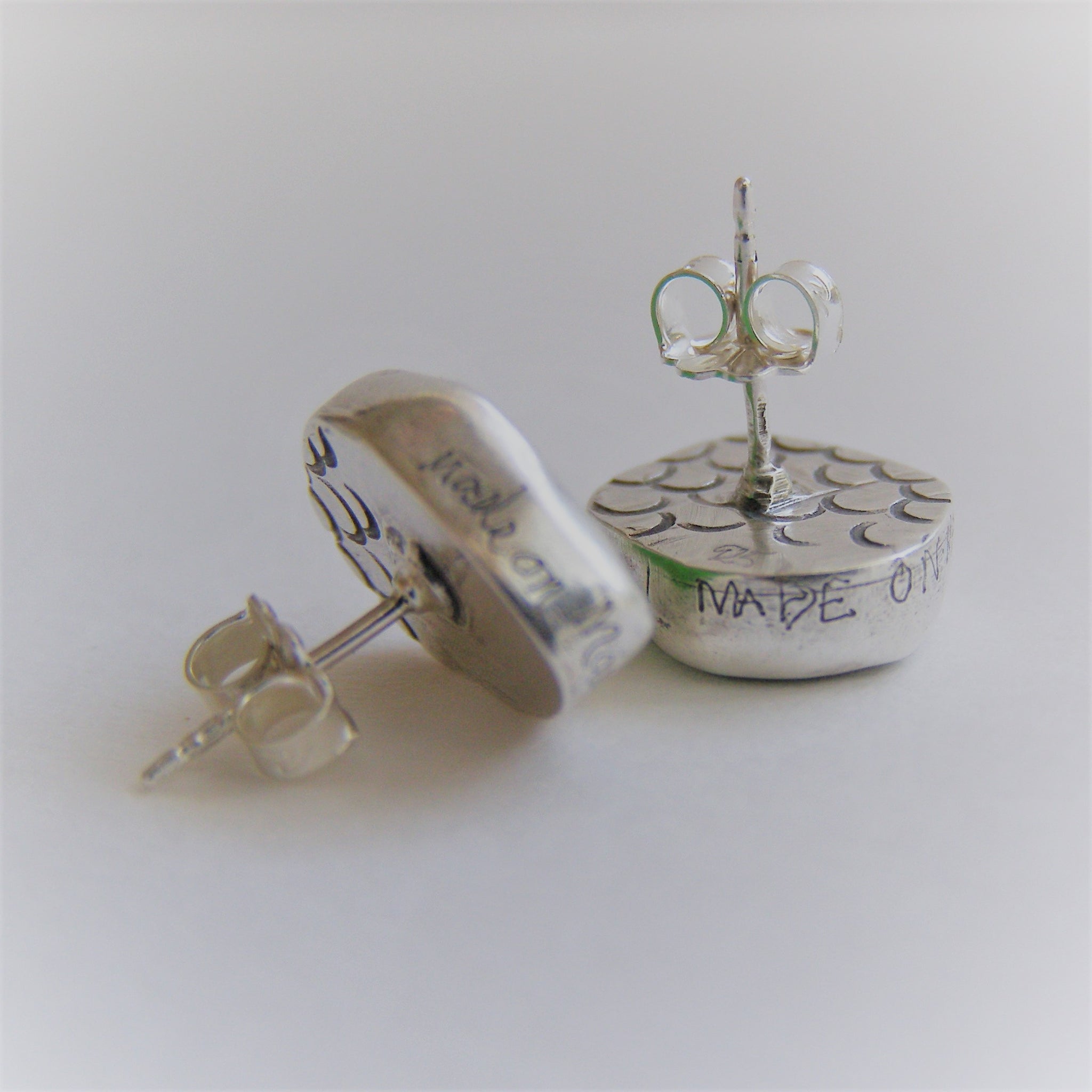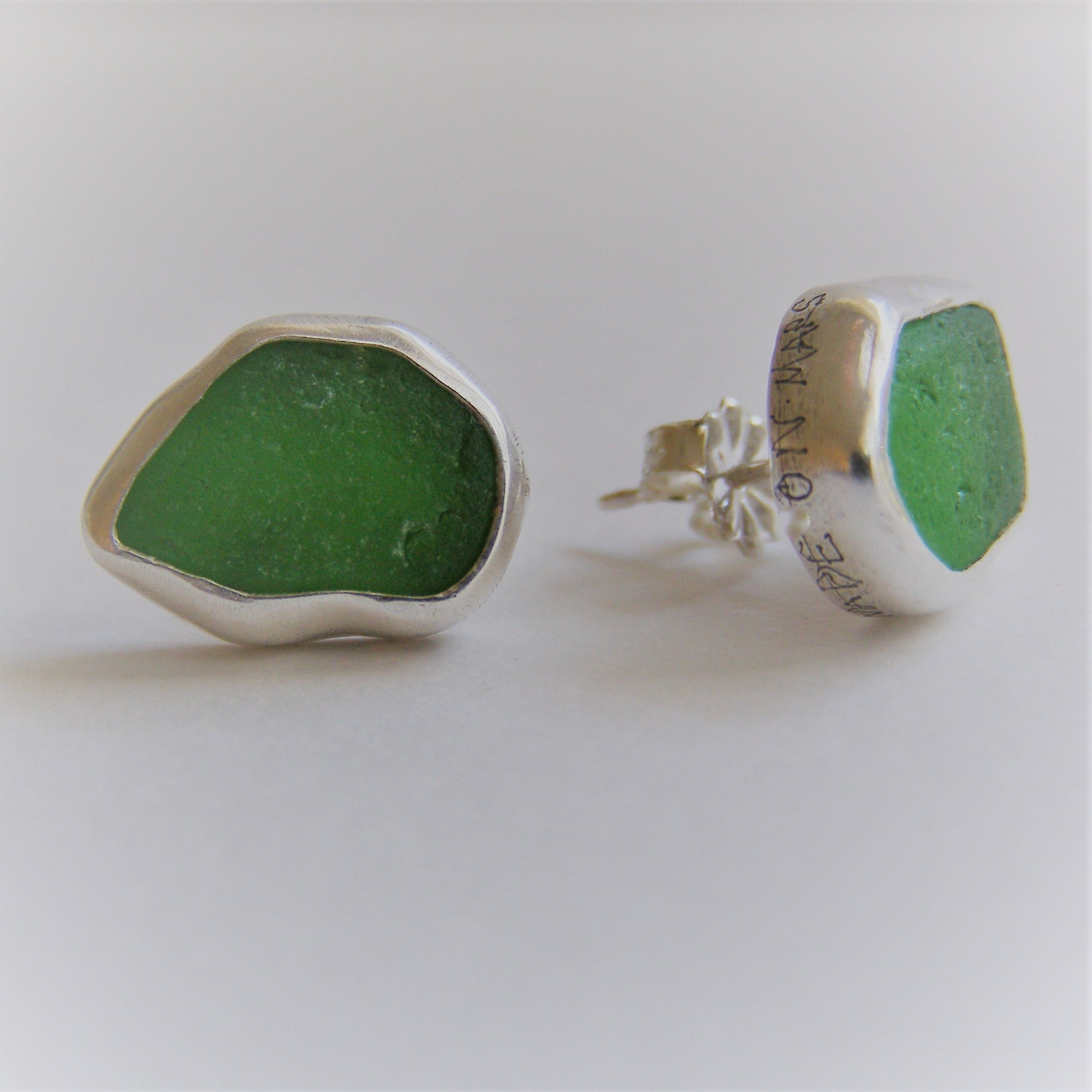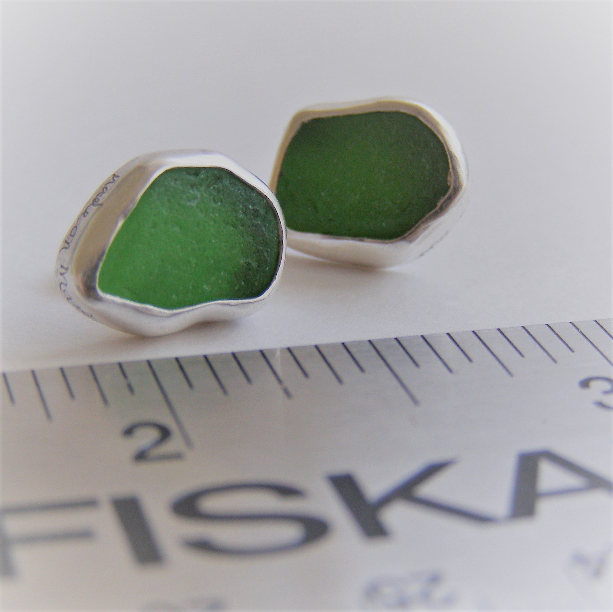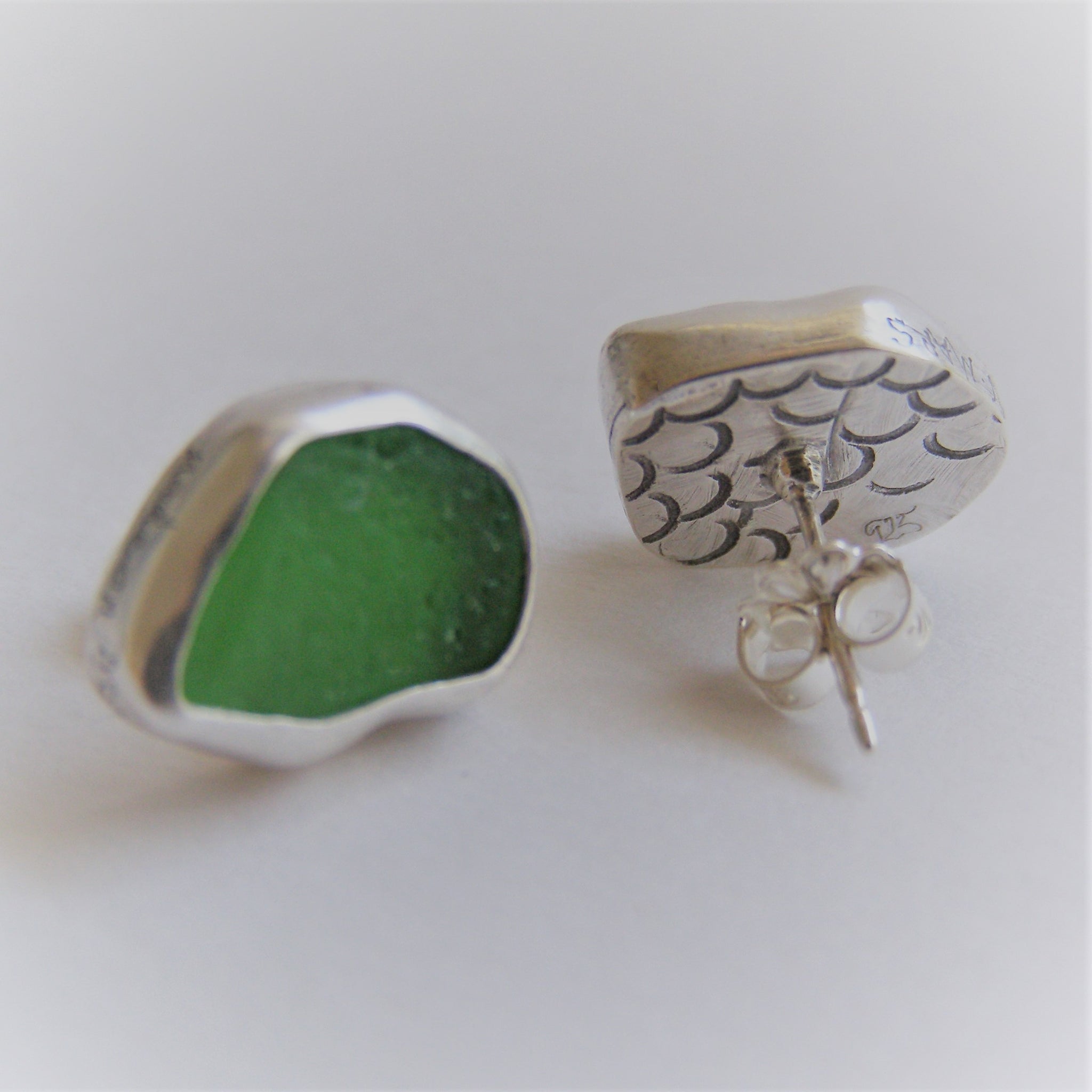 Straight from the beach into your earlobes, these emerald green sea glass studs do not perfectly match, but definitely belong together. Set in silver, these up-cycled shards of glass have been smoothed over and polished to frosted perfection by the ocean, grit of sand and time. Inspired to make these for my niece Zoe, I decided to make 3 pairs. Each earring has my signature fish scale hammered texture on the backside and "MAde On MArs" engraved into the handmade fine silver bezel.