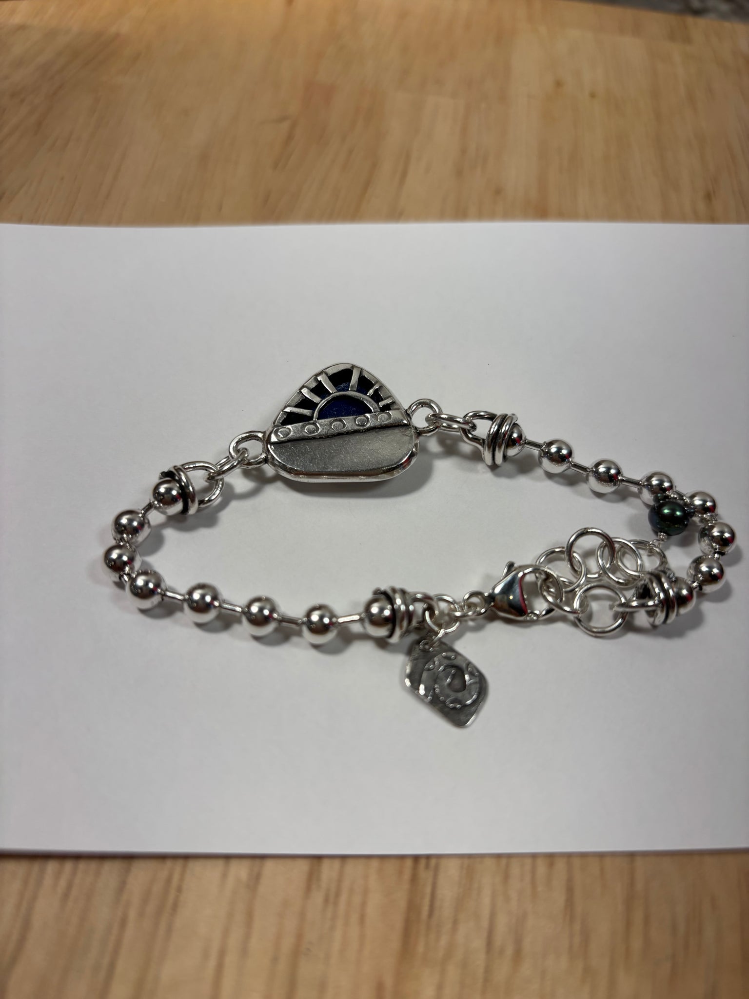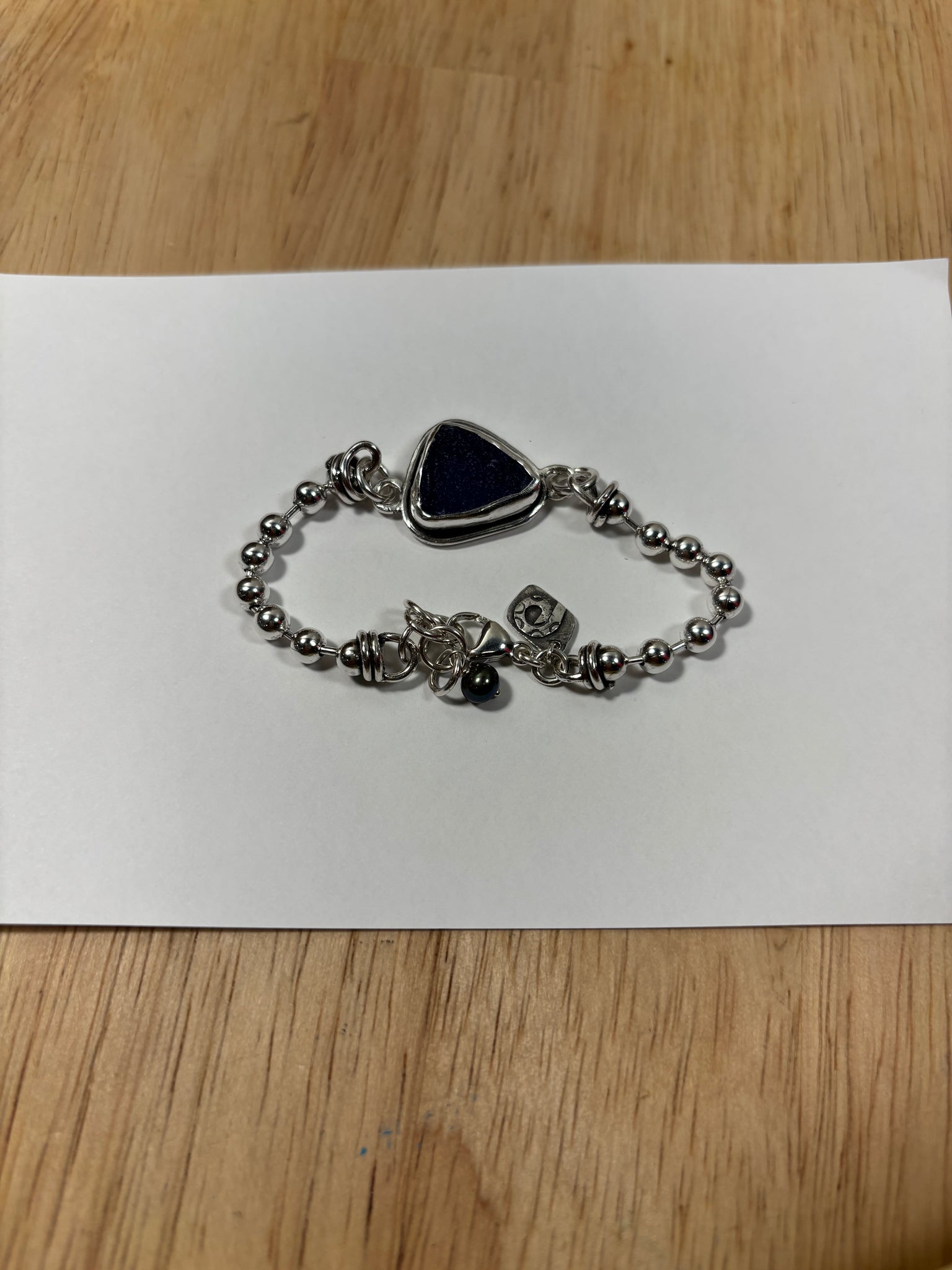 Noxzema Blue bezel set sea glass hangs securely from this sterling silver 5mm ball chain bracelet with a heavy lobster clasp closure. “Made On Mars” charm hangs near the clasp.  If you have a special piece of sea glass you would like to use to make a unique treasure for yourself or someone special, let me know, I make custom pieces. Also if you need a different size email me!
