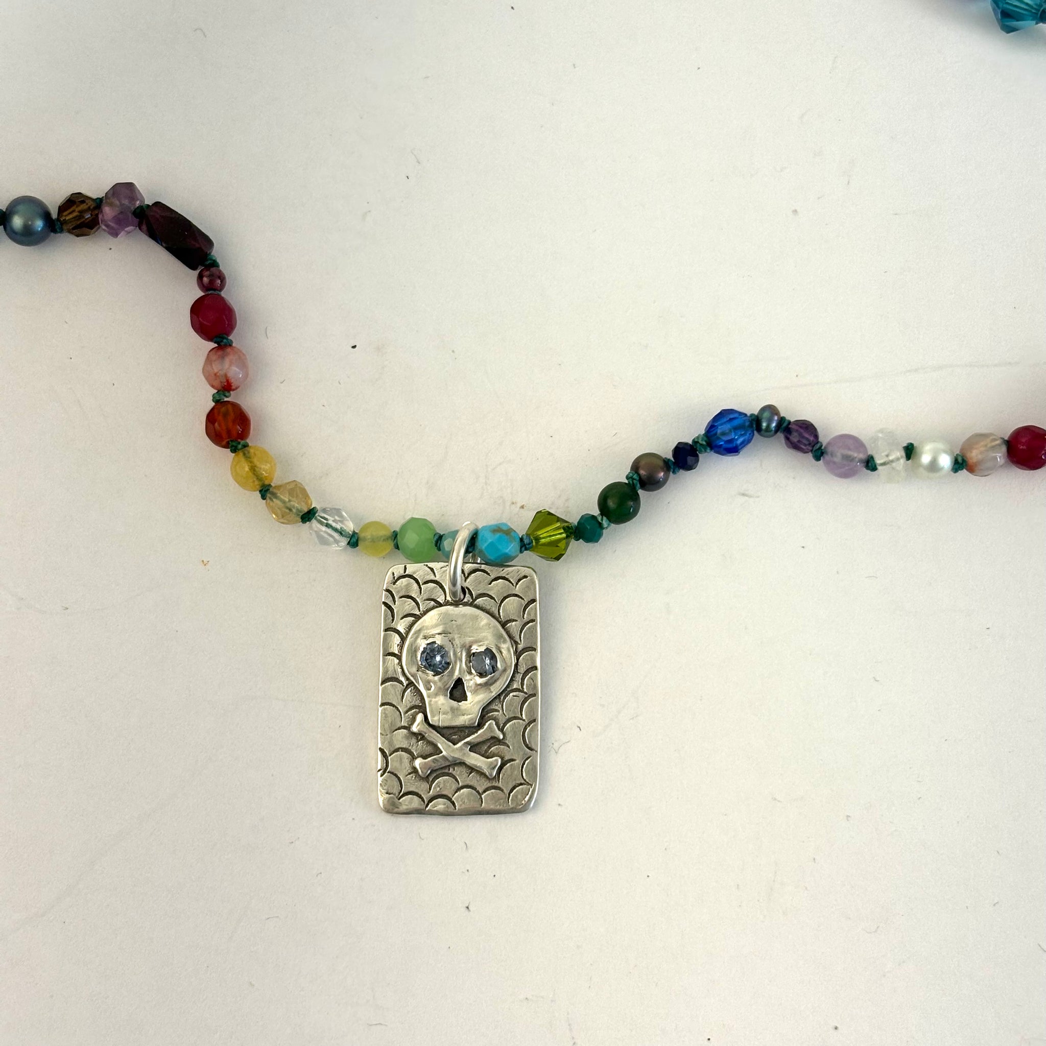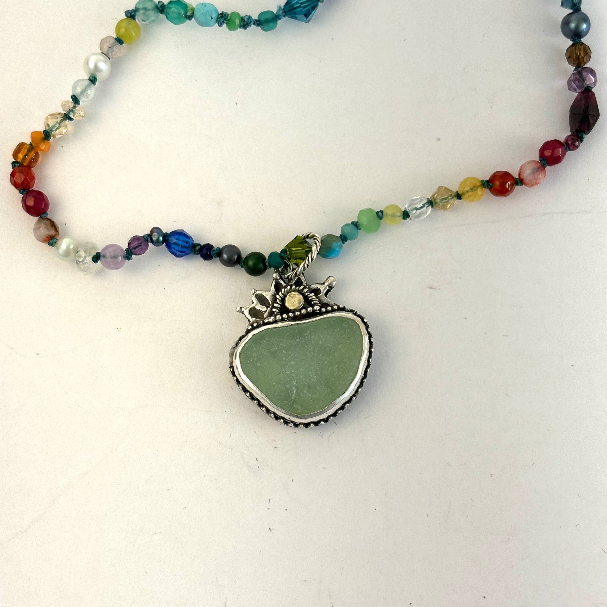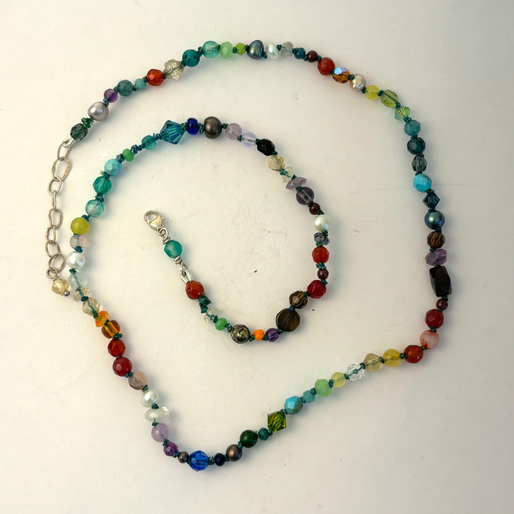 Rainbows rule! I have strung an array of semiprecious stone beads to create a colorful rainbow of beads. Its been created by hand knotting yellow silk string in between each vibrant bead. Jade, agate, carnelian, howlite , coral, lapis, garnet, amethyst, aquamarine, and pearl are a few of the many beads that create this one of a kind piece. This necklace measures about 17-18 inches in length A handmade.