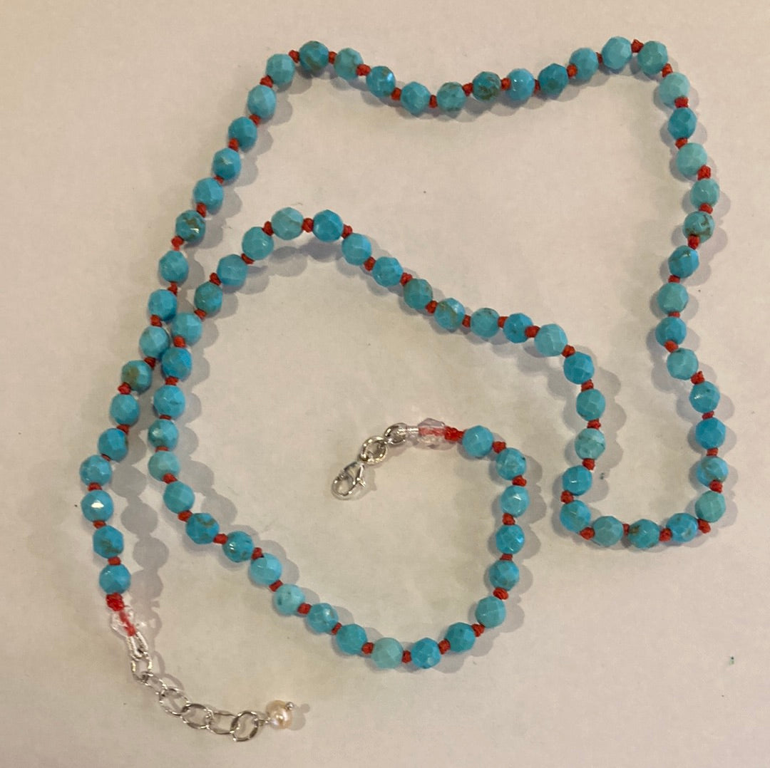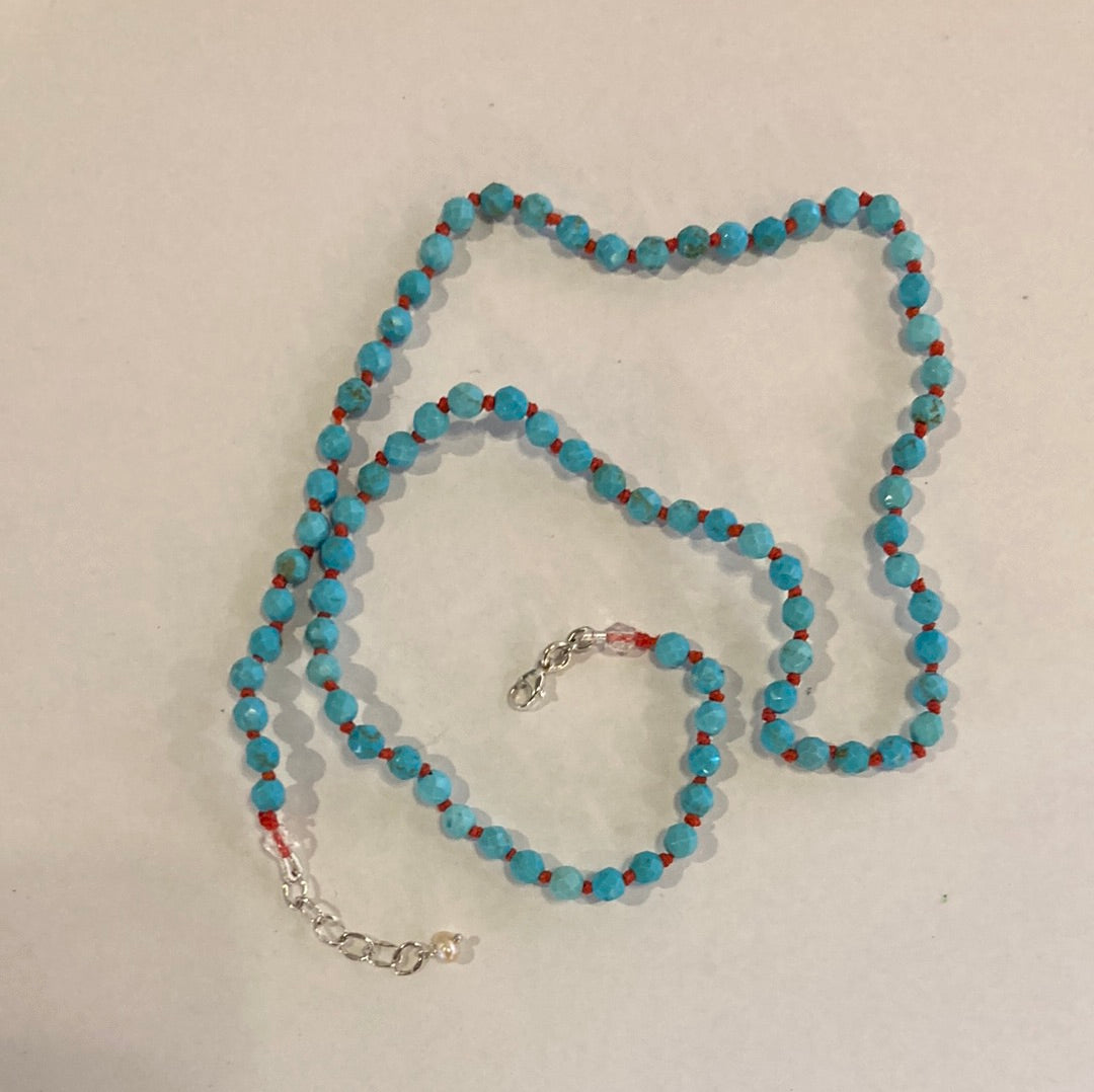 Turquoise is a stone of well-being. It contains protective properties that help ward off negative energy with the purity of natural elements such as water and air. These 3.5 mm faceted round turquoise beads are individually knotted with orange string and finished with a sturdy sterling silver clasp and chain, measuring about 15.5-17.5inches in length. It looks pretty sweet with a heart pendant hanging from it too.