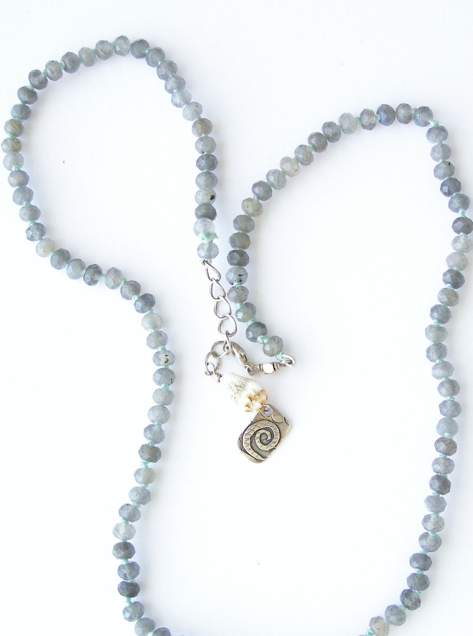Faceted Labradorite beads have been strung and hand knotted on pale blue beading string and finished with sterling silver findings. This necklace measures about 18 inches in length. The necklace in the last two image are pictured with the "Mermaid Out the Porthole" and the "Peace " pendant, both sold separately in this shop. Labradorite ((Ca, Na)(Al, Si)4O8),is a feldspar mineral, a grayish smoky stone with flecks of yellow, blue , purple and green, its name is derived from its Canadian origin, the Labrador Peninsula. Traditionally, labradorite is a gemstone regarded to pull good fortune. If worn as a necklace, its wearer is said to have a healthy body and a good fortune in his relationship. All Made On Mars Items come packaged in super cute packaging gift ready!!!!