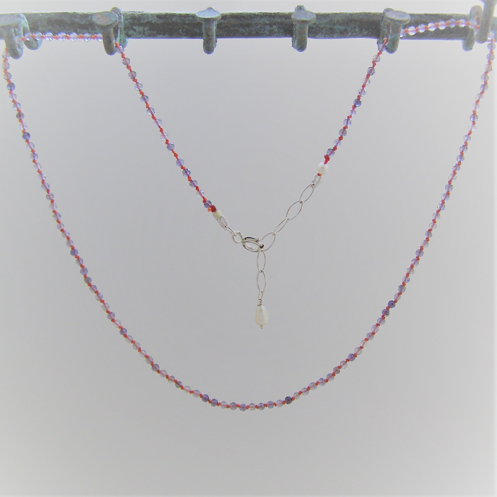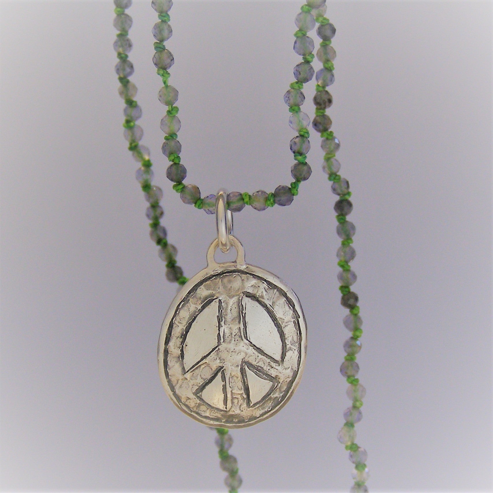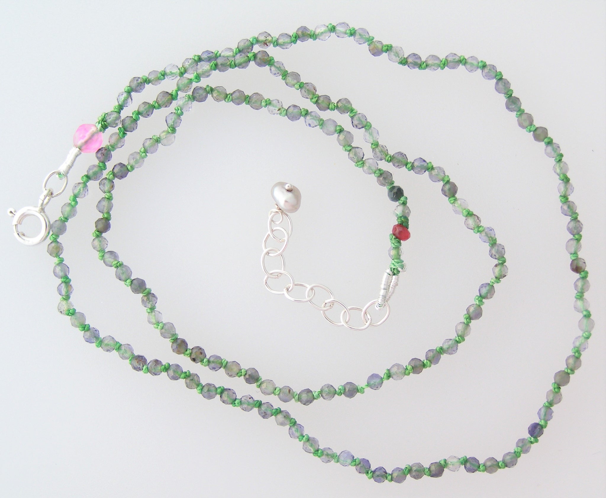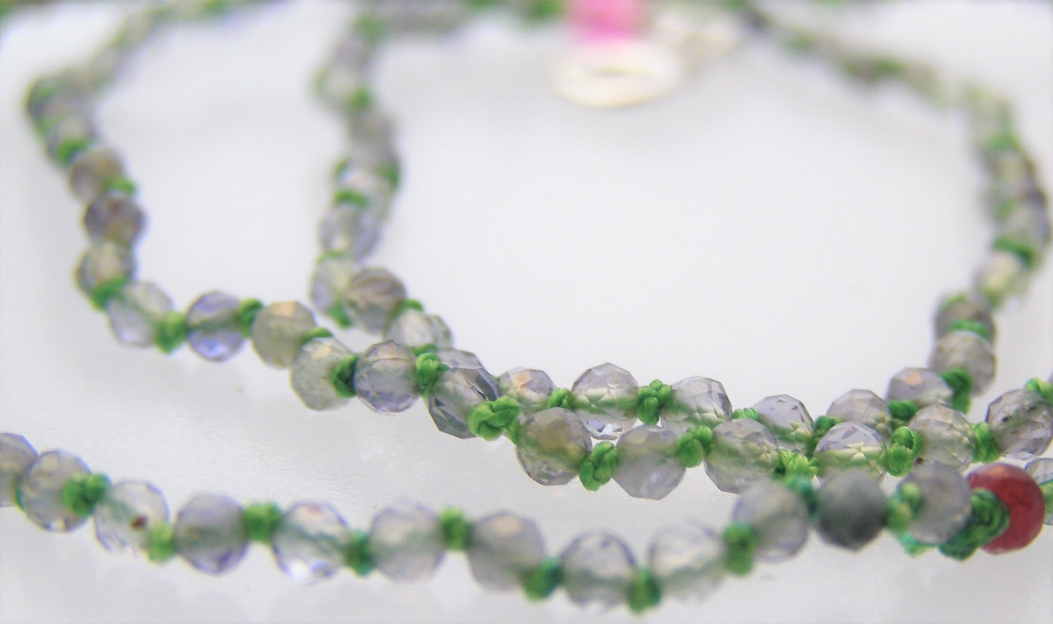 The Vikings made iolite's pleochlorism a virtue by using thin slices of the stone as a light polarizer to navigate their trips. By observing the sky through iolites, the Viking navigators were able to locate the exact position of the sun on overcast days. 2mm Faceted grayish, violet iolite beads are individually knotted green or red string and finished with a sturdy sterling silver clasp, measuring about 18-19 inches in length. Does it look super with a peace pendant hanging from it? This necklace measures about 18 inches in length.
