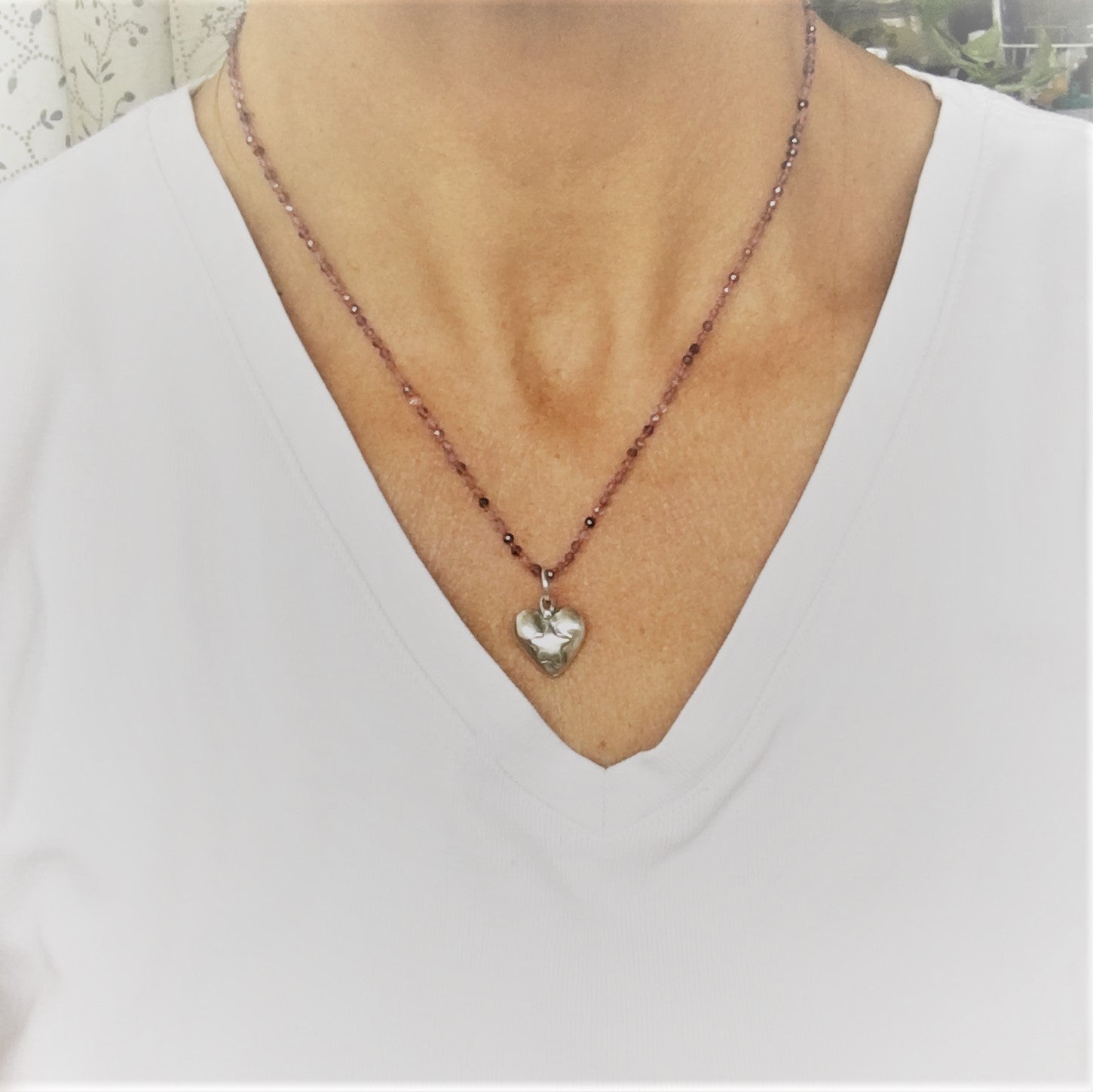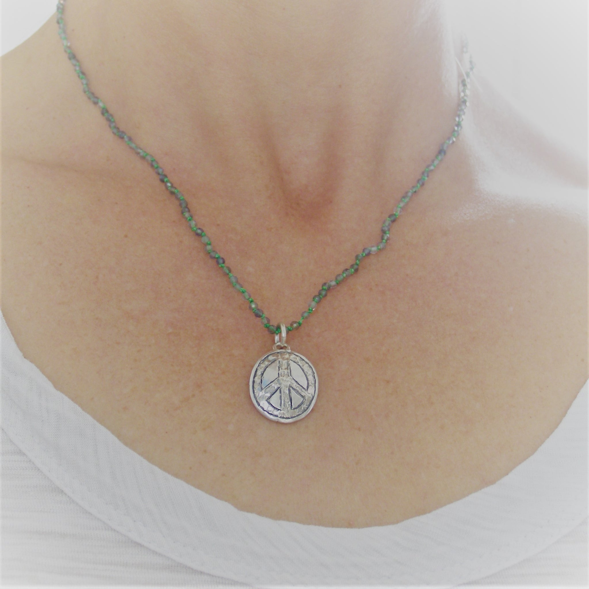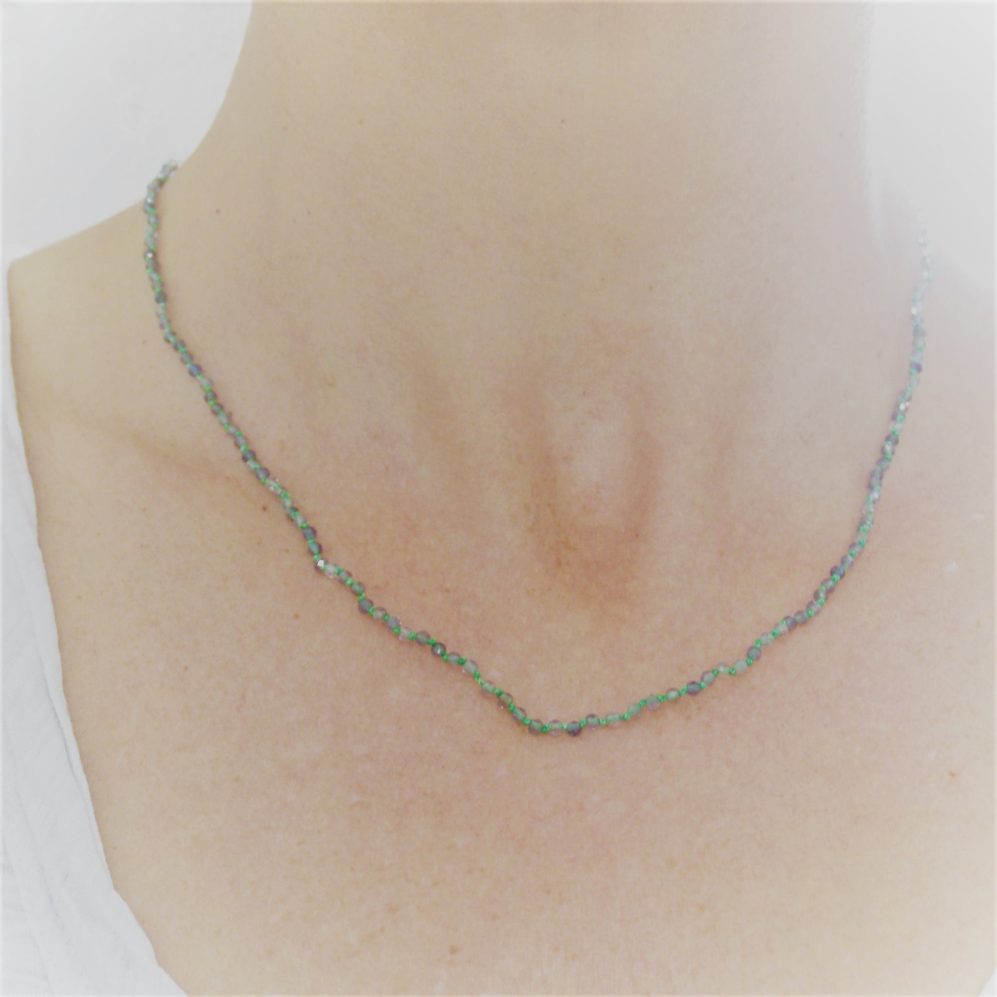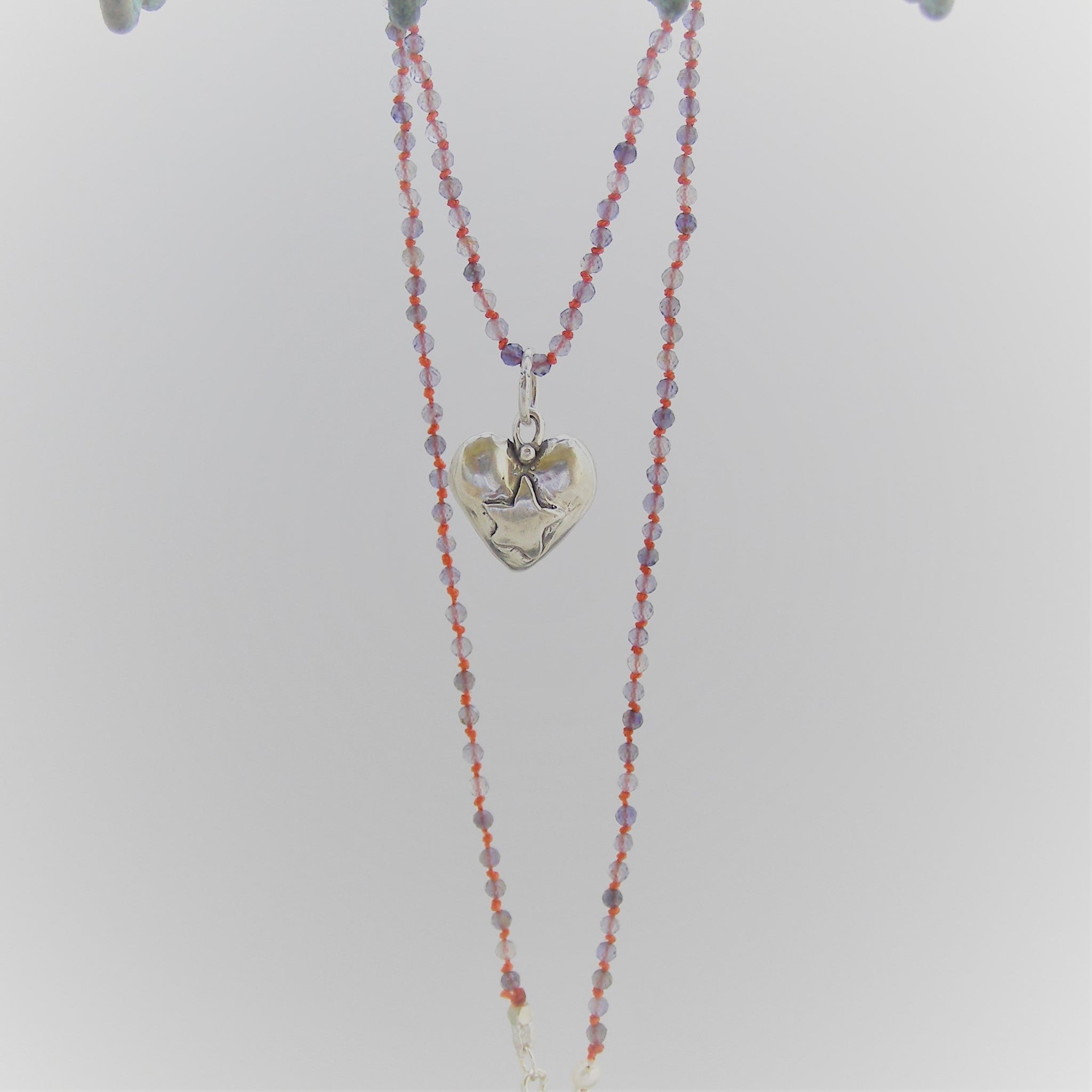 The Vikings made iolite's pleochlorism a virtue by using thin slices of the stone as a light polarizer to navigate their trips. By observing the sky through iolites, the Viking navigators were able to locate the exact position of the sun on overcast days. 2mm Faceted grayish, violet iolite beads are individually knotted green or red string and finished with a sturdy sterling silver clasp, measuring about 18-19 inches in length. Does it look super with a peace pendant hanging from it? This necklace measures about 18 inches in length.