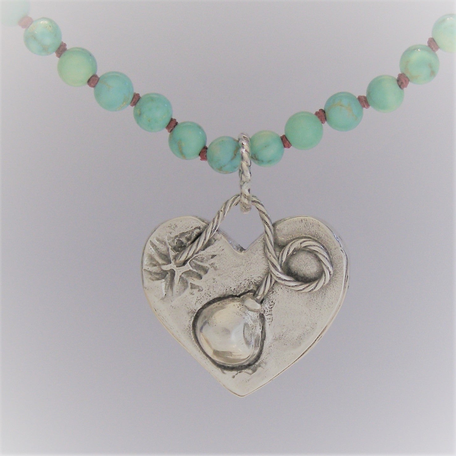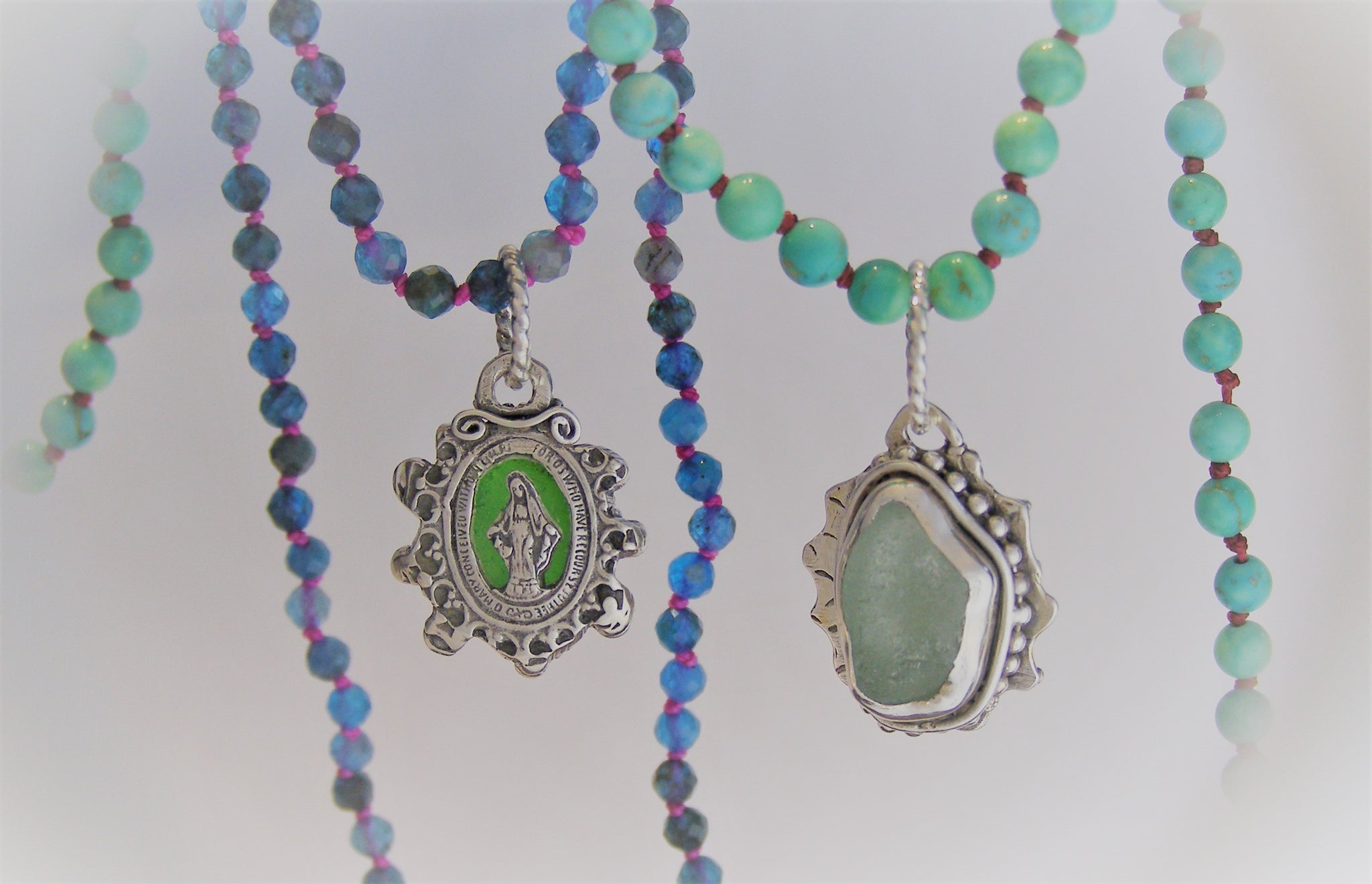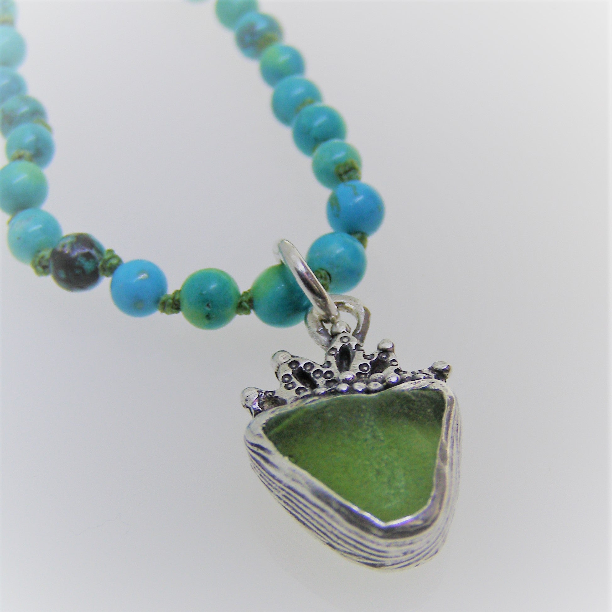 Turquoise is a stone of well-being. It contains protective properties that help ward off negative energy with the purity of natural elements such as water and air. These 3mm round turquoise beads are individually knotted with red or blue string and finished with a sturdy sterling silver clasp and chain, measuring about 18 inches in length, but it has an inch of extension. Does it look super with a sea glass pendant hanging from it? It looks pretty sweet with a heart pendant hanging from it too.