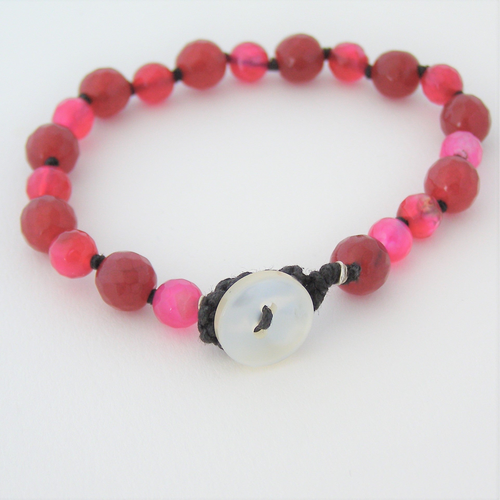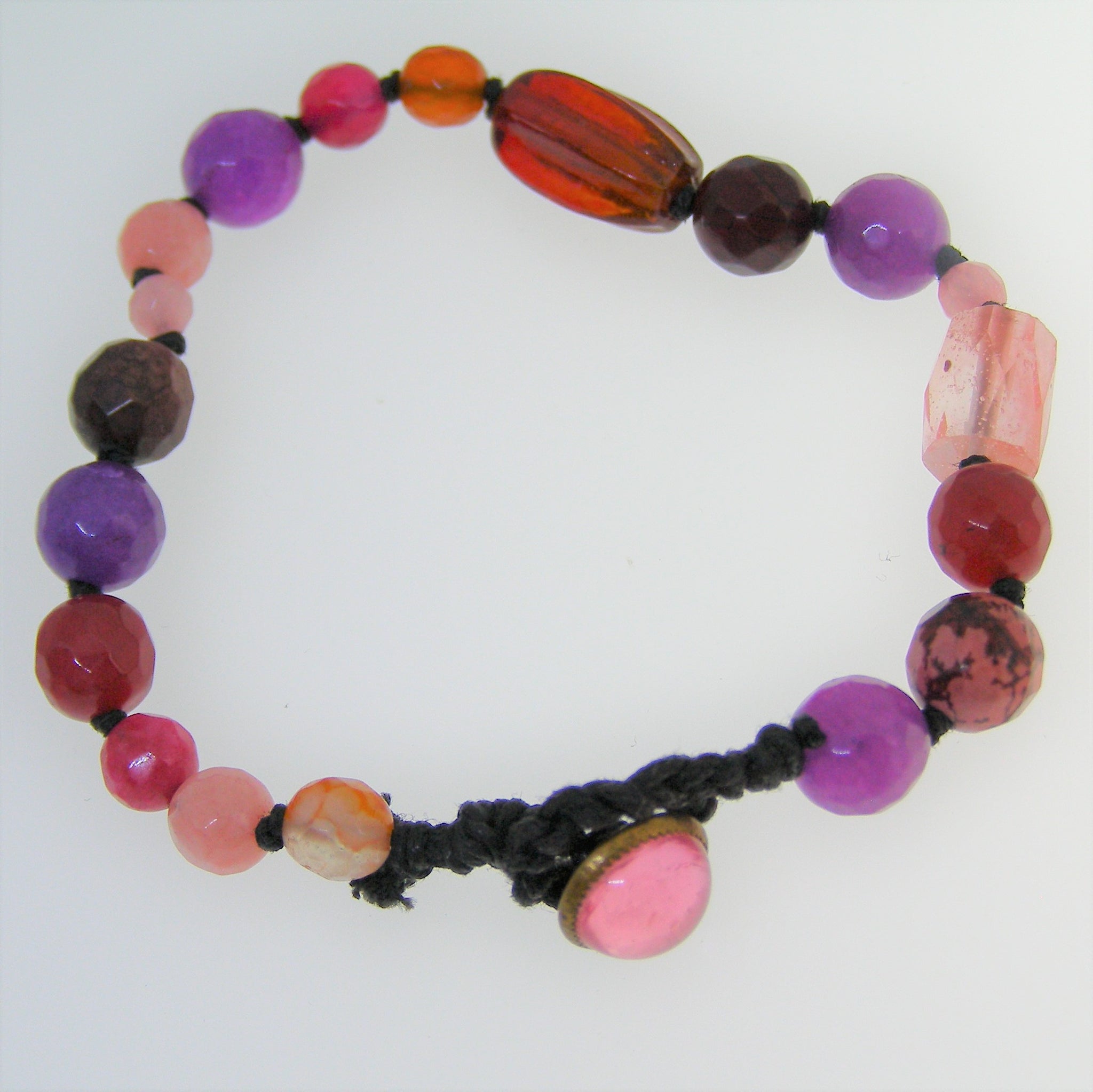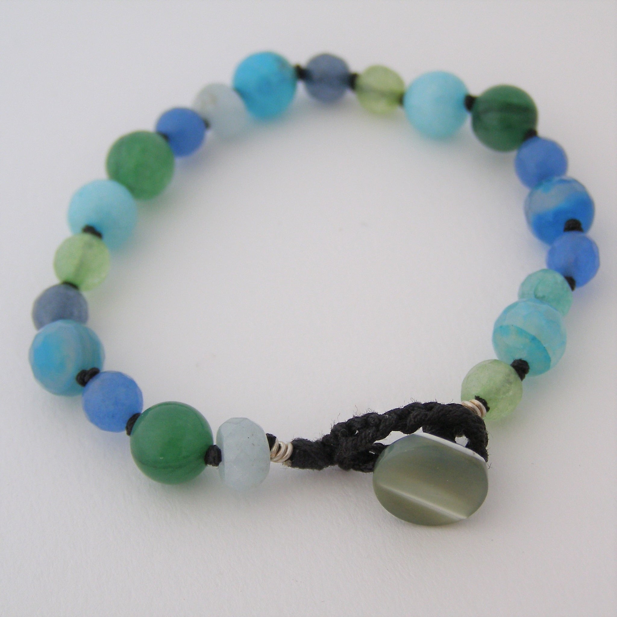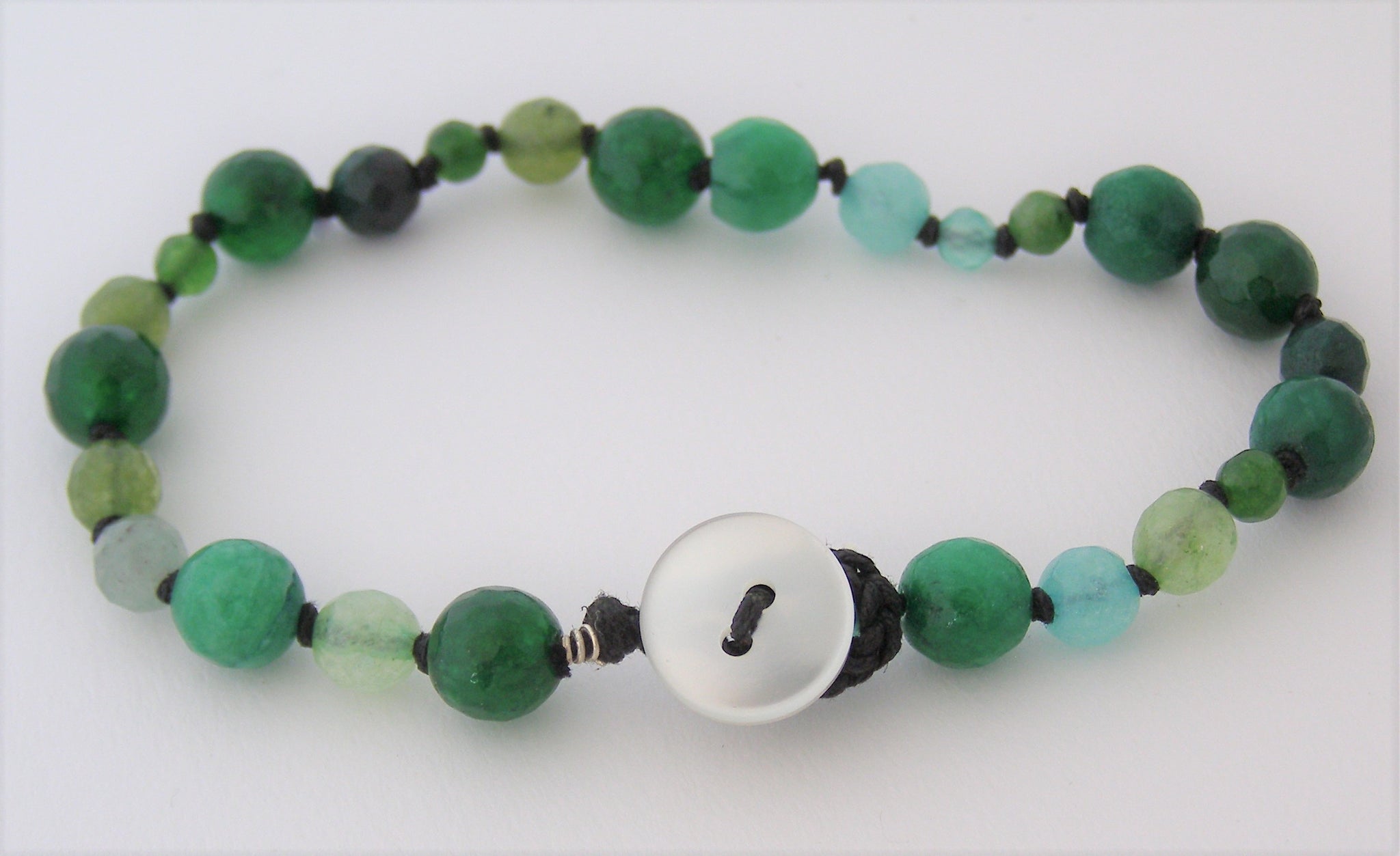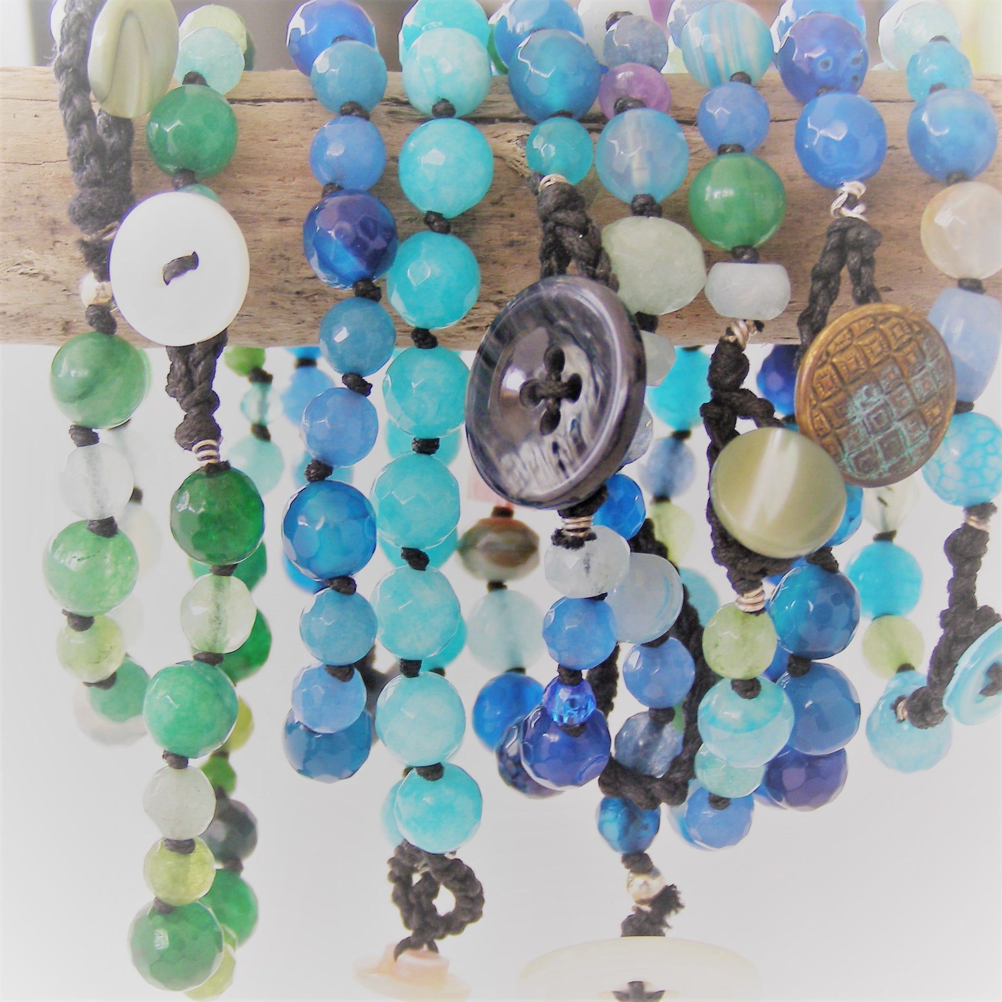 I found a jar of old buttons and paired them up with these beads to create cool bracelets using a variety if quartz, jade, agate and fire-polished glass beads in so many beautiful colors. I knotted them on black wax linen cord.