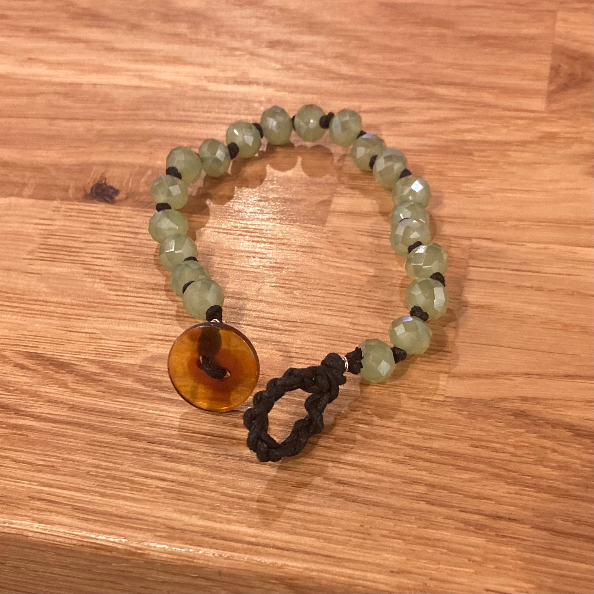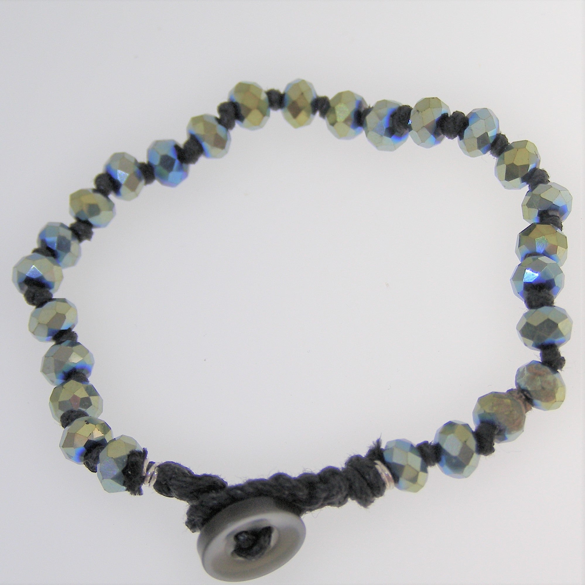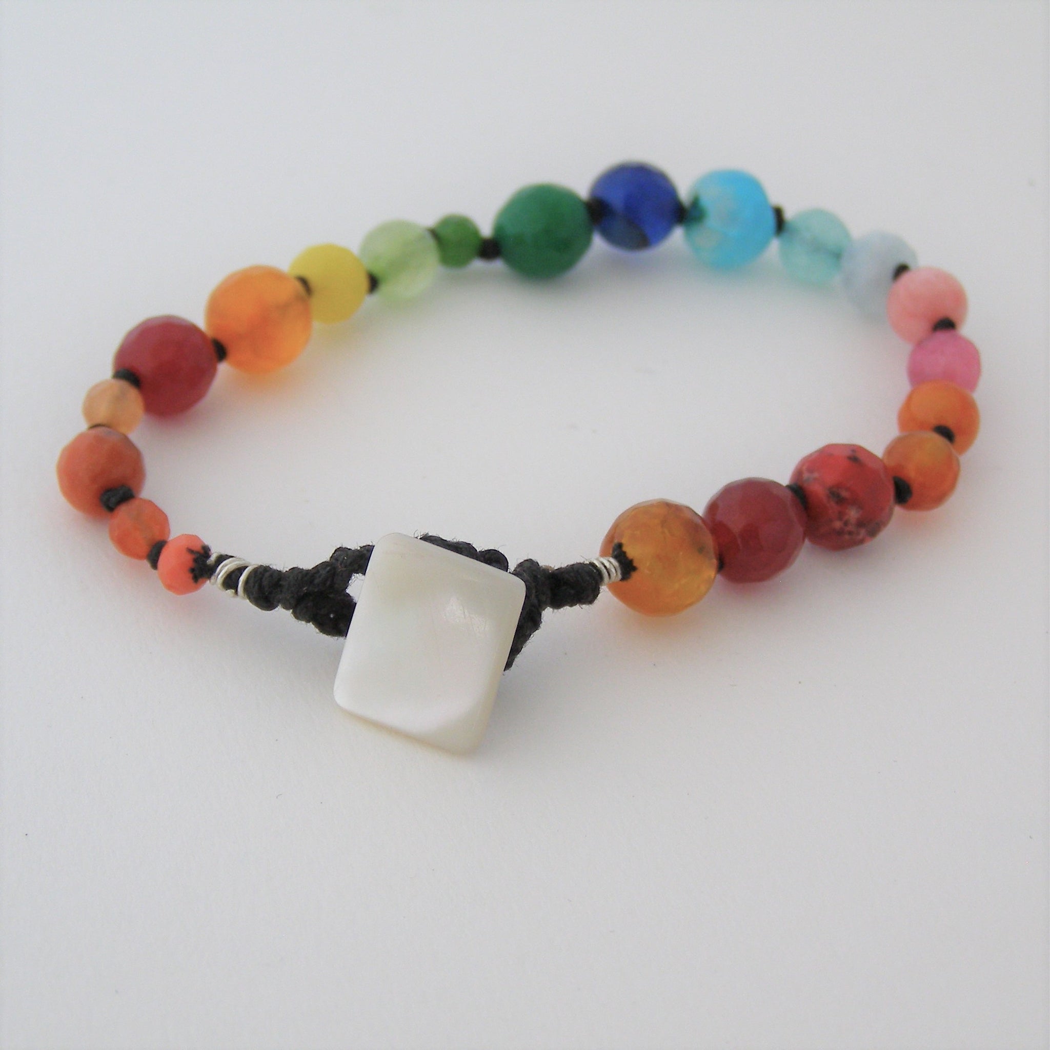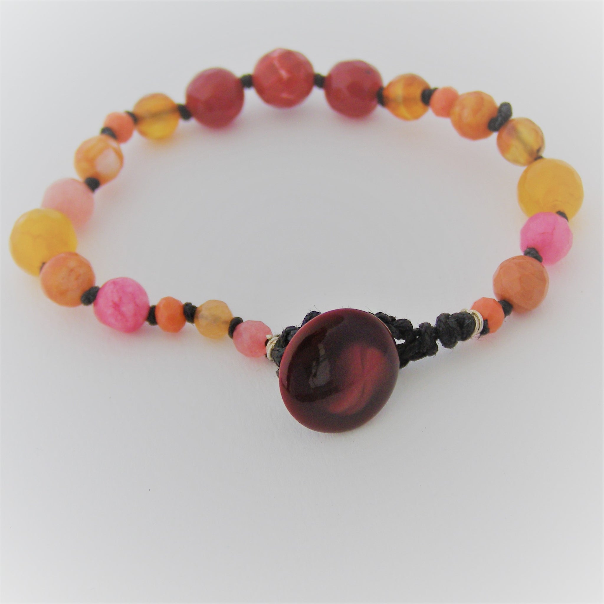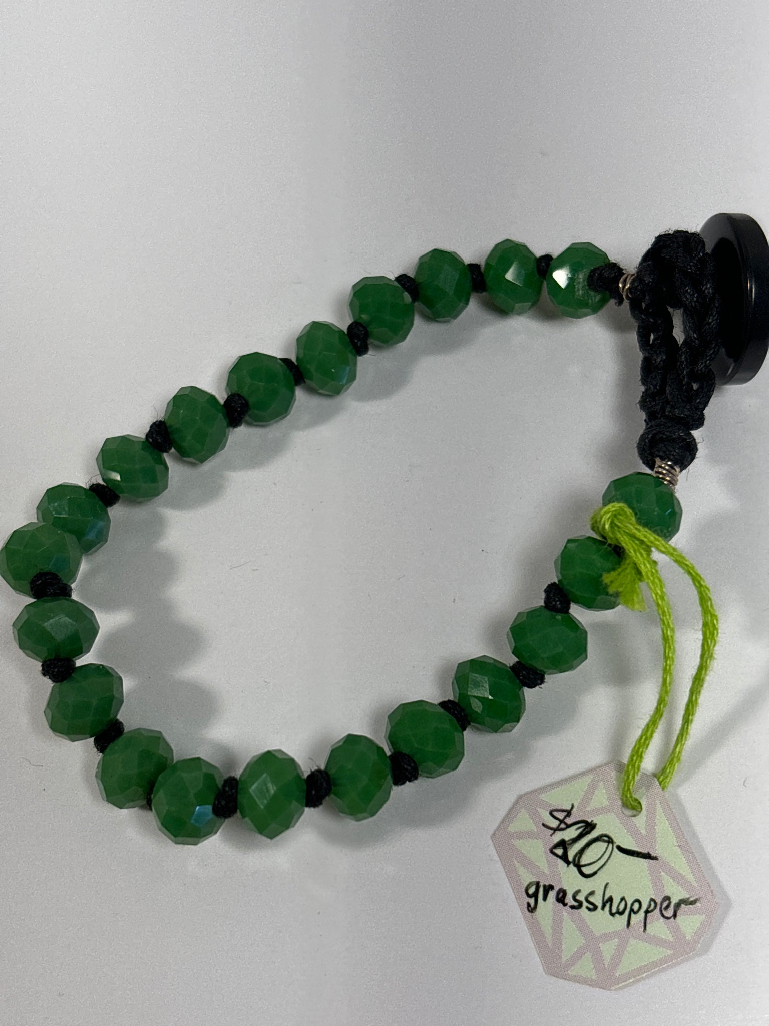 I found a jar of old buttons and paired them up with these beads to create cool bracelets using a variety if quartz, jade, agate and fire-polished glass beads in so many beautiful colors. I knotted them on black wax linen cord.