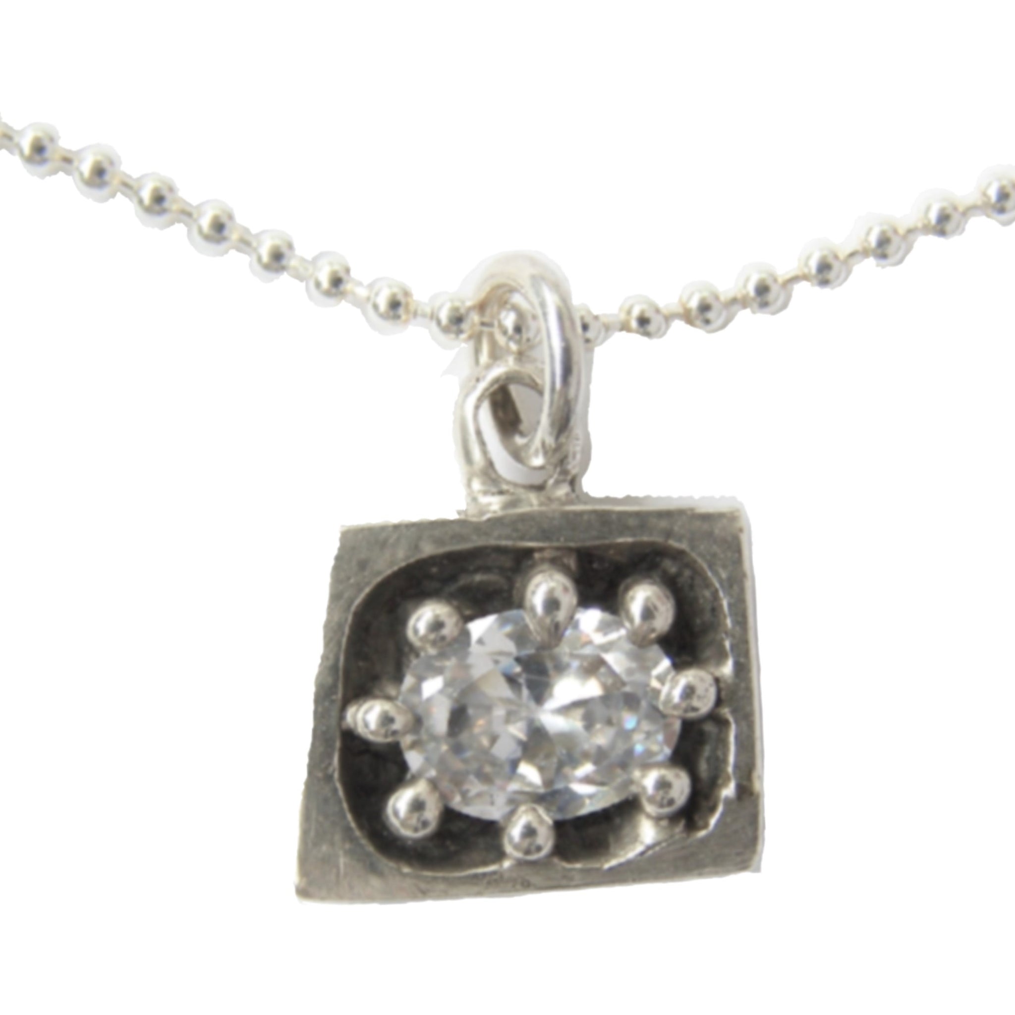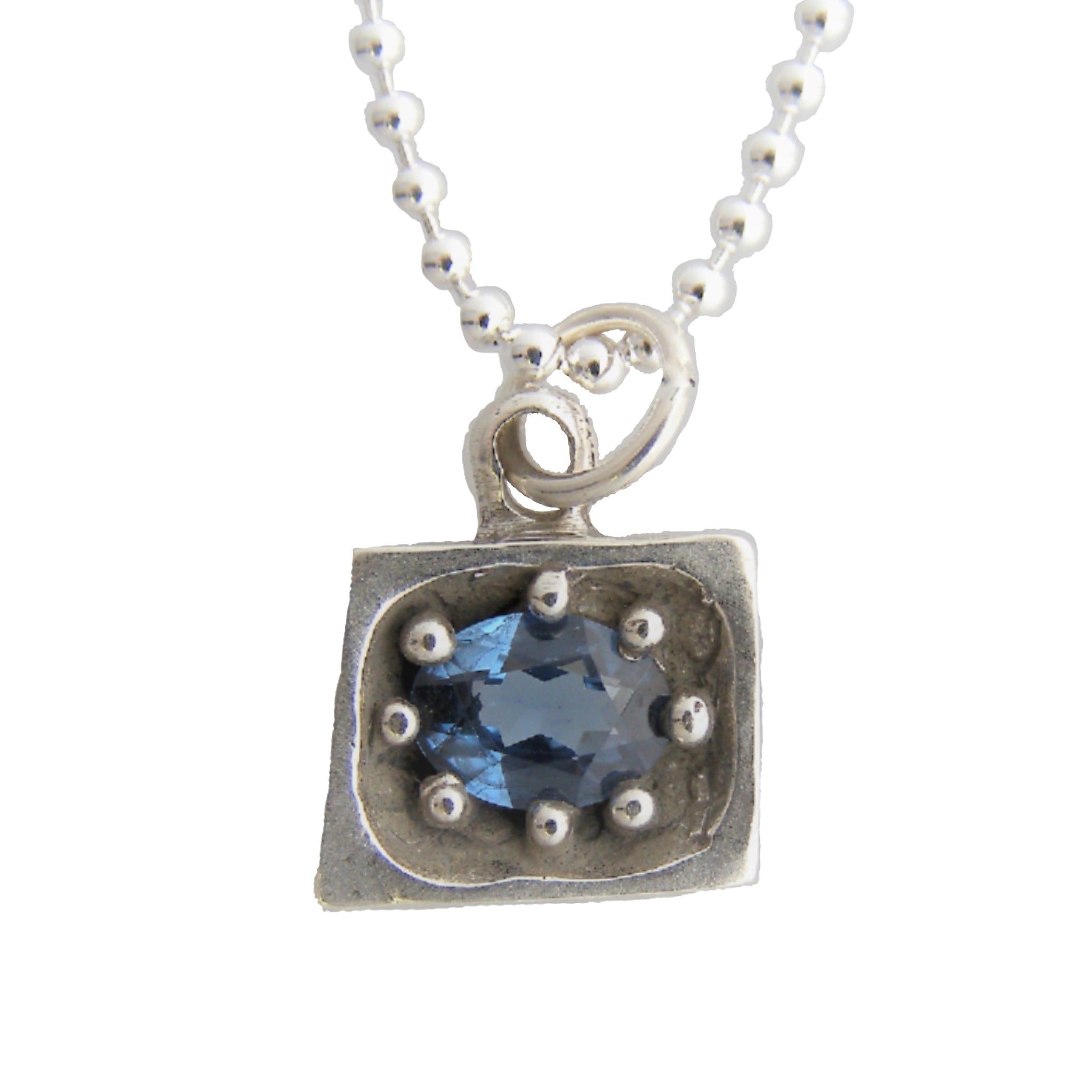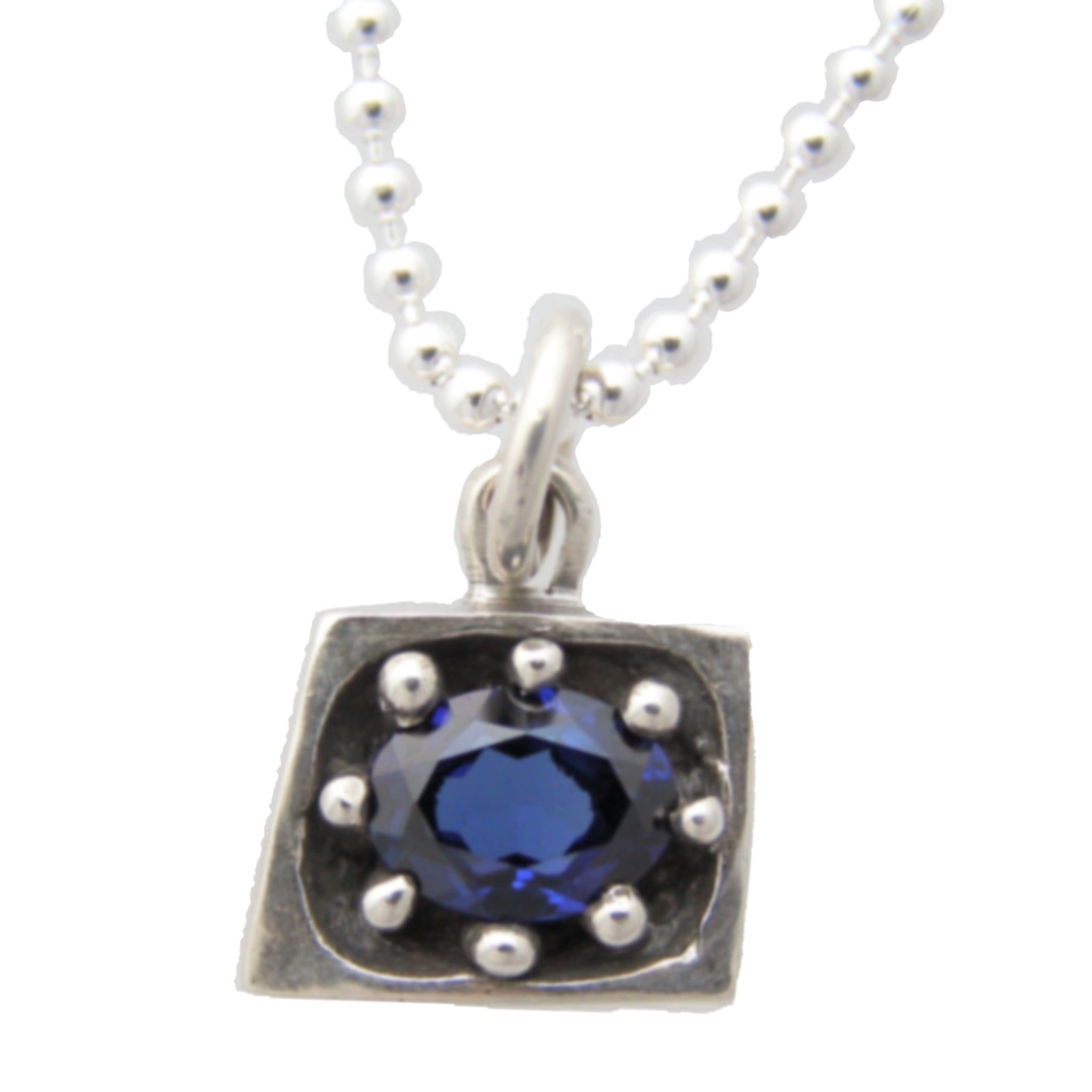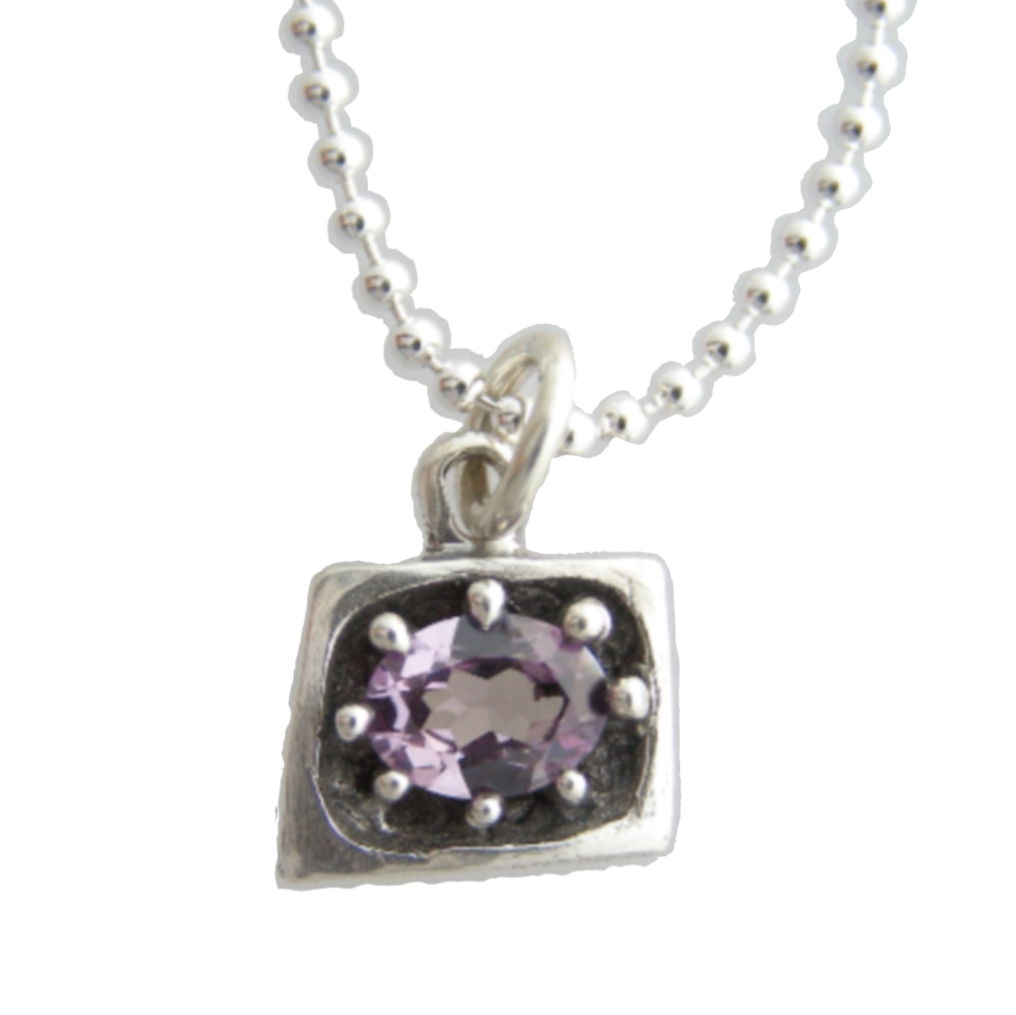 Sterling silver, pendant measures 11x14mm with a 6x8mm faceted synthetic pink tourmaline set within the framed shape. This pendant comes on an open jump ring (the silver ring that hangs the pendent on the necklace), so it can hang on most necklaces. For an added cost you can purchase this on a sterling silver ball chain