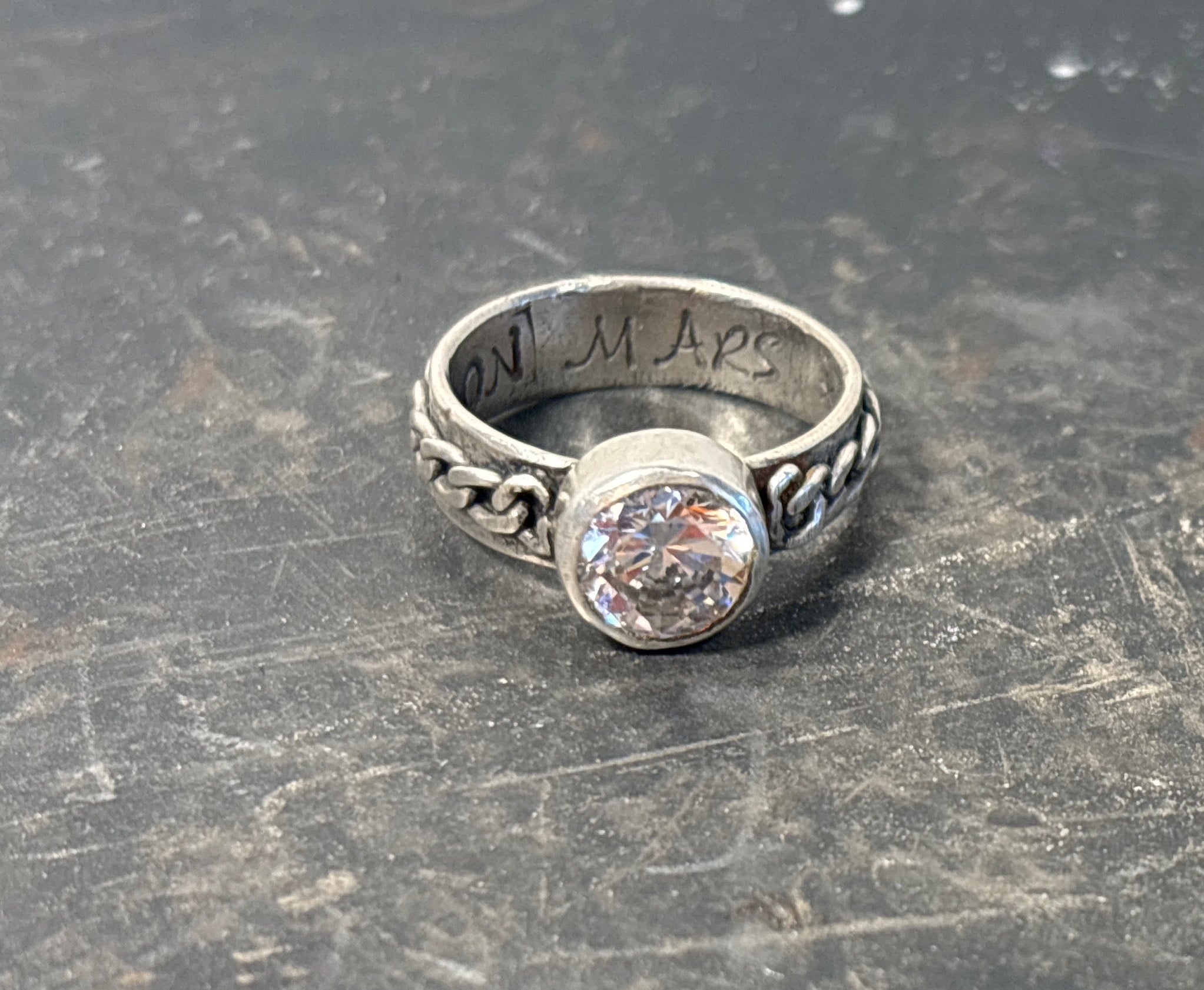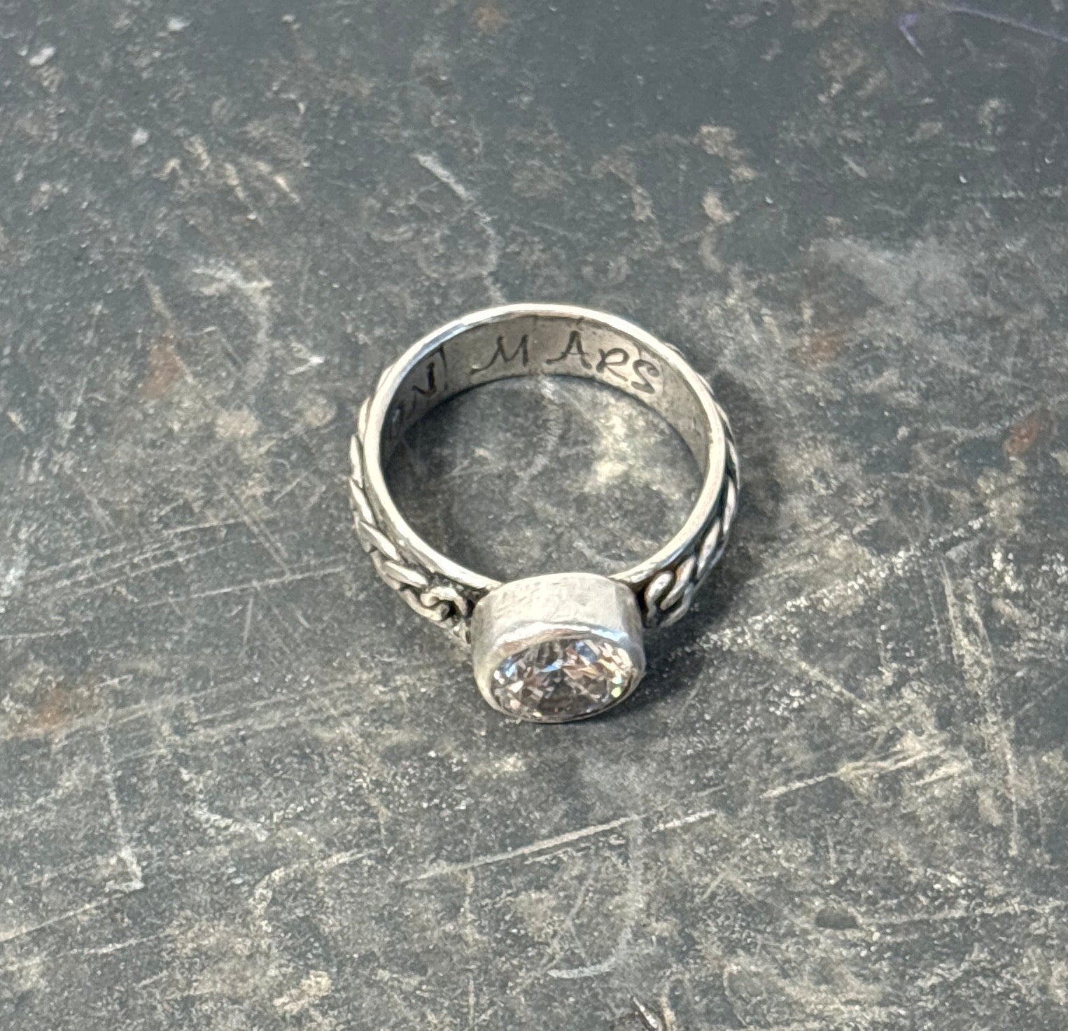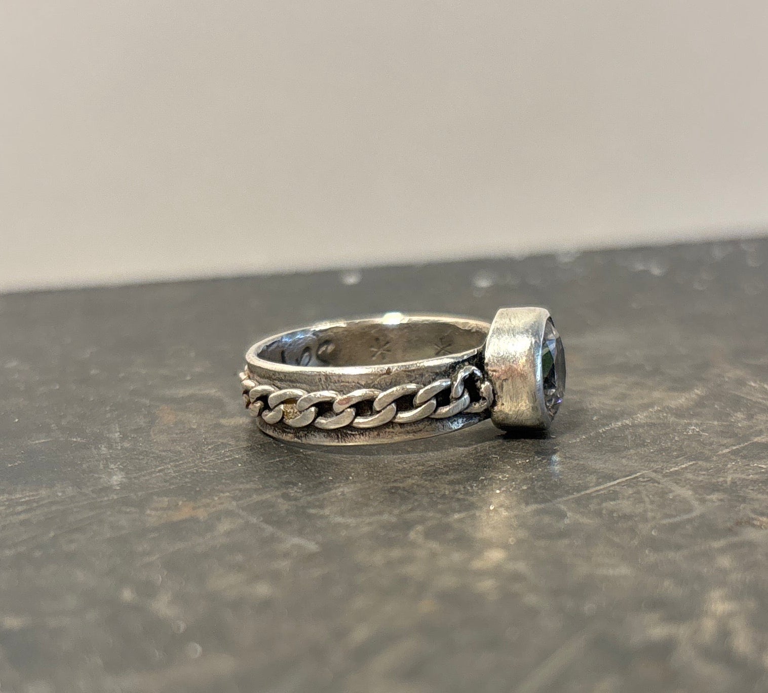 This beautiful round 8 mm round cubic zirconium stone bezel set within a fine silver sits prominently on a ring shank decorated with a Cuban chain