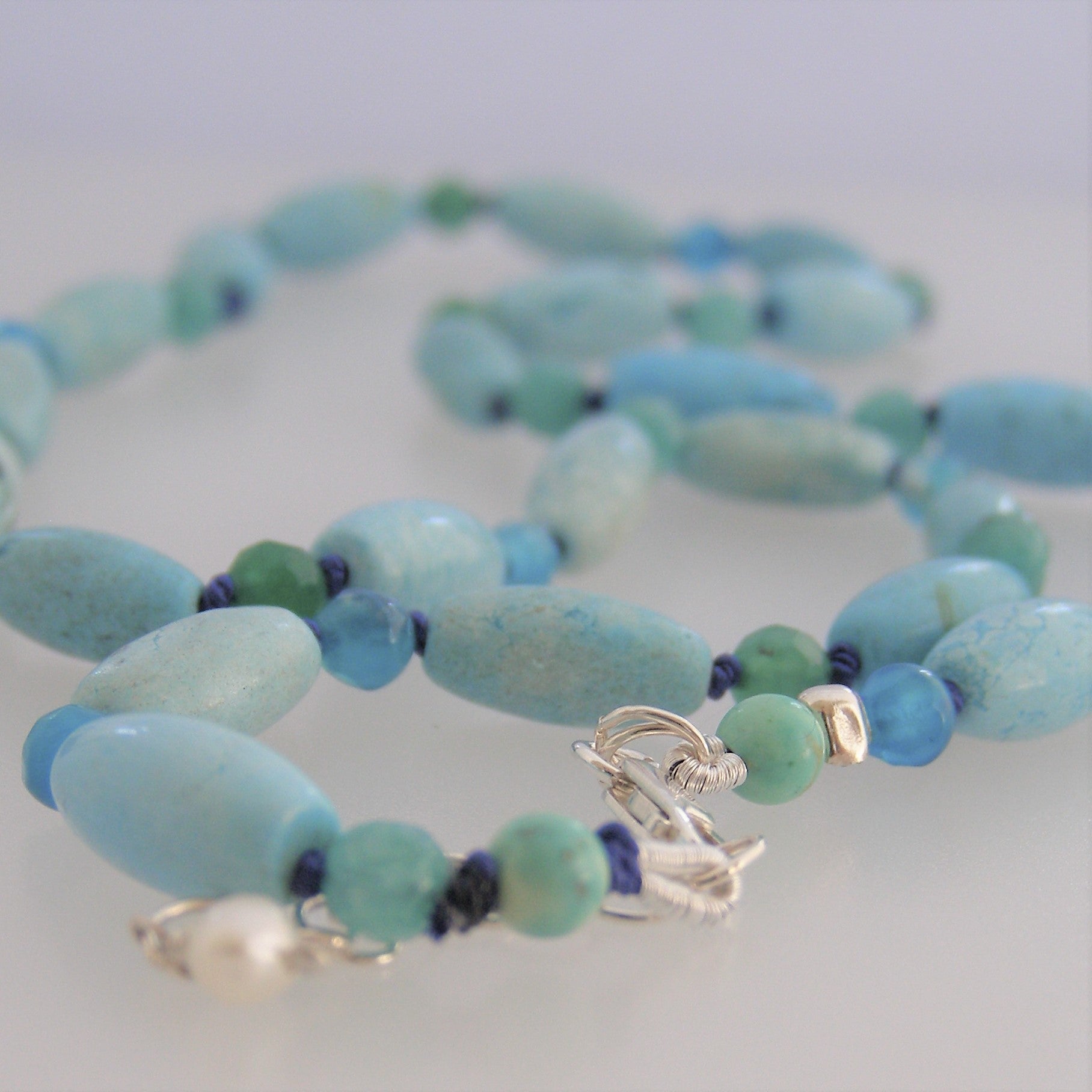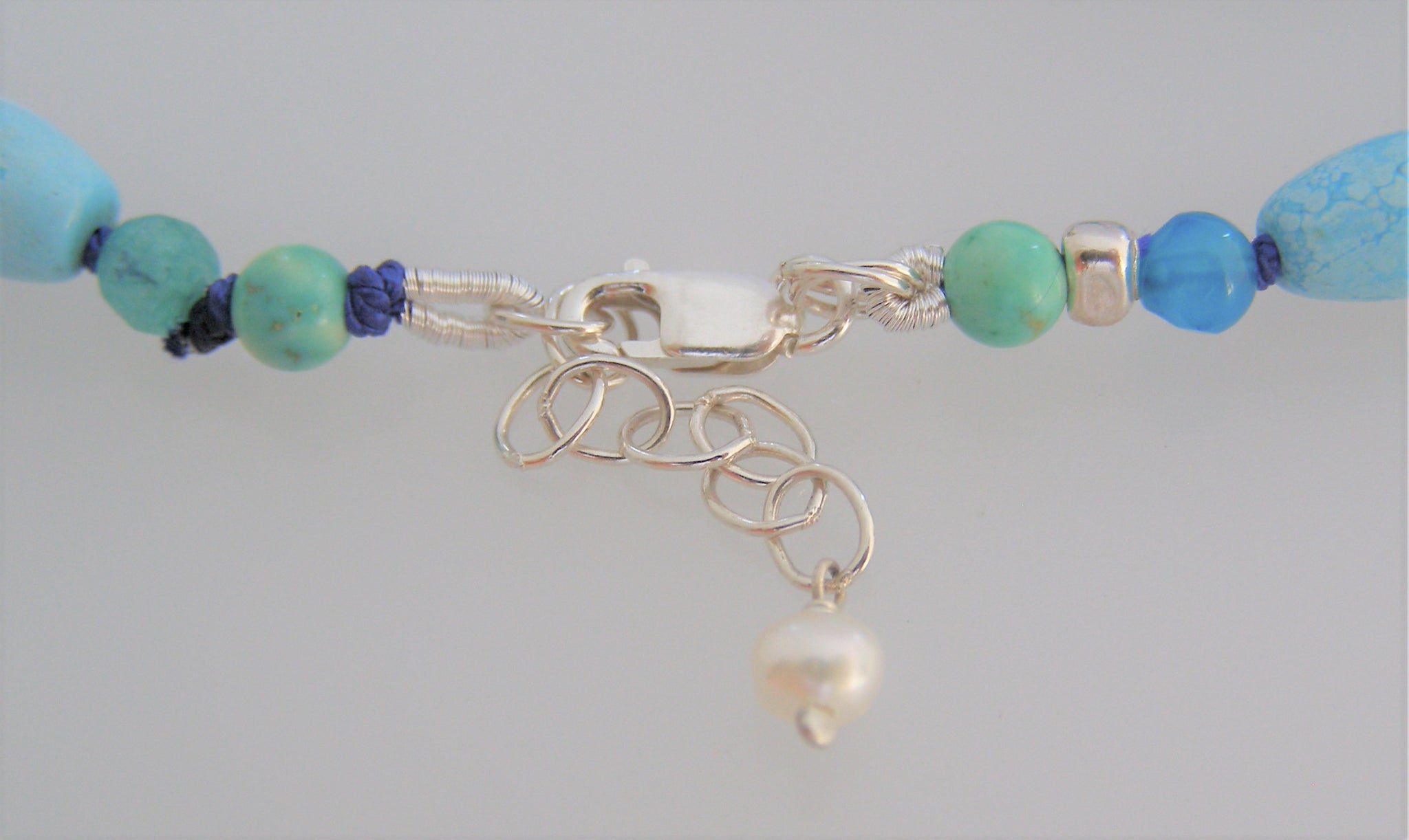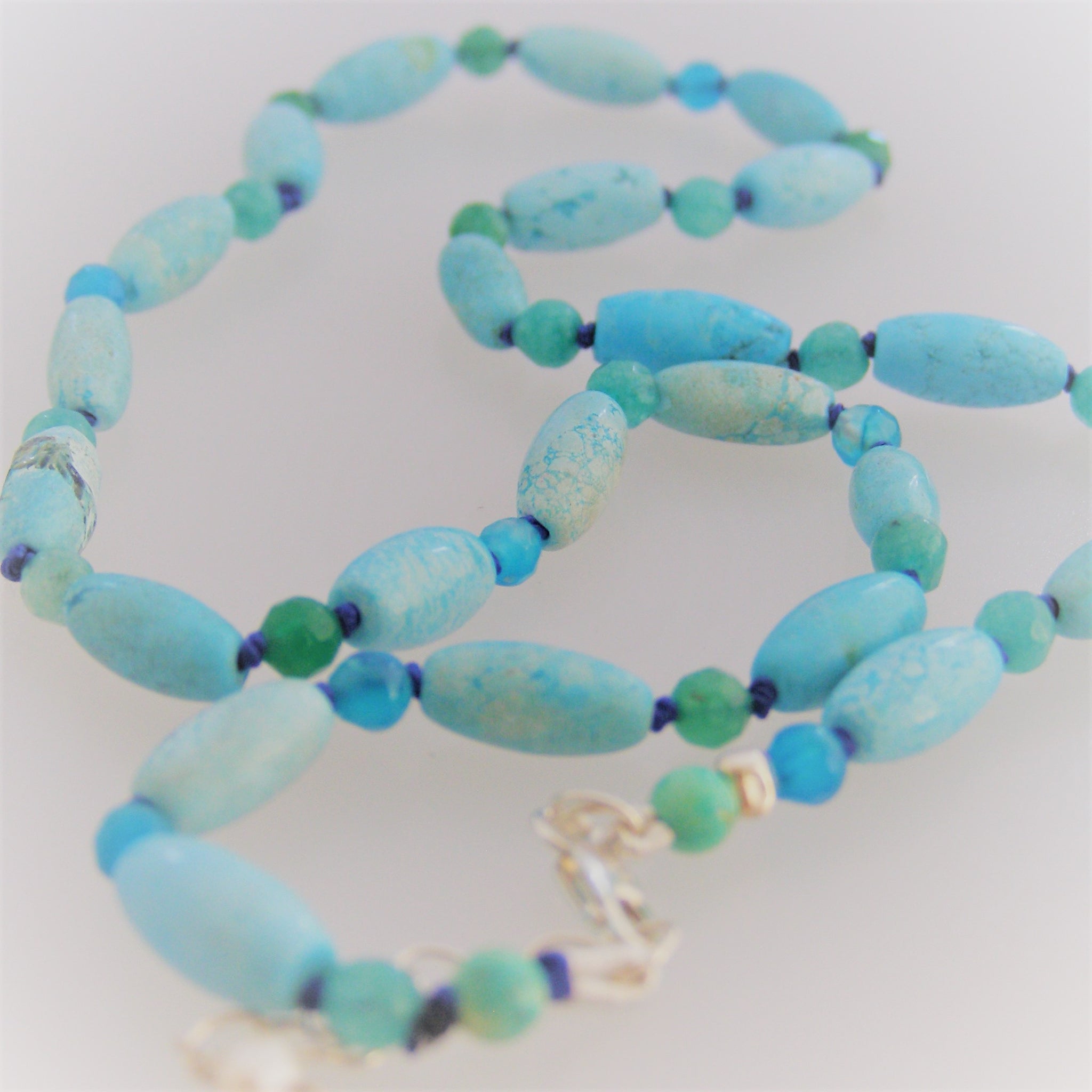Alternating turquoise and teal and green agate beads have been knotted on navy blue string finished off with a sturdy sterling silver clasp creating a necklace of Blue dreaminess. This necklace measures 18-19 inches in length