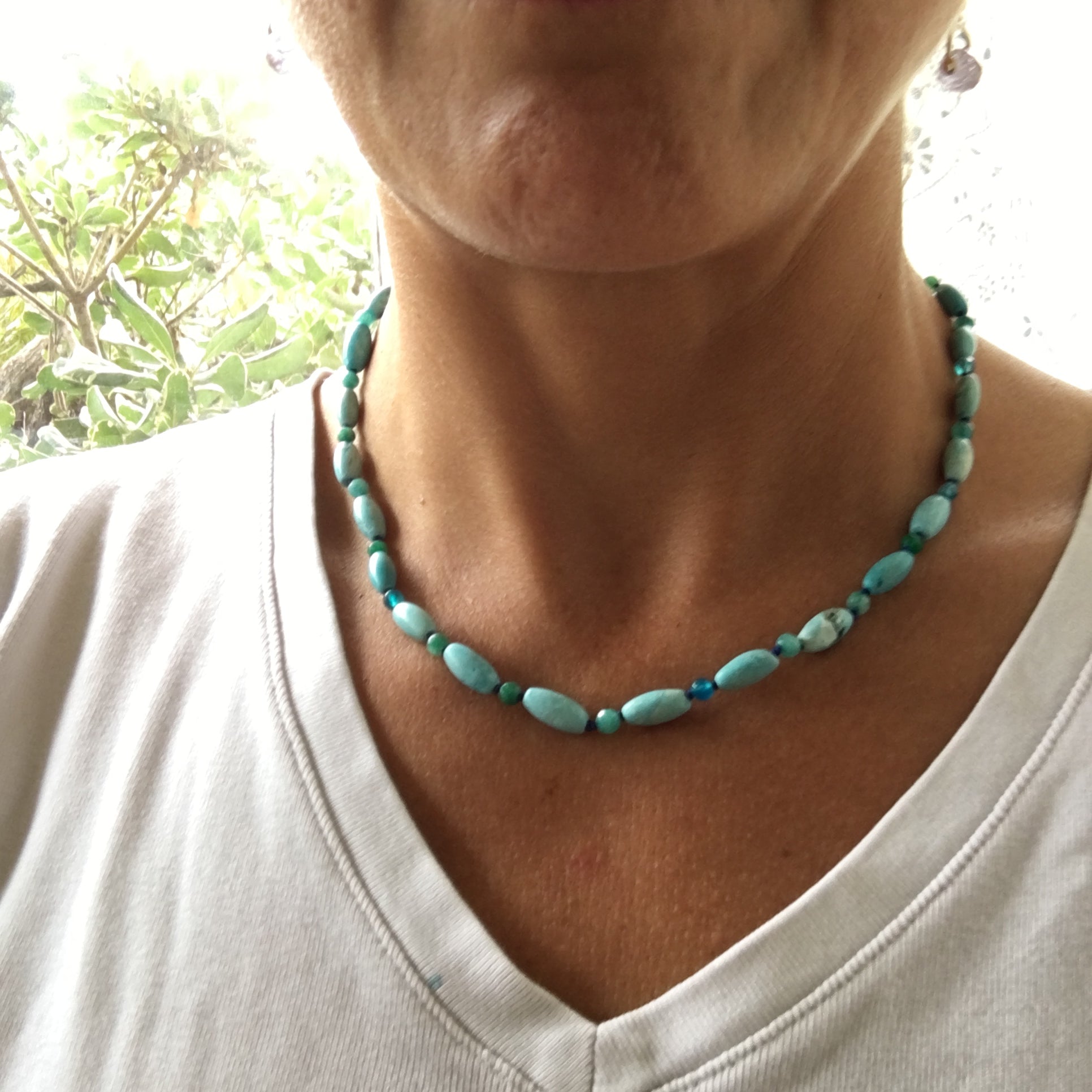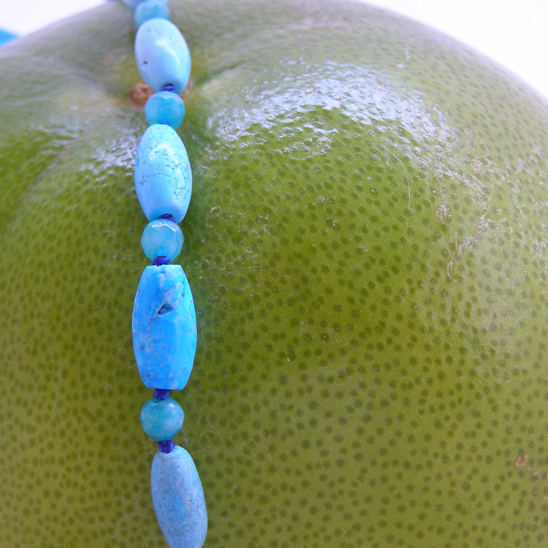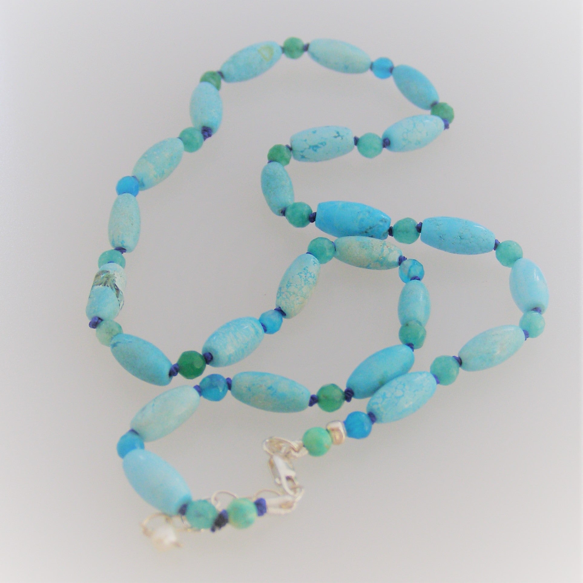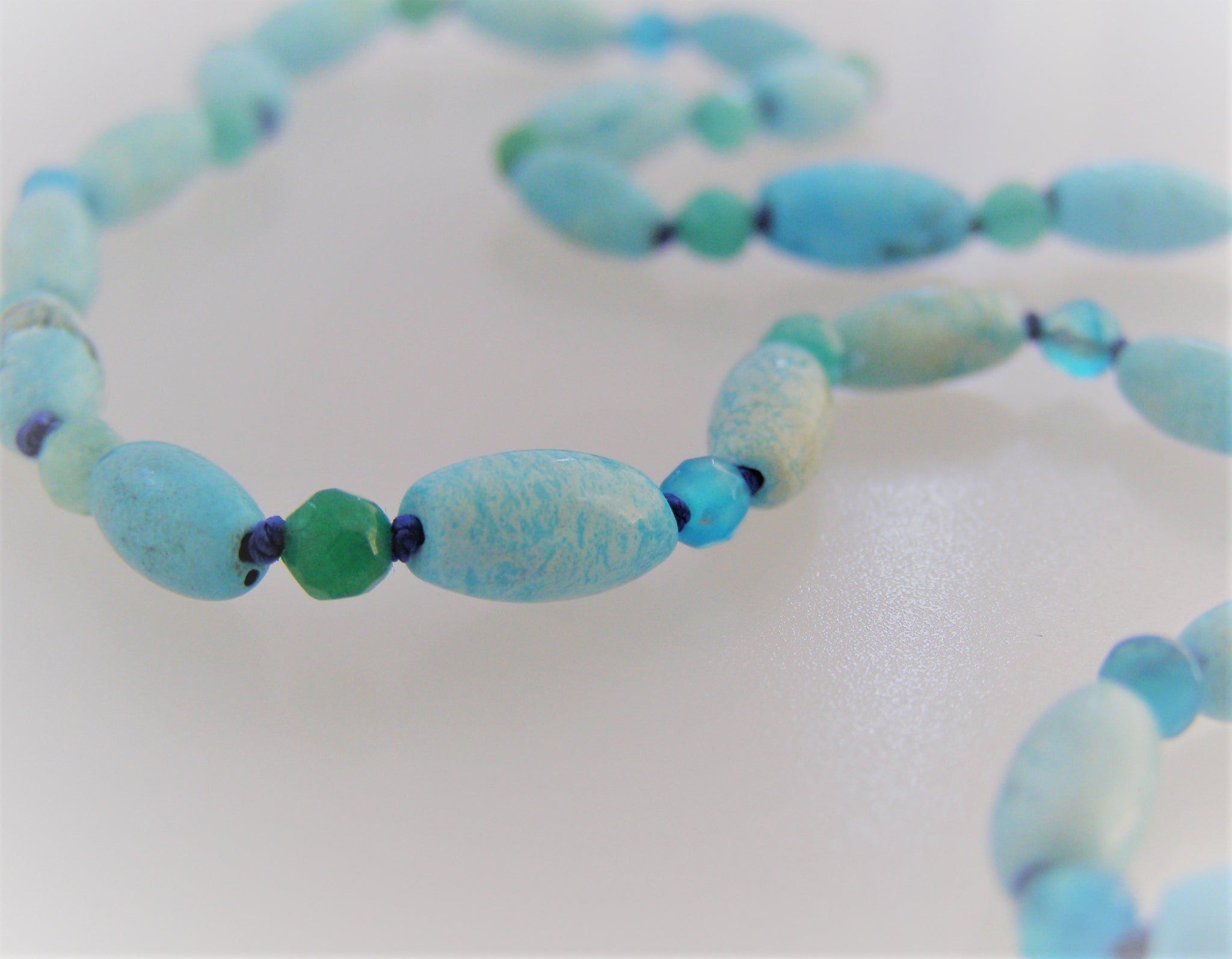 Alternating turquoise and teal and green agate beads have been knotted on navy blue string finished off with a sturdy sterling silver clasp creating a necklace of Blue dreaminess. This necklace measures 18-19 inches in length