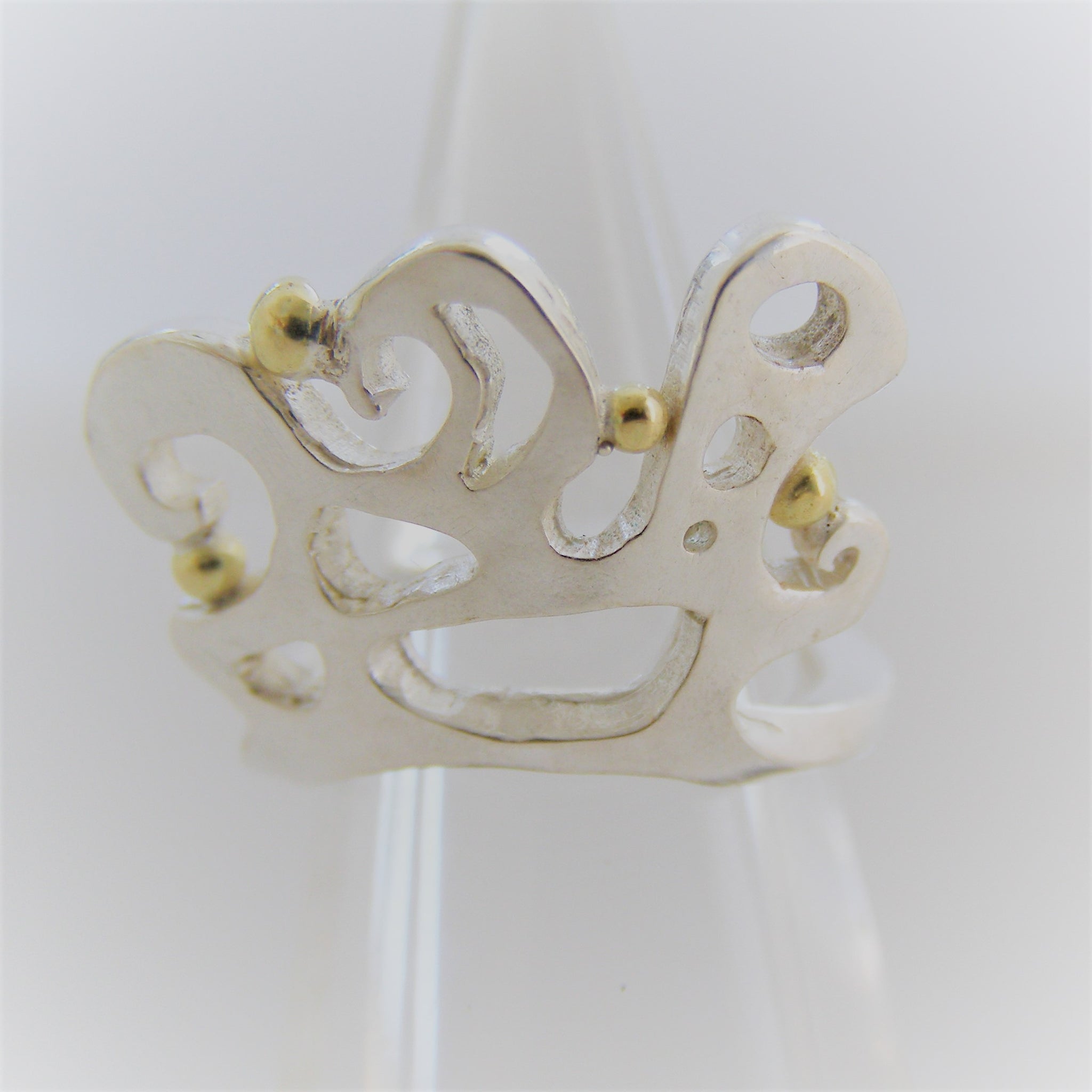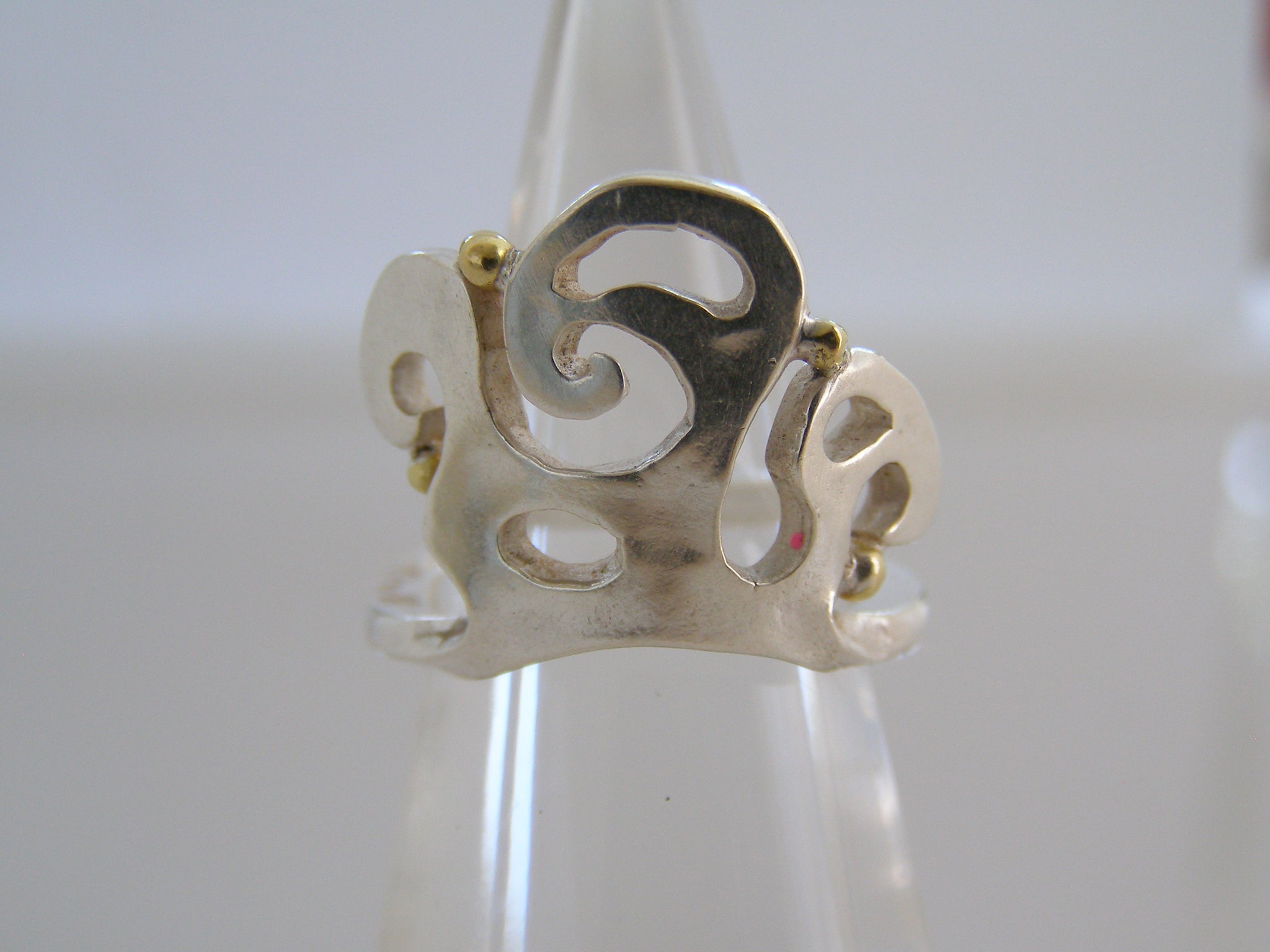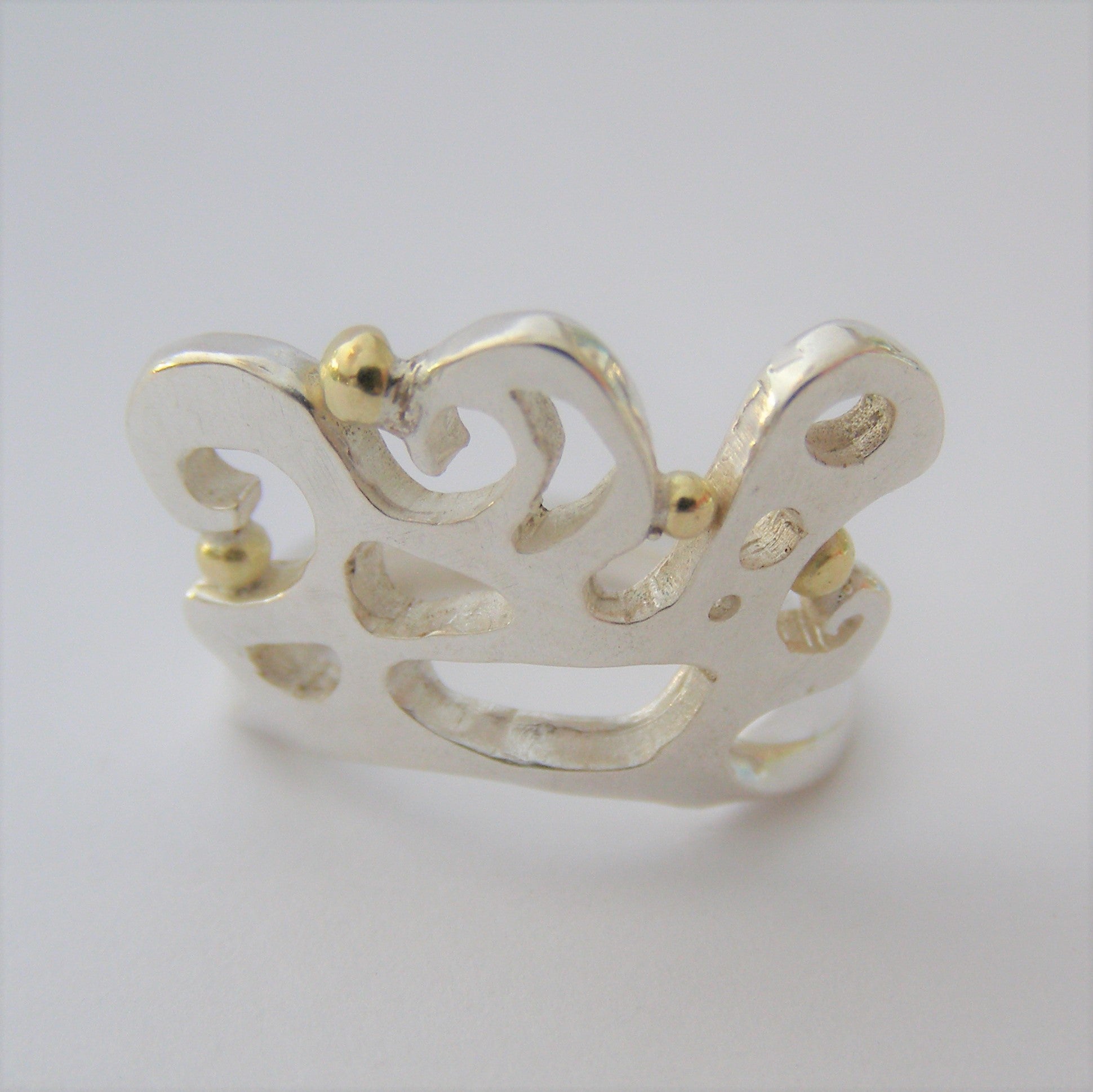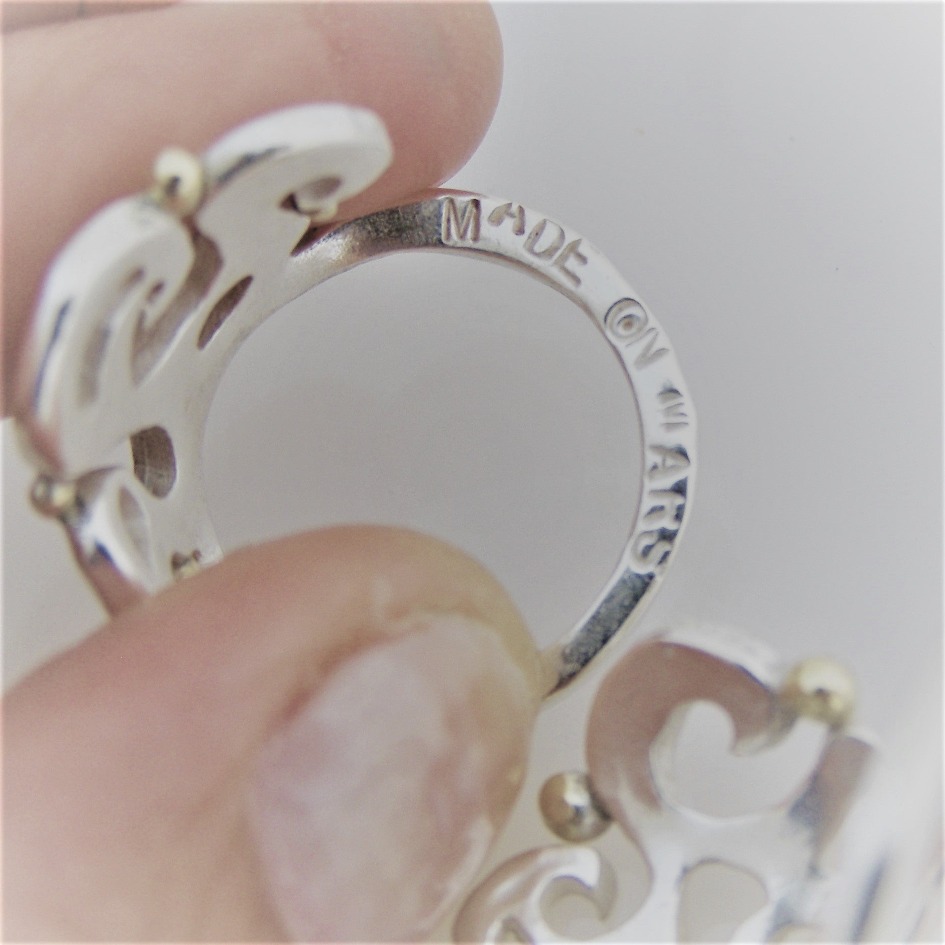 This sculptural ring is hard to describe- I cut it out of 2mm thick sterling silver sheet Then hammered “Made On Mars ” on the side of the band, accented with 18k gold balls then folded it up like a sort of tiara.