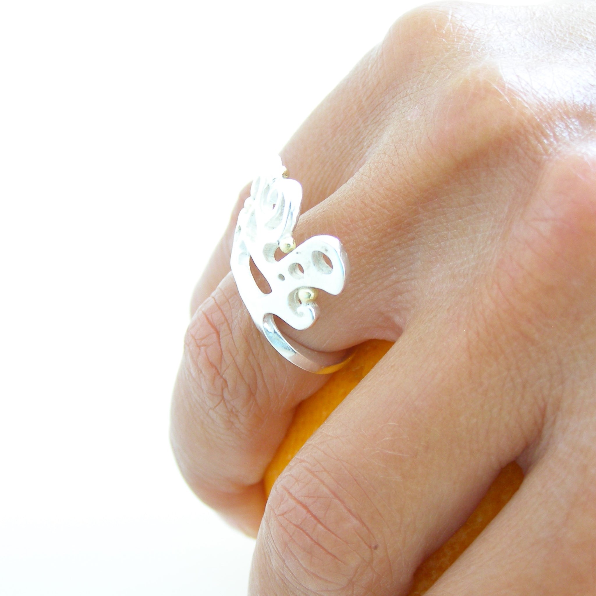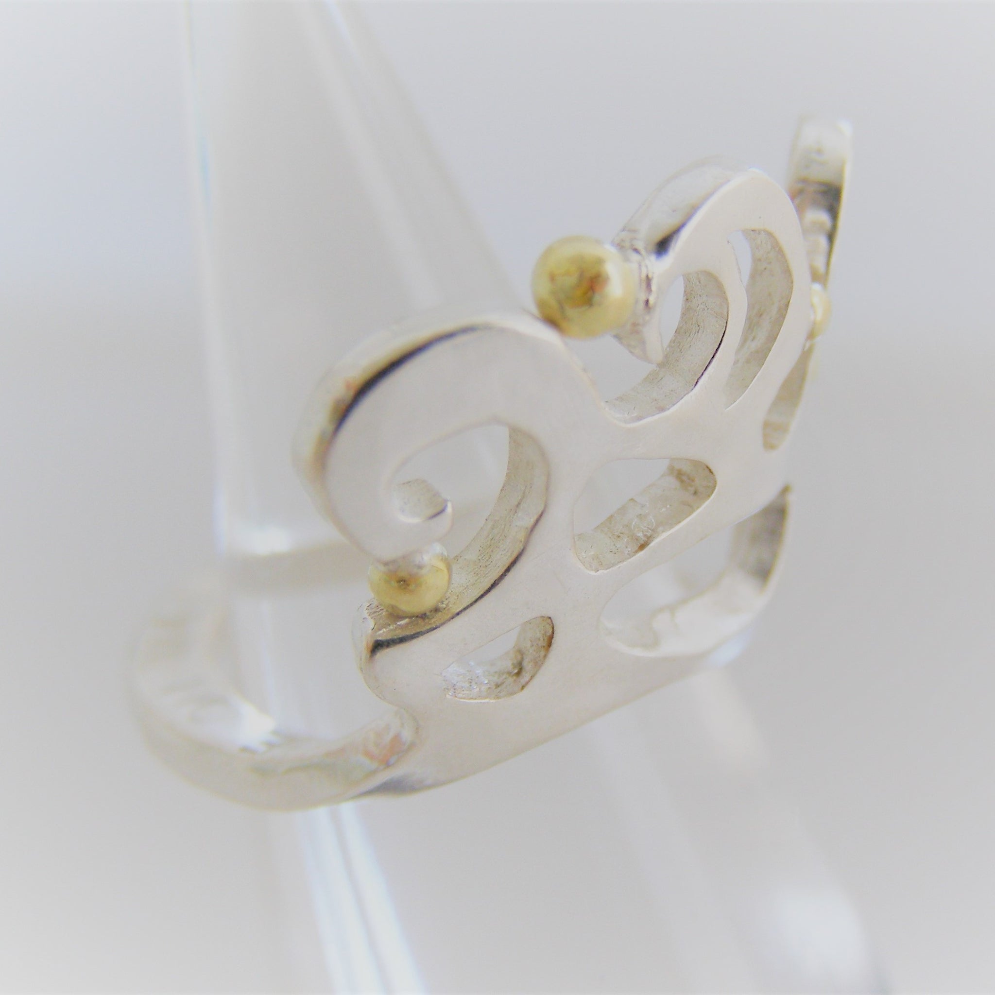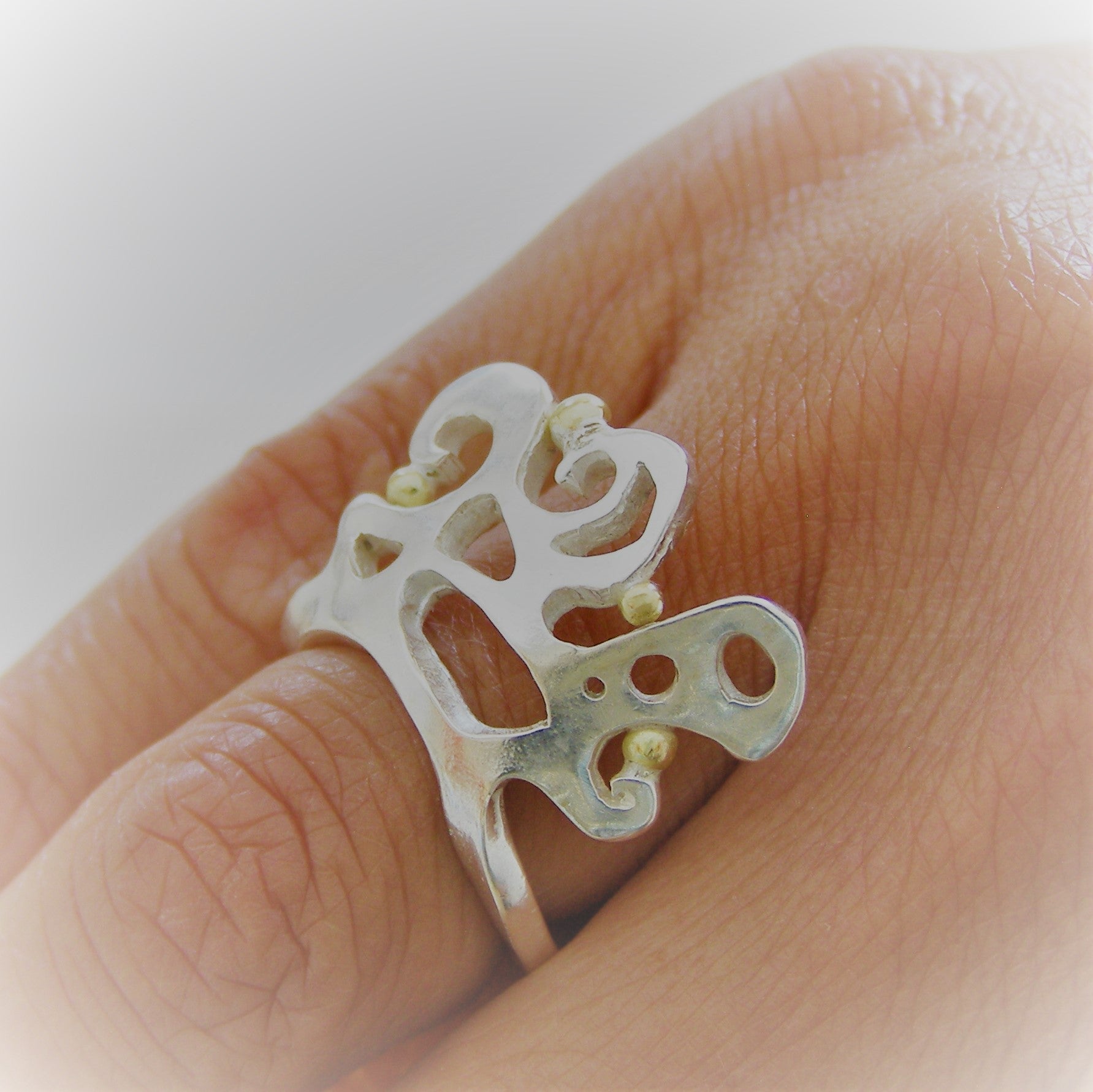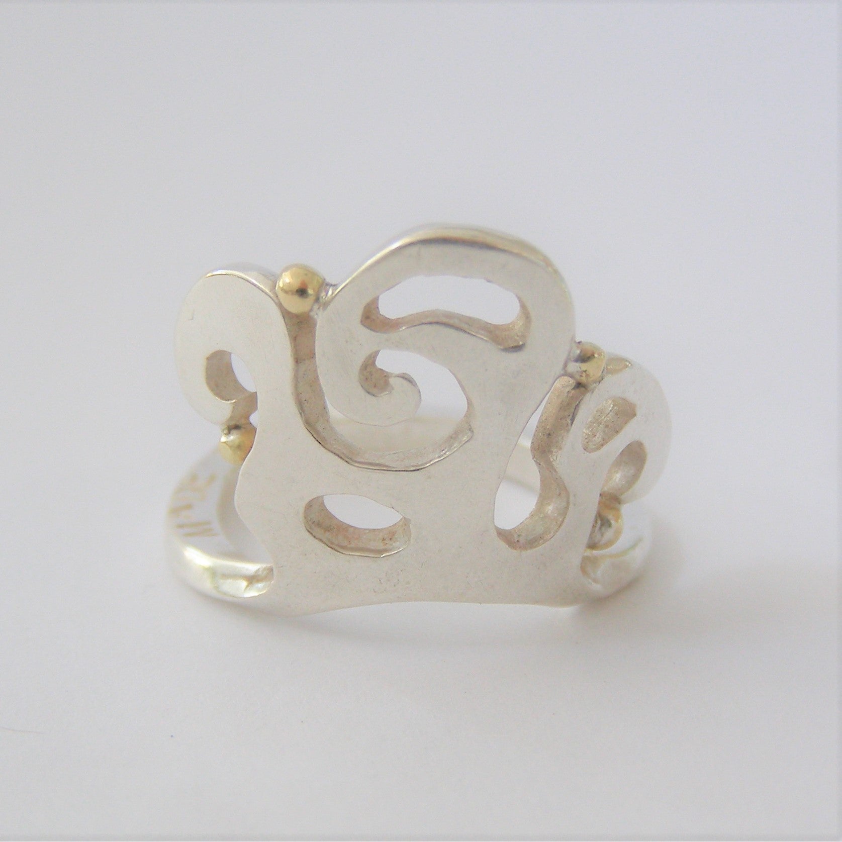 This sculptural ring is hard to describe- I cut it out of 2mm thick sterling silver sheet Then hammered “Made On Mars ” on the side of the band, accented with 18k gold balls then folded it up like a sort of tiara.