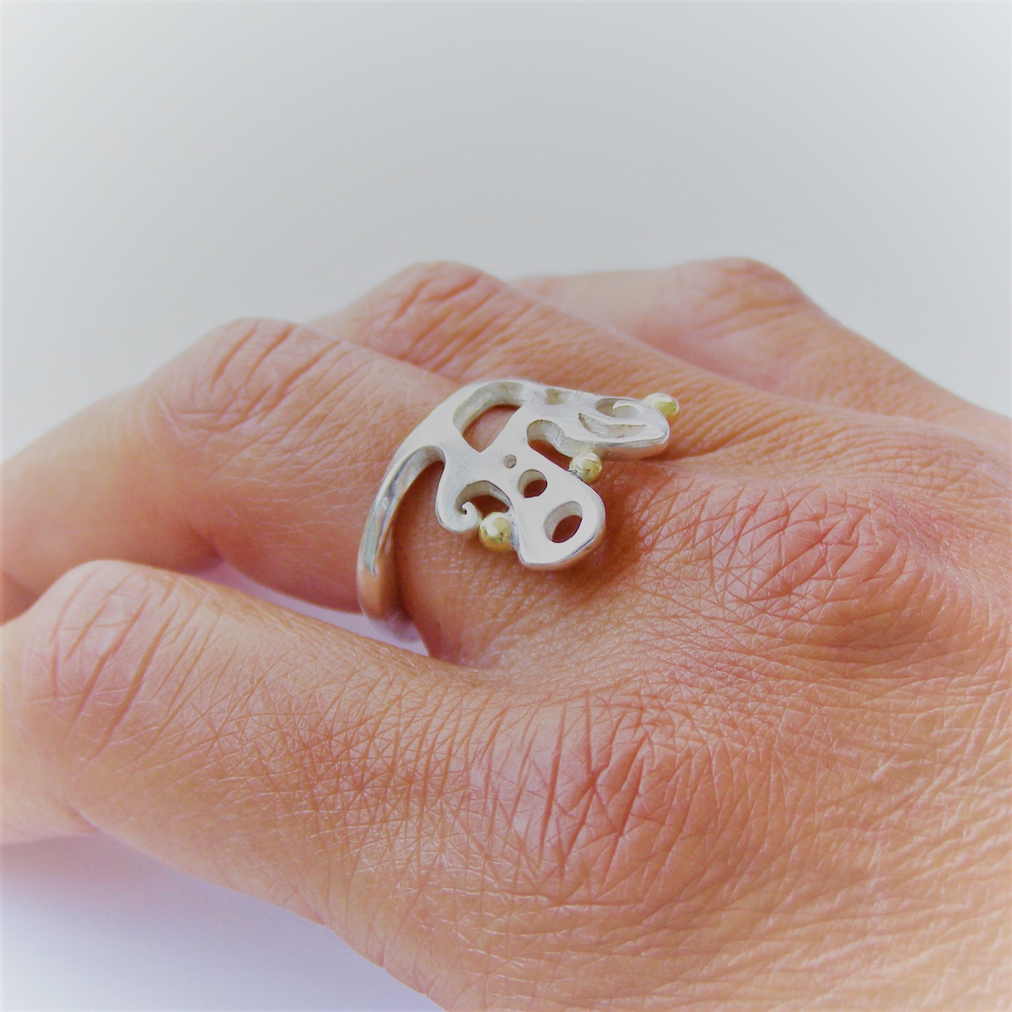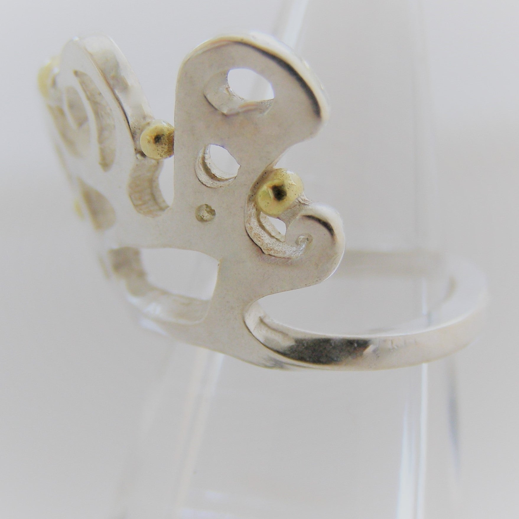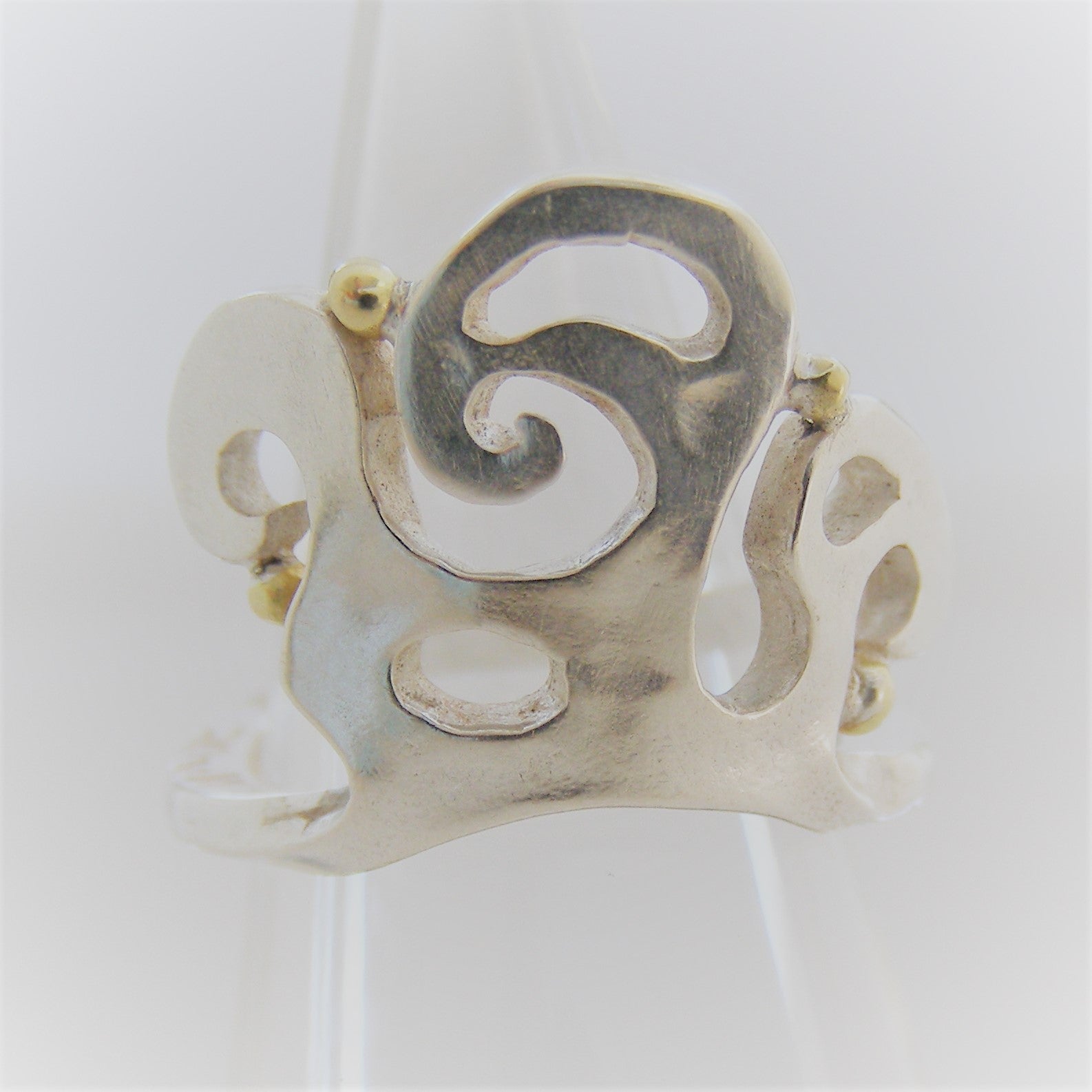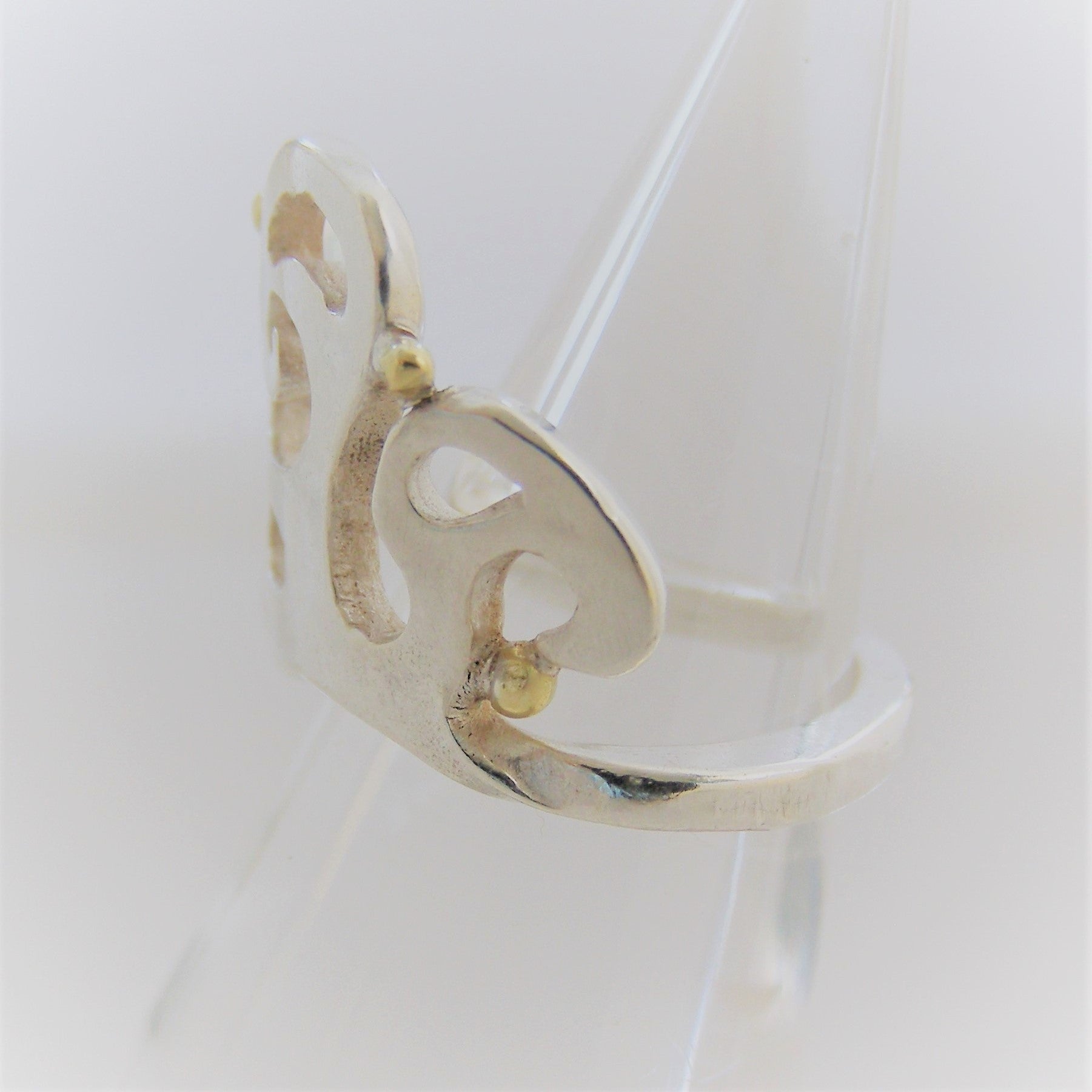 This sculptural ring is hard to describe- I cut it out of 2mm thick sterling silver sheet Then hammered “Made On Mars ” on the side of the band, accented with 18k gold balls then folded it up like a sort of tiara.