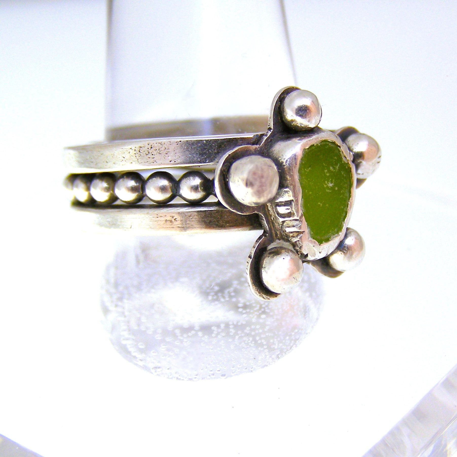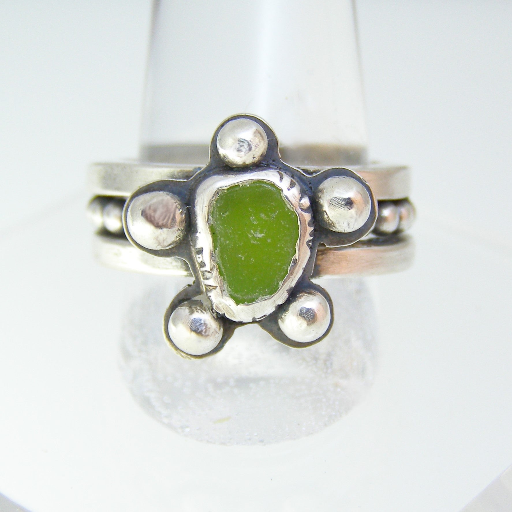 Indulge in the beauty of nature with our Flower Power Sea glass ring. This exquisite piece features a stunning green apple sea glass, lovingly bezel set within 5 silver balls. With a design inspired by a happy flower, this ring is the perfect blend of elegance and whimsy. Own a unique and exclusive piece to add to your collection.