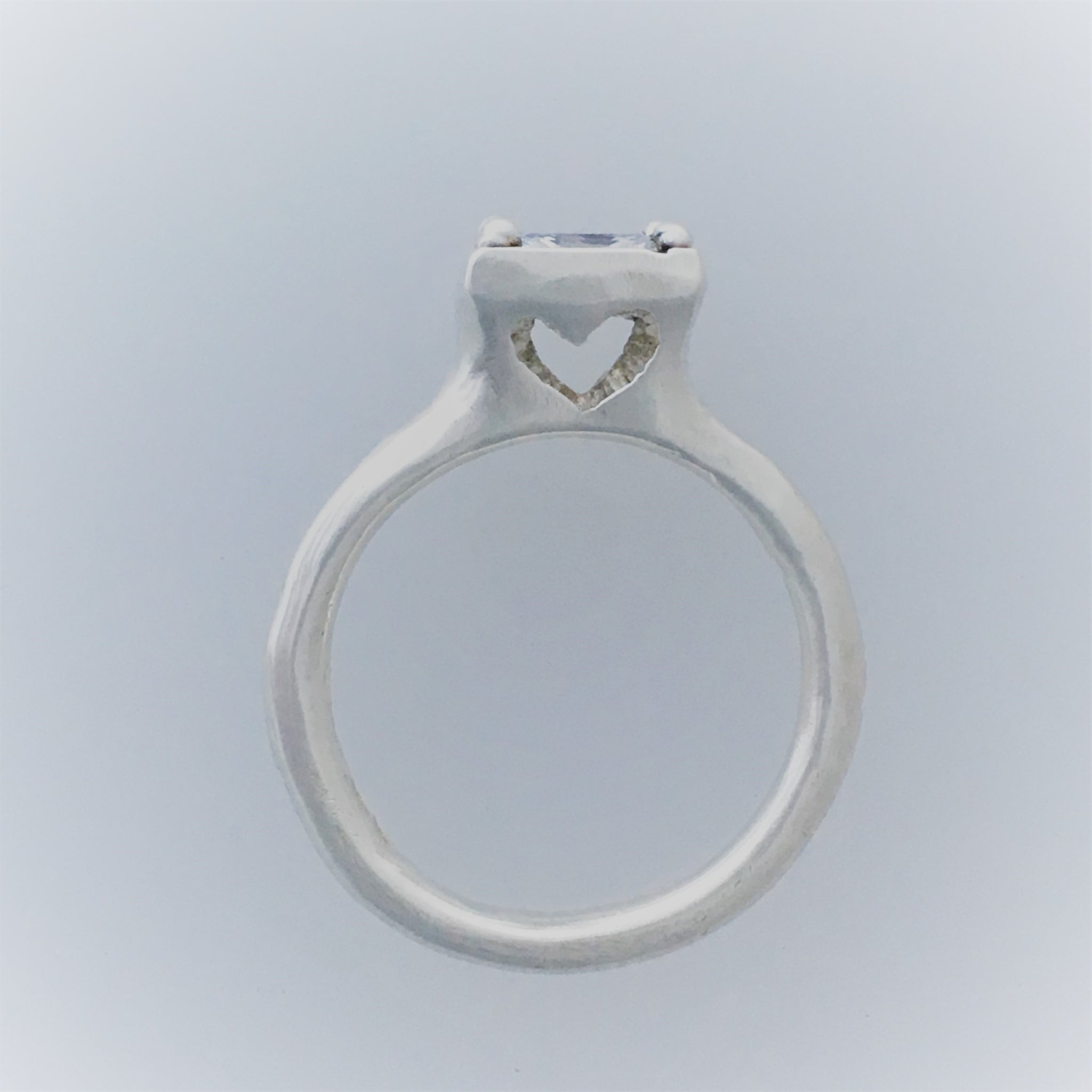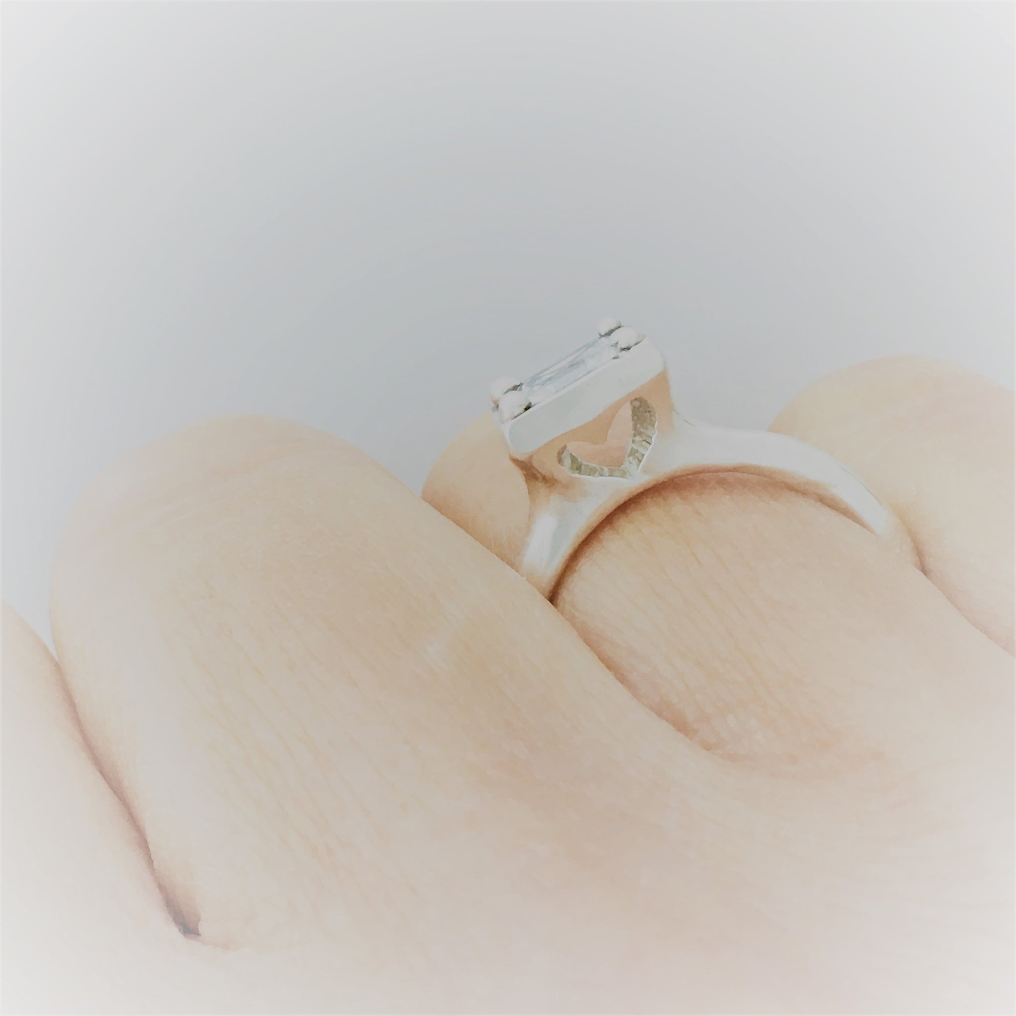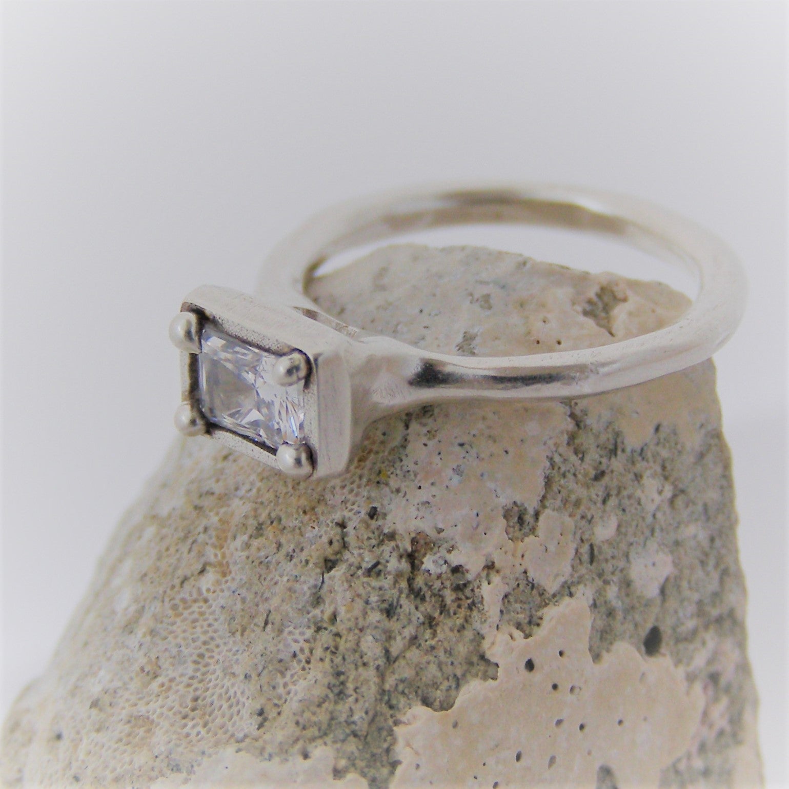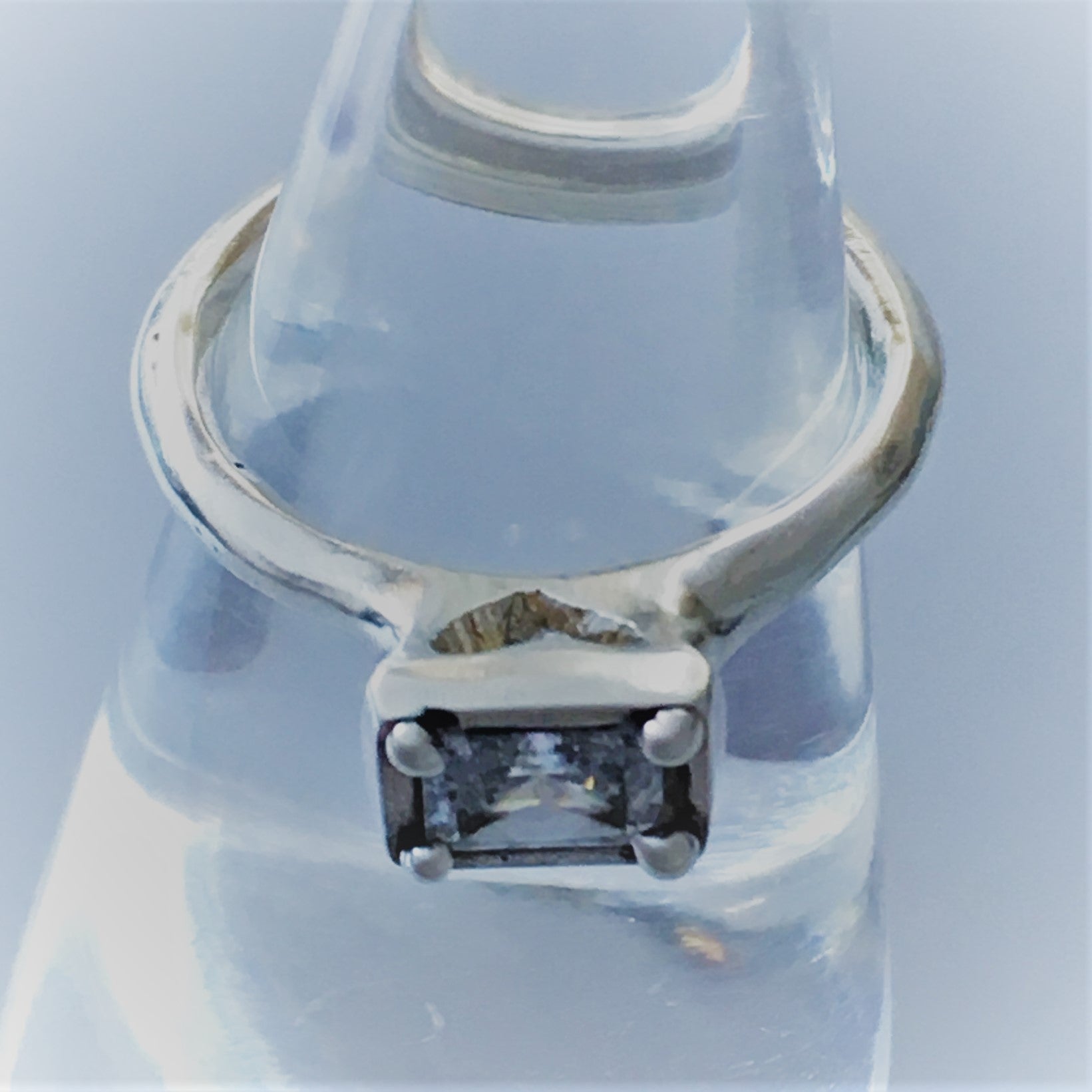 So you are sick of getting hit on? Well slip on this little sparkler and Guido at the gym, or Biff at farmers market, or Hipster bearded geek at the cafe will LEAVE YOU ALONE!!! This beautiful emerald cut faceted cubic zirconium stone set within a rectangular silver frame and sits prominently on a 2mm ring shank.