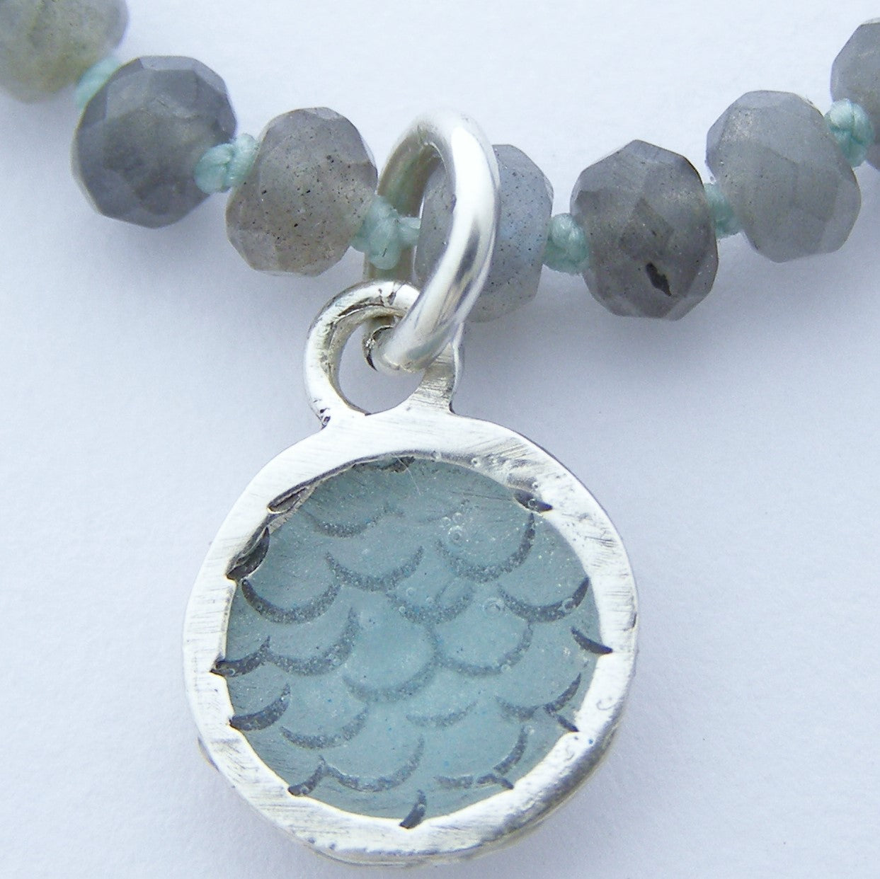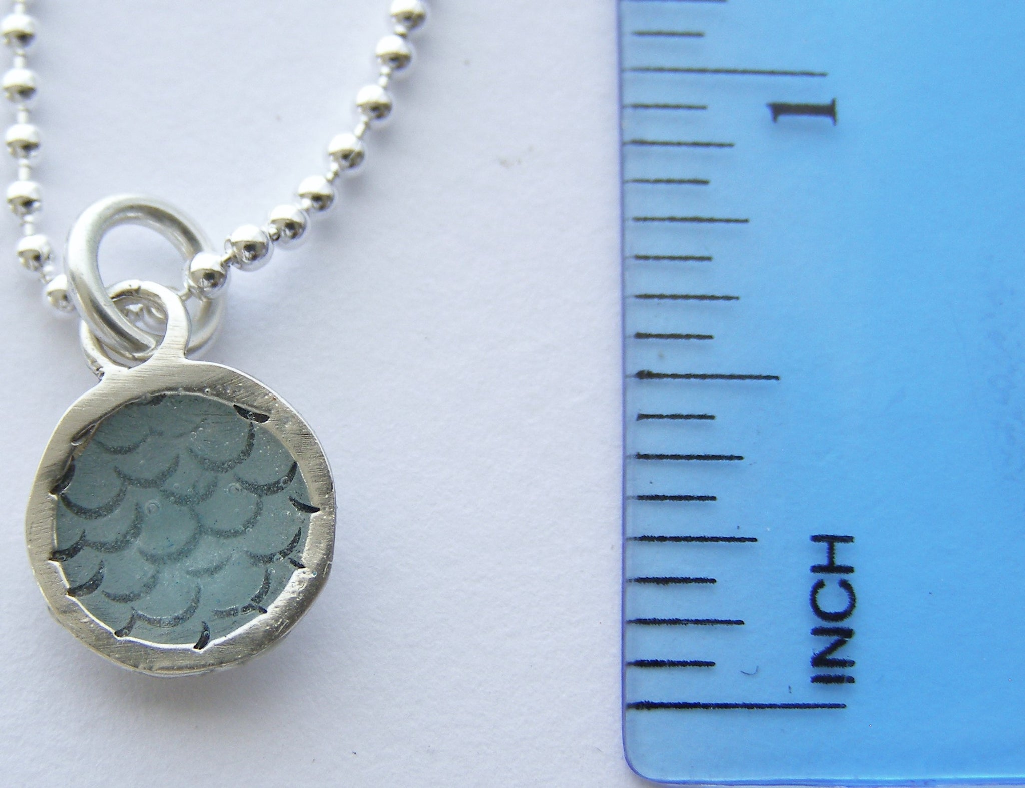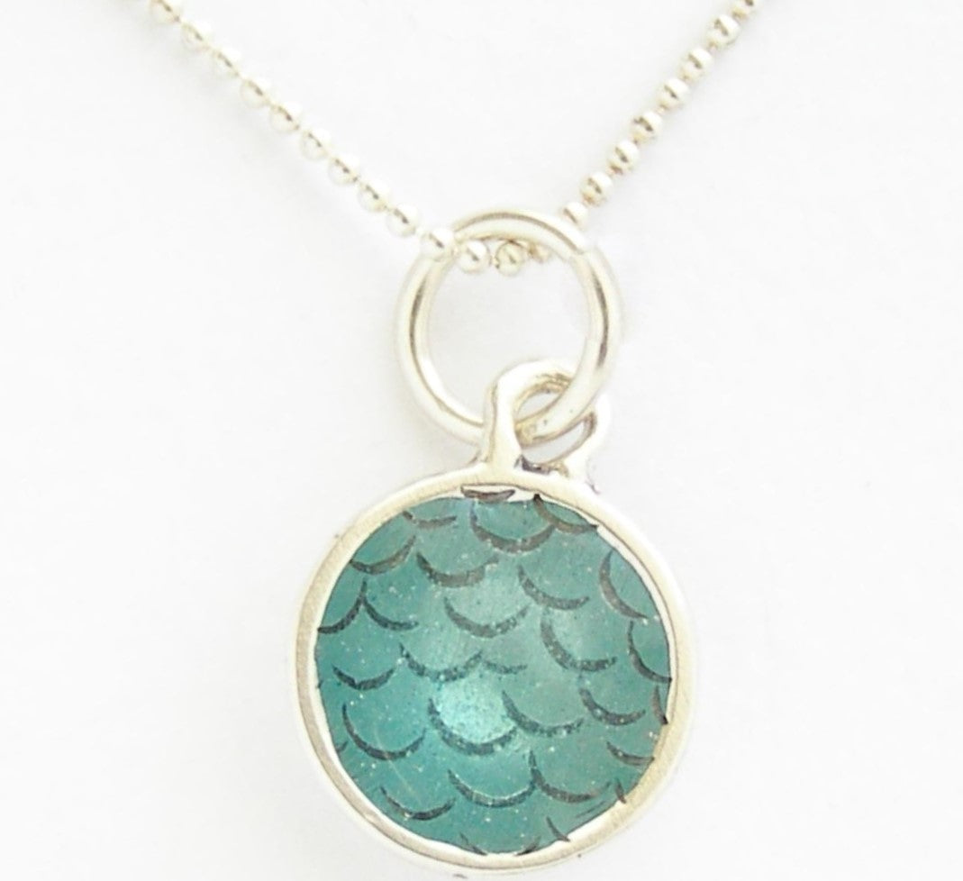Sterling silver pendant is decorated with scales hammered on the inside of the concave, then tricked out with my favorite color—a watery color of sort. On the backside of the pendant the words, ”Made On Mars” are hammered. This pendant comes on an open jump ring (the silver ring that hangs the pendent on the necklace), so it can hang on most necklaces. For an added cost you can purchase this on a sterling silver ball chain. All Made On Mars Items come packaged in super cute packaging gift ready!!!!