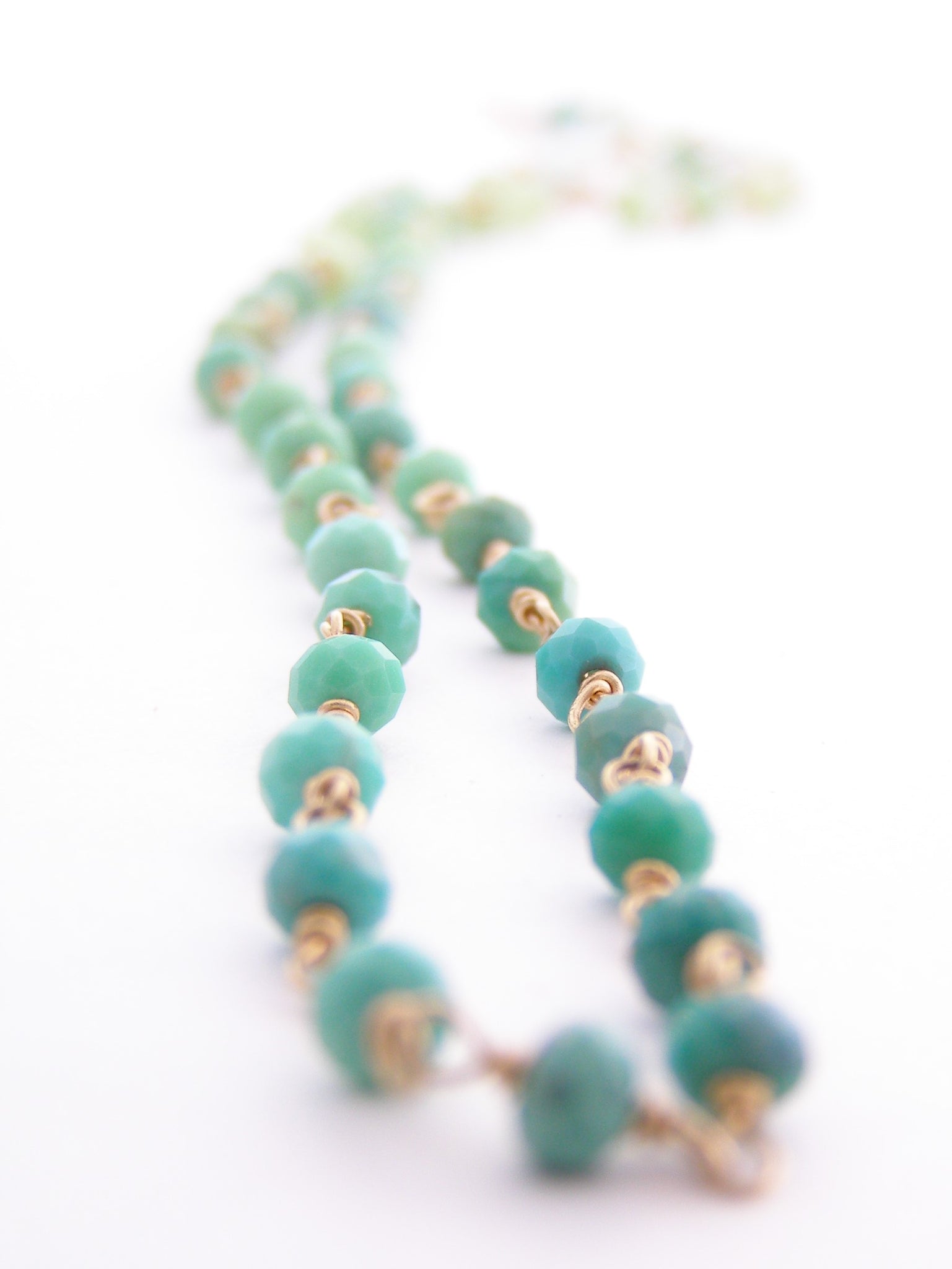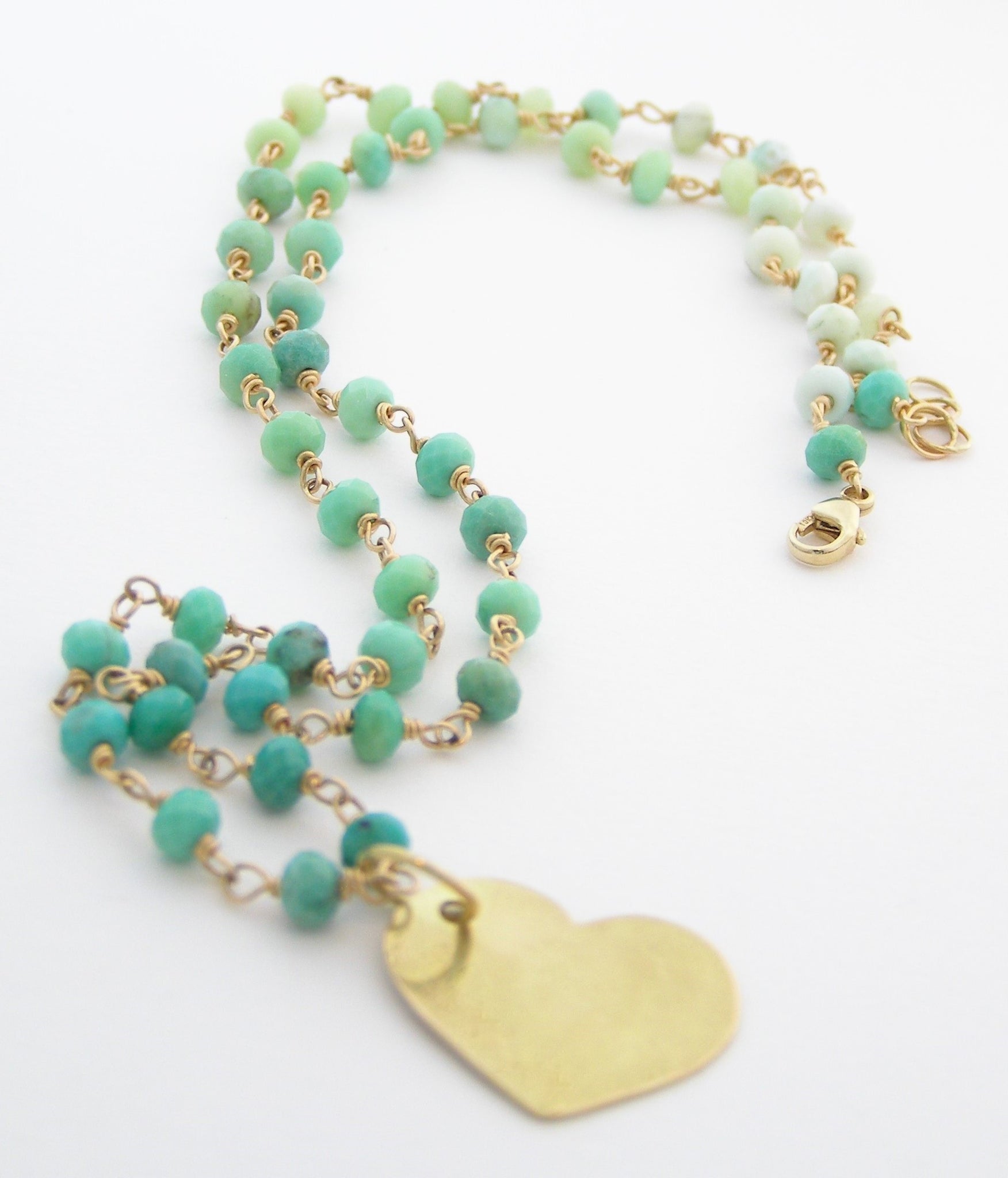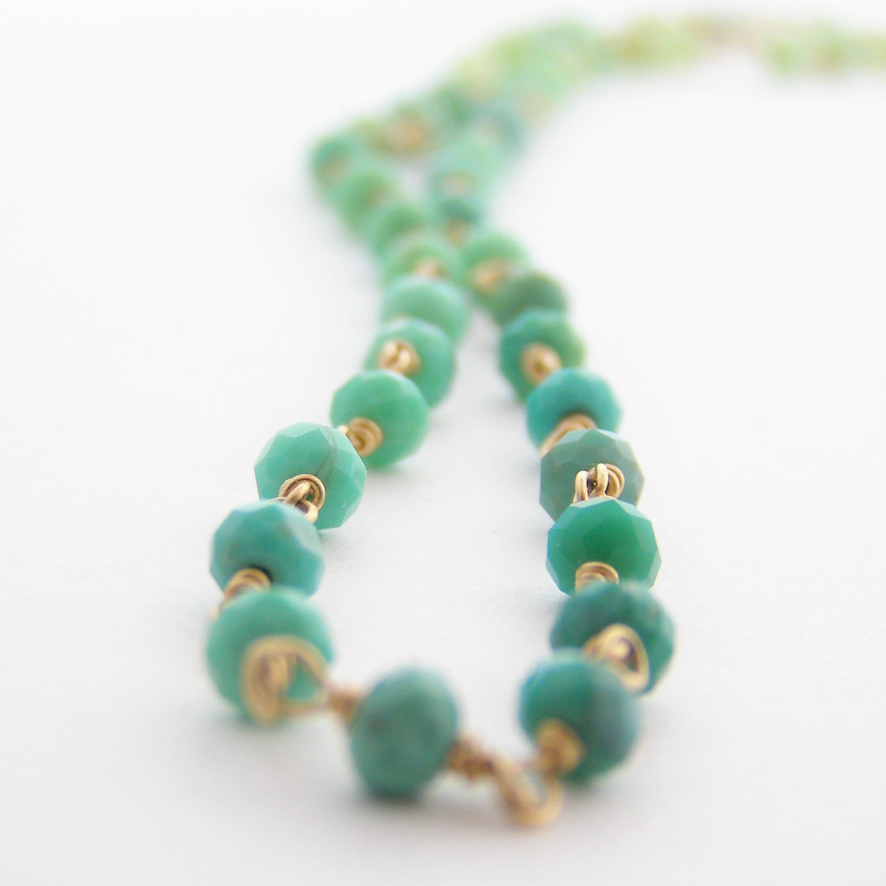 faceted genuine chrysoprase beads are featured delicately  on a 14k gold (not fake, not plate) chain created by wire wrapping each bead. Gradually changing from darker green to a  a vary pale green color this 18-19.5 inch necklace made of chrysoprase a stone that provides daily dose of strength and support when it comes to heartache and aids with staying hopeful. Furthermore, it is said to attract new love. It increases compassion and helps to overcome jealousy.