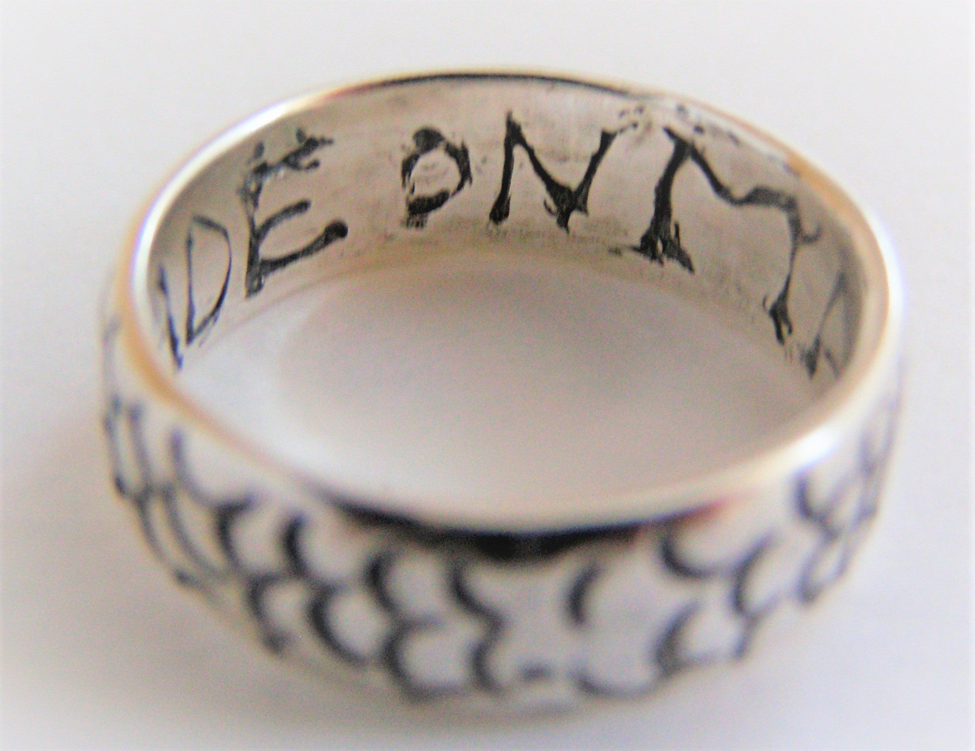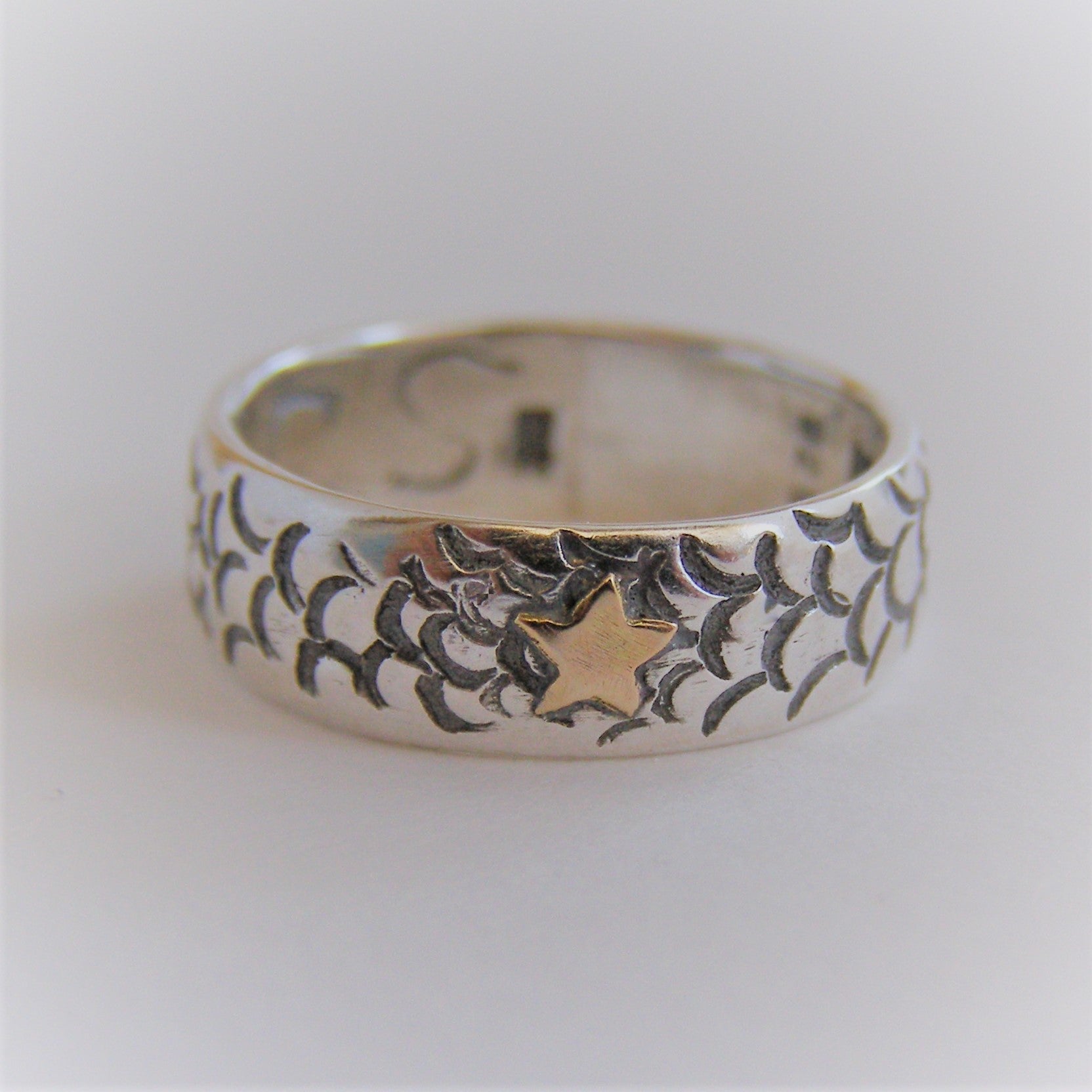 8mm wide Sterling silver ring that has fish scales hand stamped into it , there is an 18k gold star ⭐️ soldered to it. Allow 2 weeks for a custom these are made to order