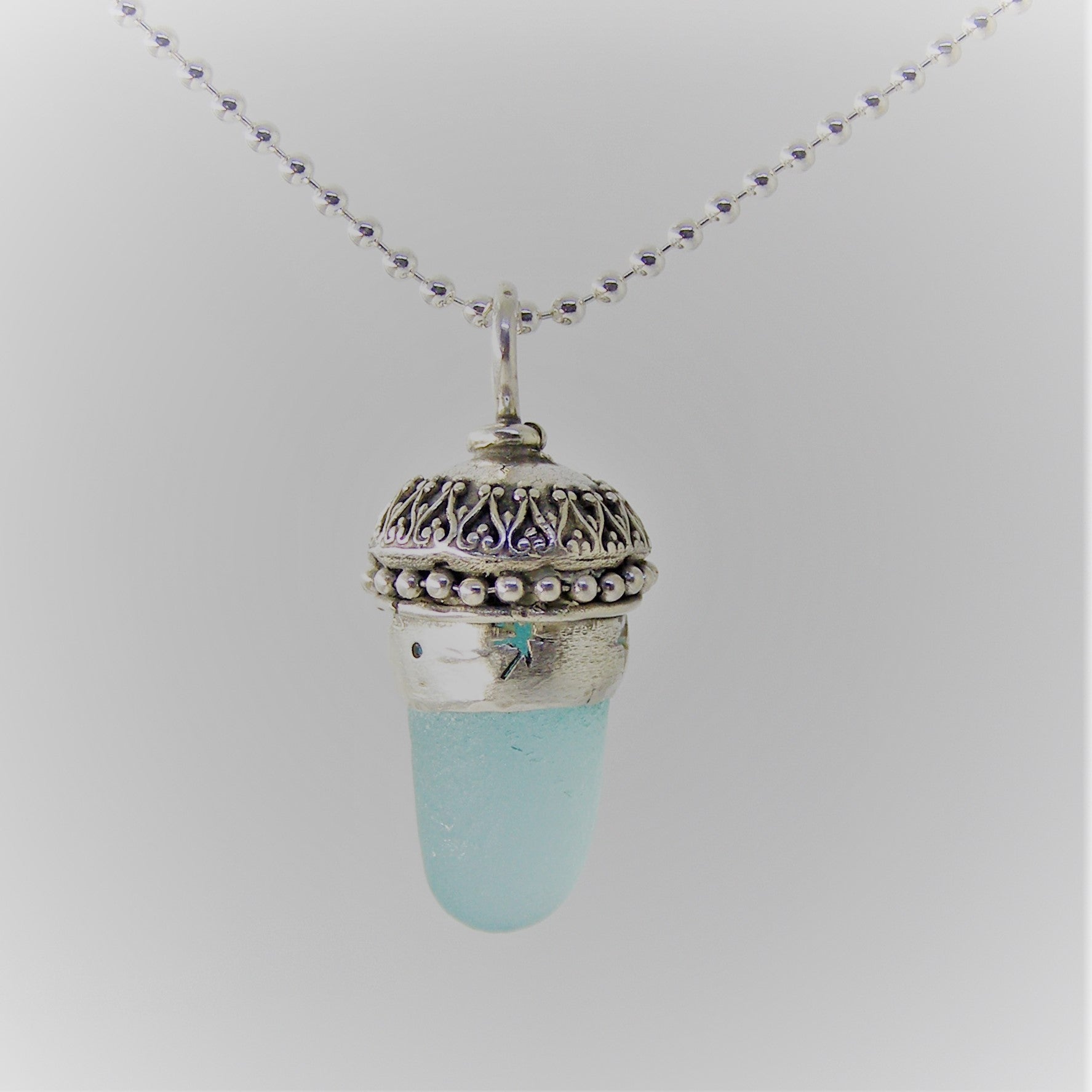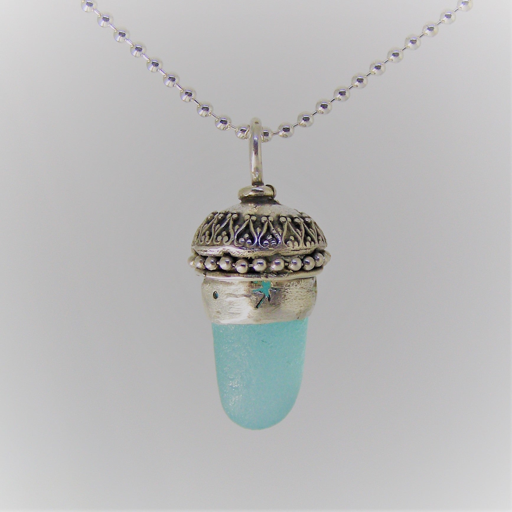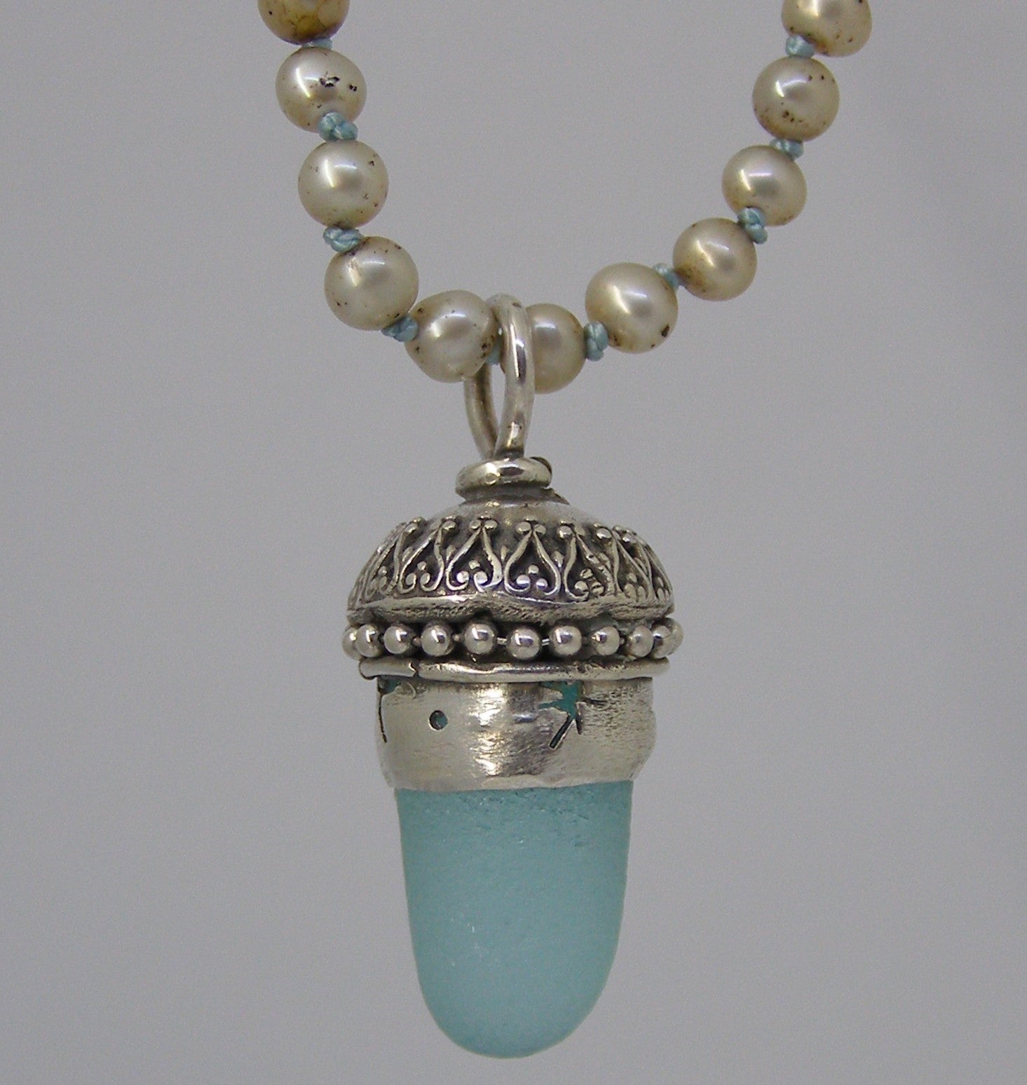 Thank you ocean, sand and time for polishing the dangerous shards of glass into yummy little gems like this one. I created this fancy little ornate acorn . Wear as a necklace or anoint a keychain and look cool. Or wear on one of my hand knotted colorful beaded necklaces.  I like to cut out windows, and decorate the backsides of my pendants. Not boring at all.