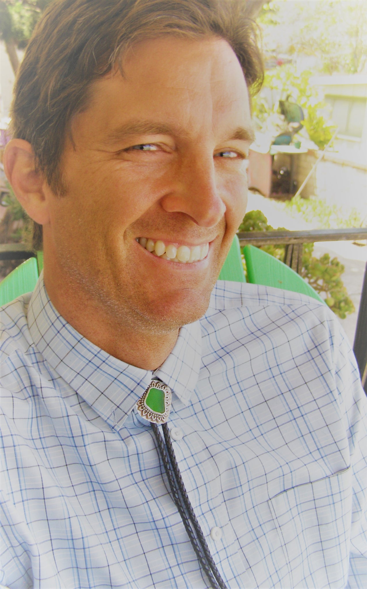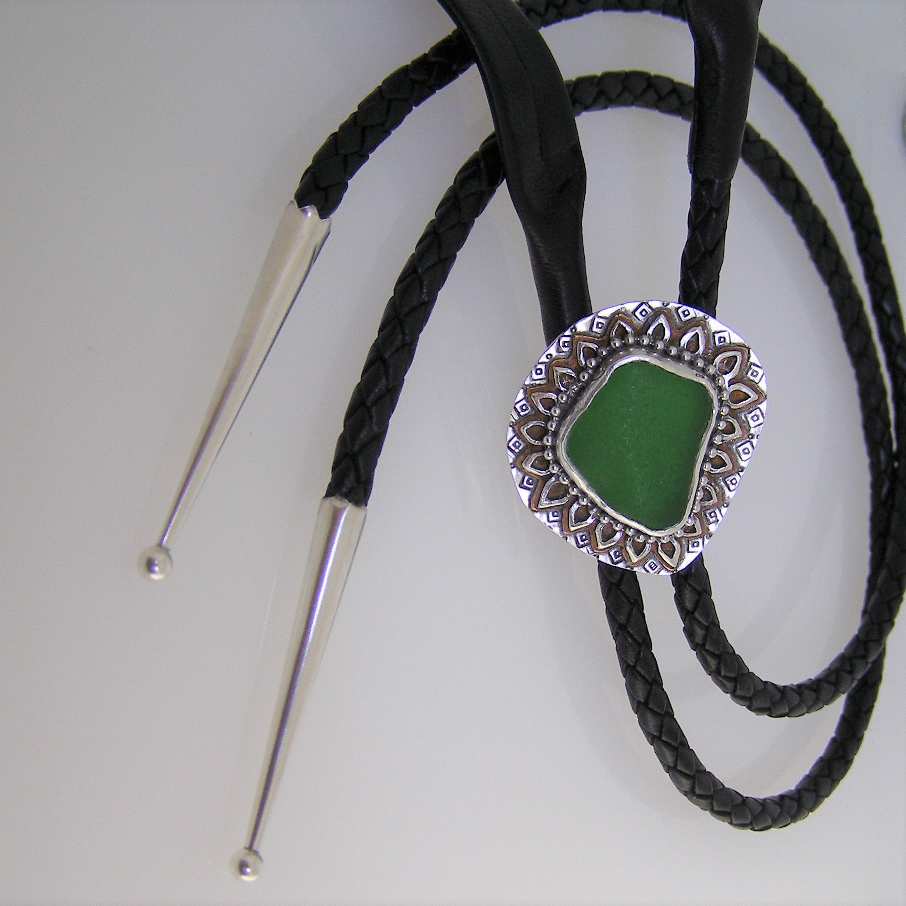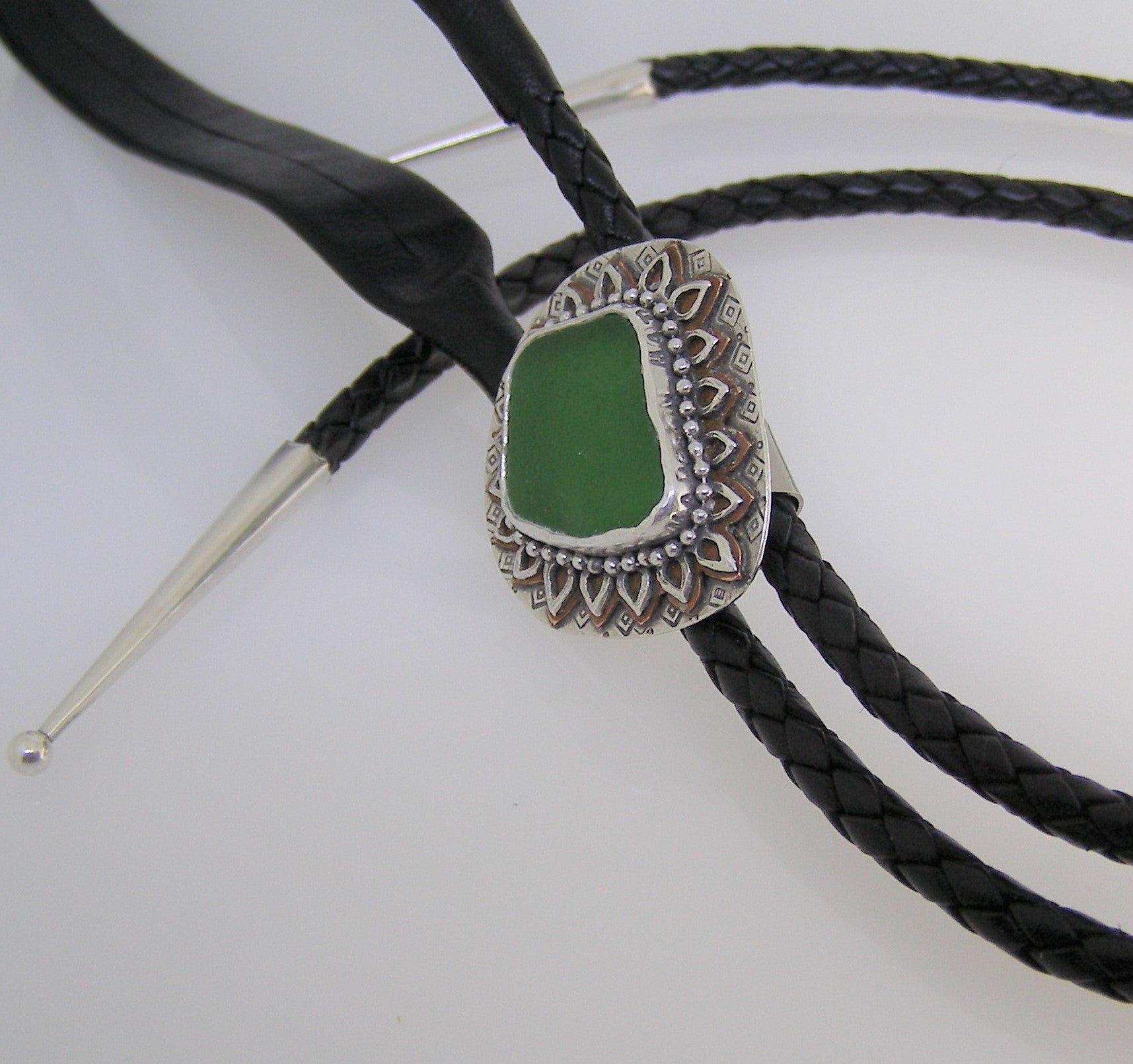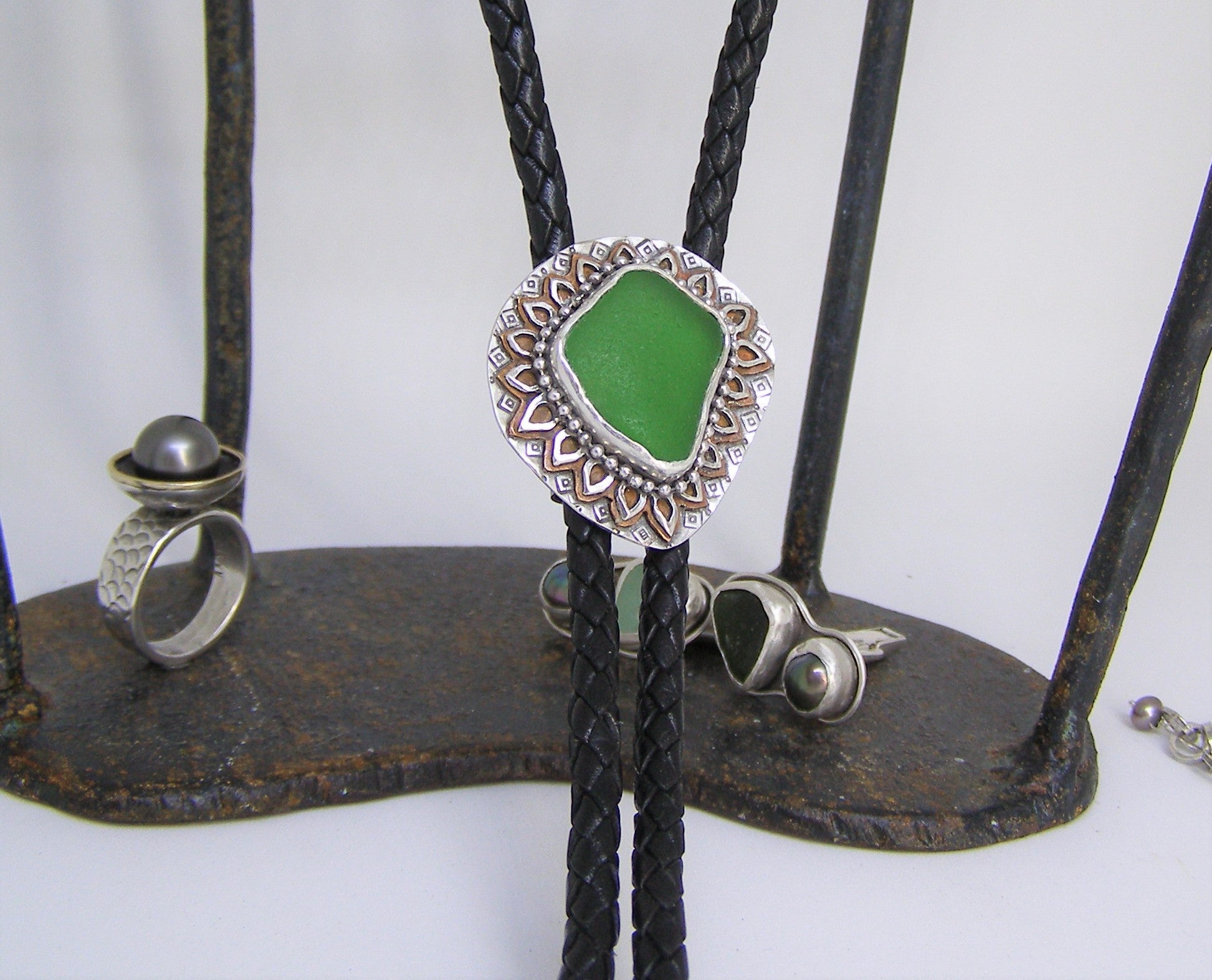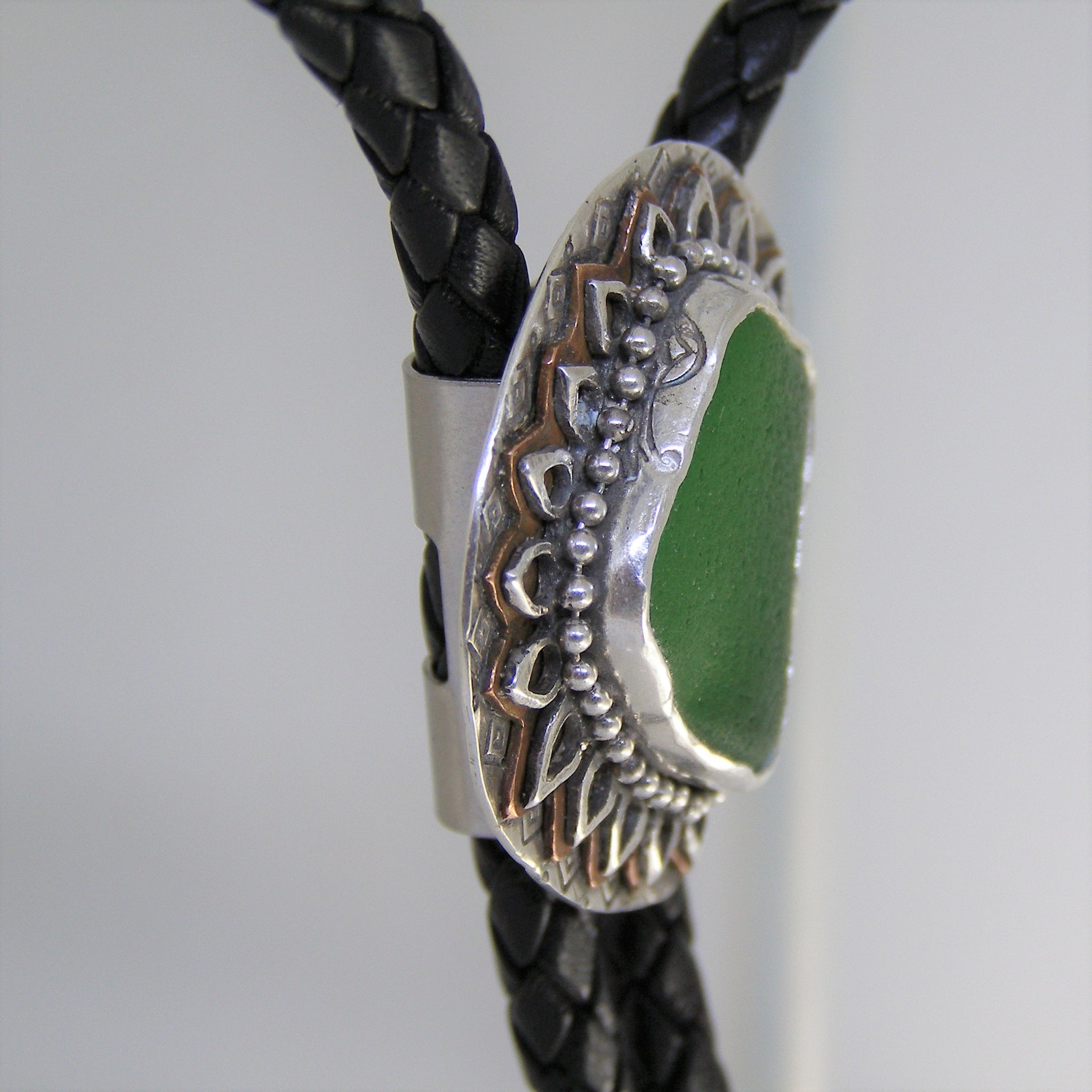 Kelly green sea glass has been bezel set on this sturdy silver and copper bolo tie. The tie is woven leather capped with sterling silver. What more can be said about this but it's a rather handsome addition to my collection.