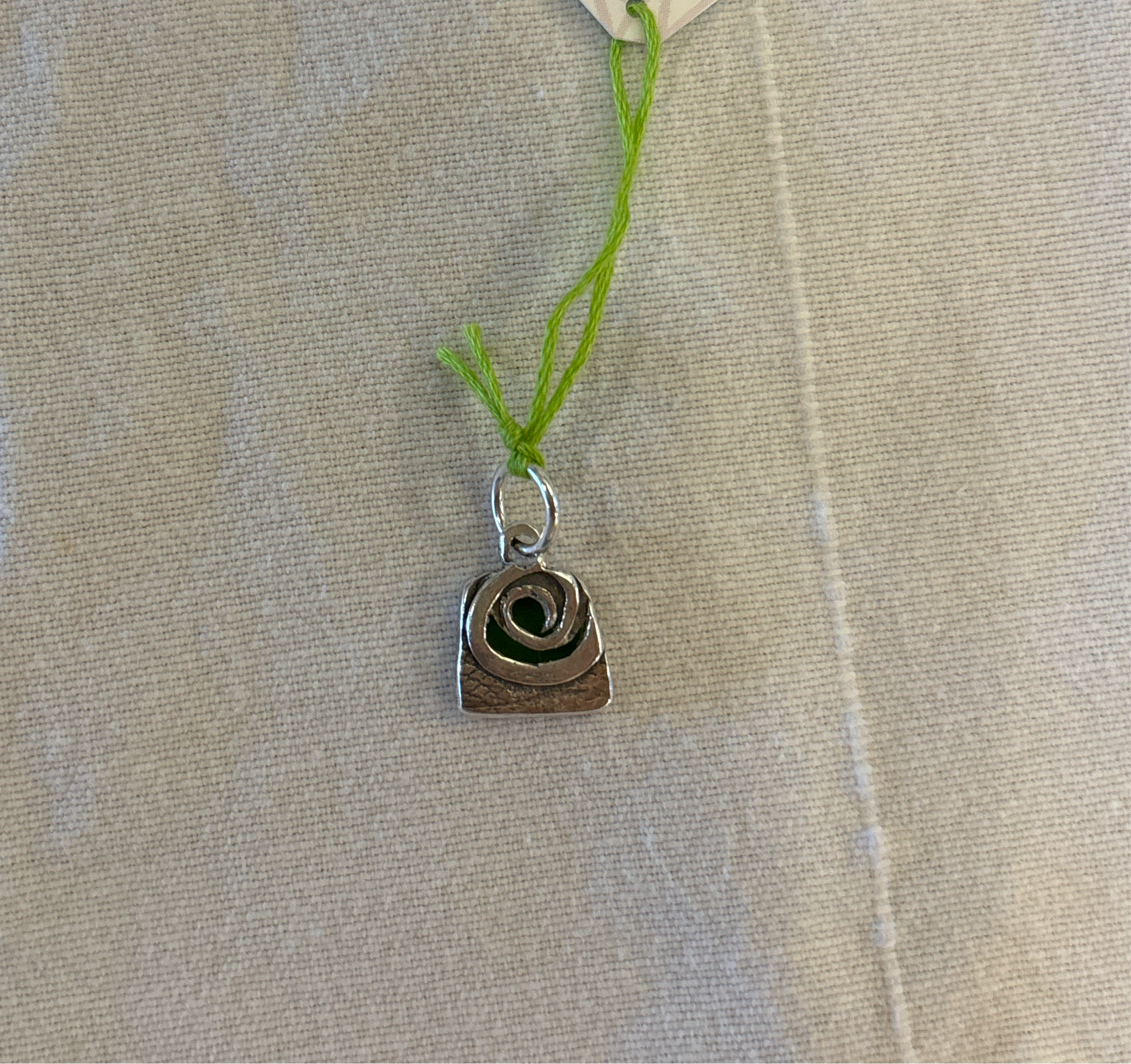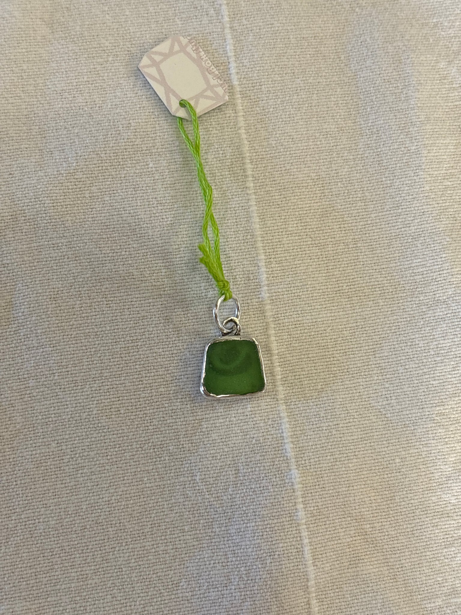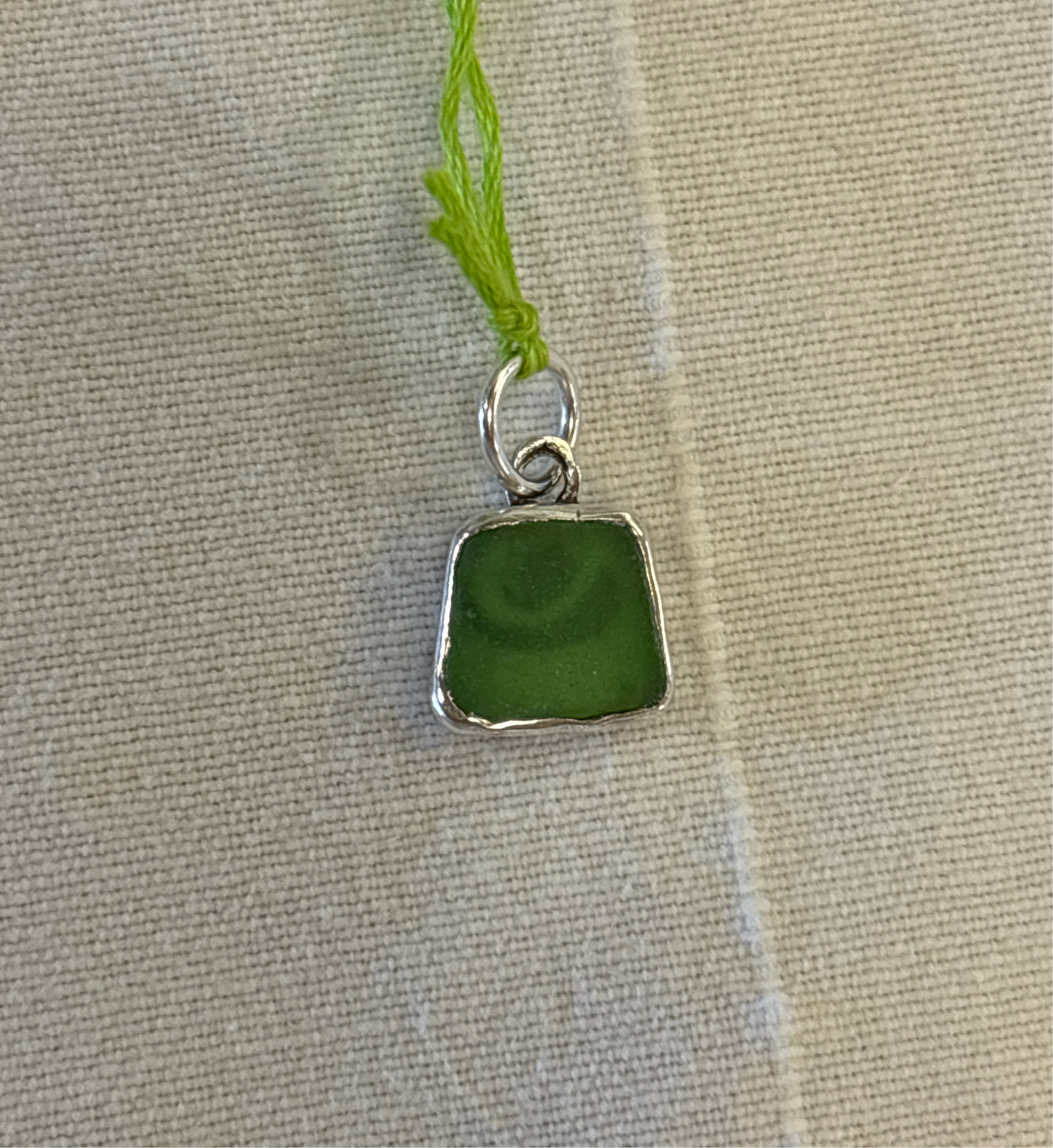 Thank you ocean, sand and time for polishing the dangerous shards of glass into yummy little gems like this one. Wear as a necklace or anoint a keychain and look kool. Or wear on one of my hand knotted colorful beaded necklaces. I like to cut out windows, and decorate the backsides of my pendants. Not boring at all.