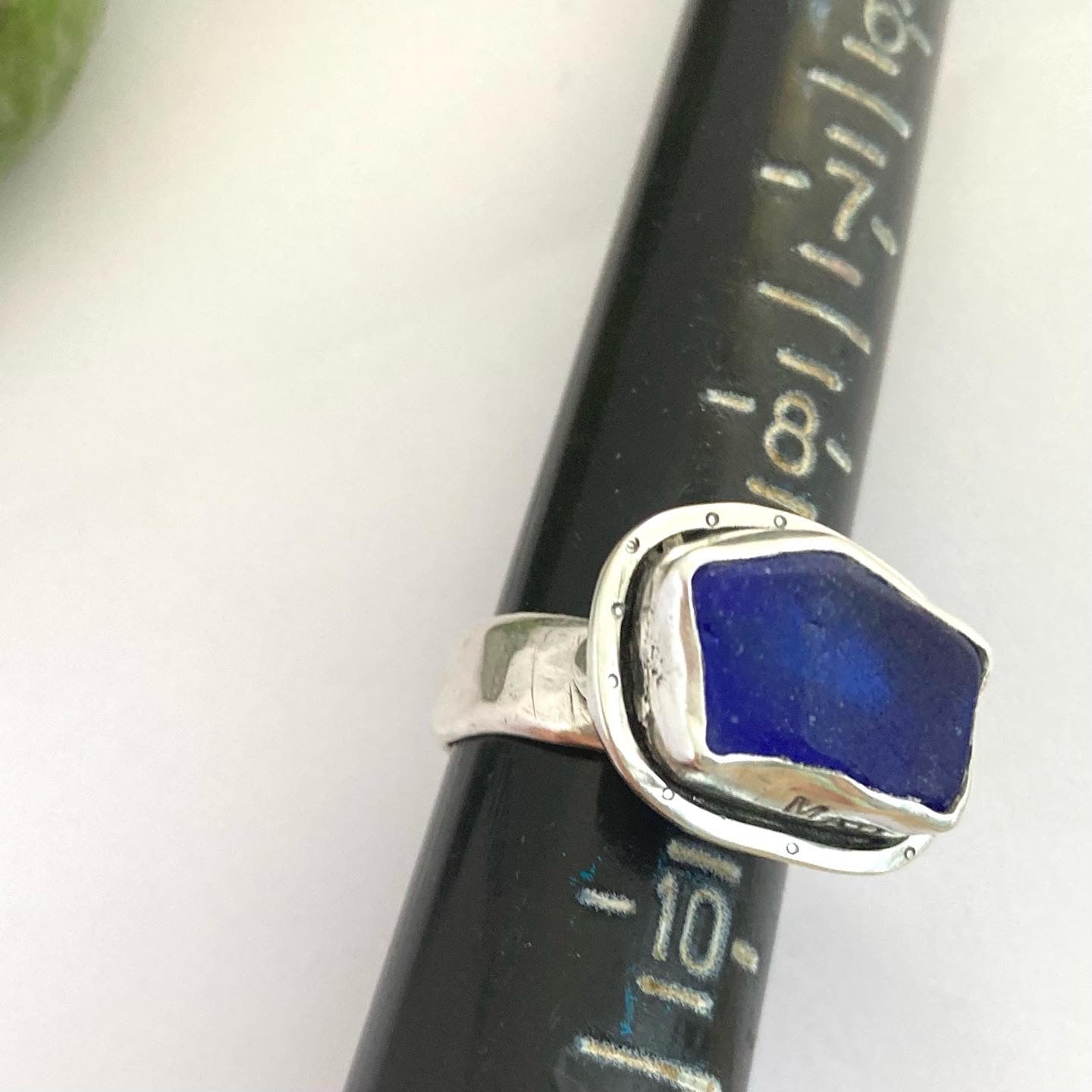 Cobalt Blue glass is bezel set and sits on 2 legs on a square ring shank,